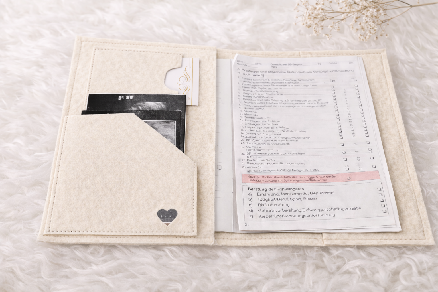 Die hochwertige Mutterpasshülle Filz schützt deinen Mutterpass zuverlässig und bietet im Inneren zusätzliche Fächer für Ultraschallbilder und die Versichertenkarte. So hast du bei jedem Arzttermin alles ordentlich verstaut und sofort griffbereit.