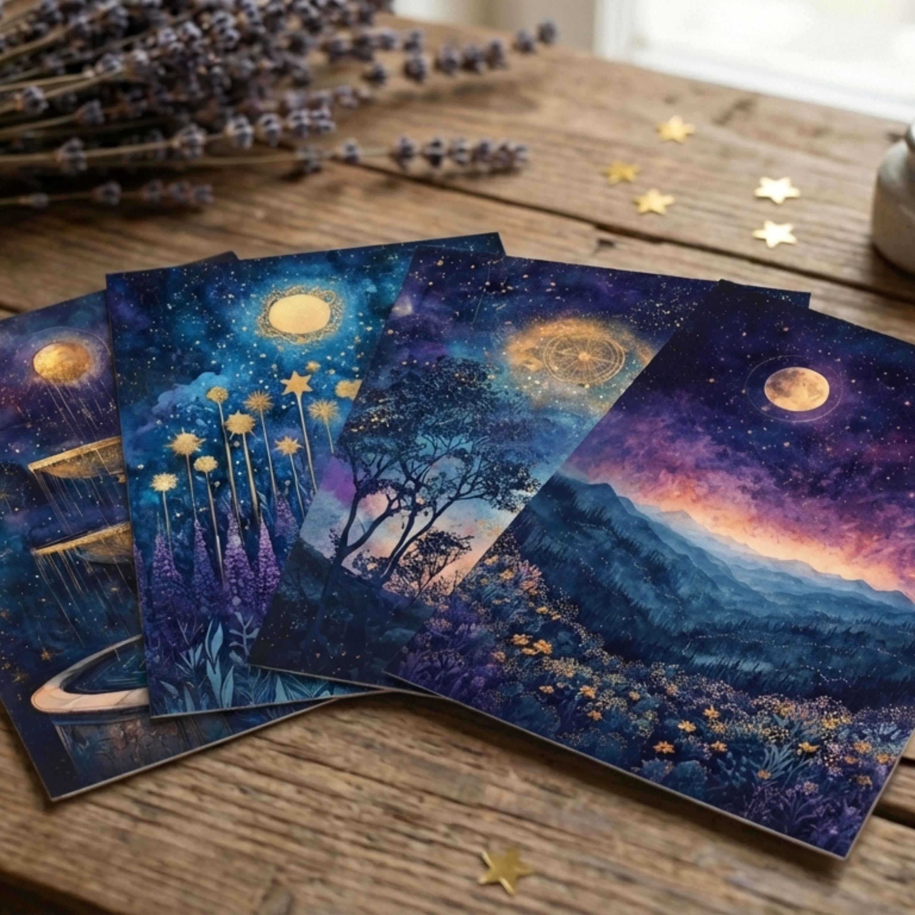 Dieses 4er Mini-Print-Set verbindet Natur, Spiritualität und nächtliche Weite zu einer harmonischen Bildserie – perfekt für alle, die Mondkunst, Sternenhimmel und mystische Atmosphäre lieben.