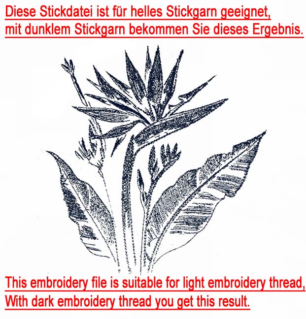 Für realistische Stickdateien sind deutlich mehr Stiche als gewöhnlich nötig, damit sie ein schönes und detailreiches Ergebnis erhalten. Mit einem dickeren Garn und einer dickeren Nadel kann das Ergebnis unscharf und konturlos wirken. Zudem kann der Faden schneller reißen. Die Datei sollte auf einen festen Stoff sowie ein stabiles Stickvlies gestickt werden.
