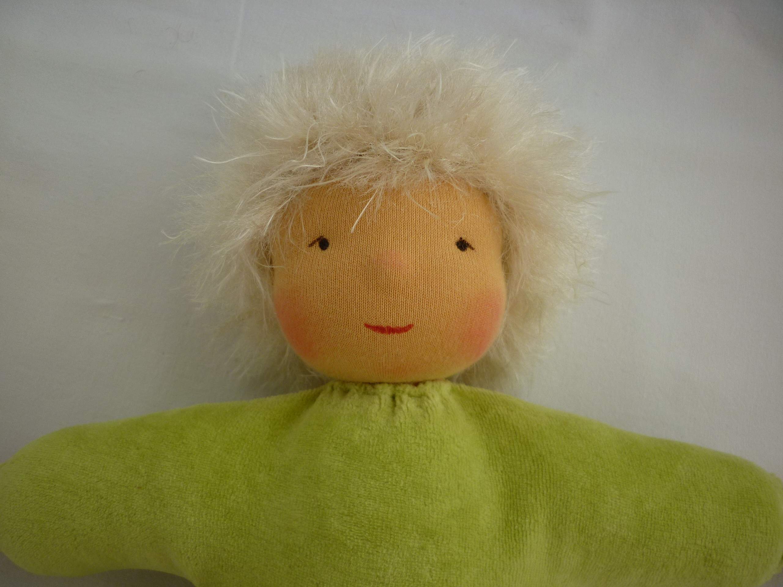 Sollte die Puppe je verschmutzt sein, bitte nur Handwäsche, da sonst die Schafwolle verfilzt.
