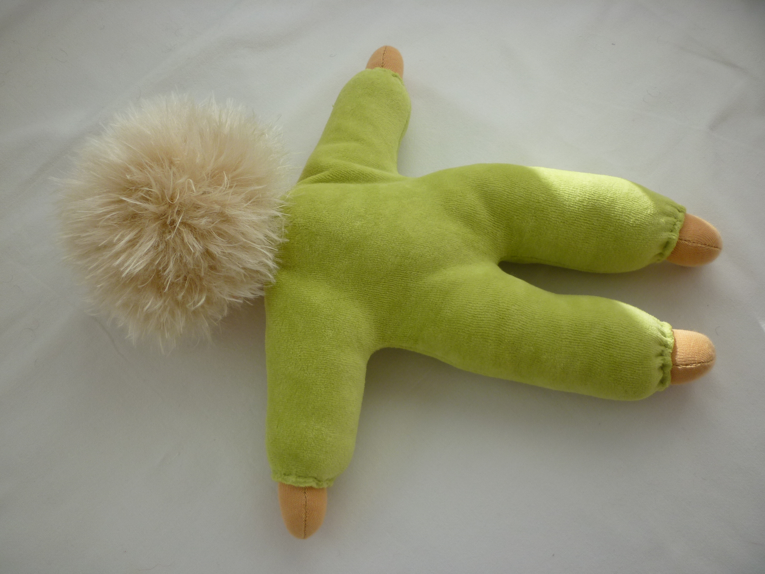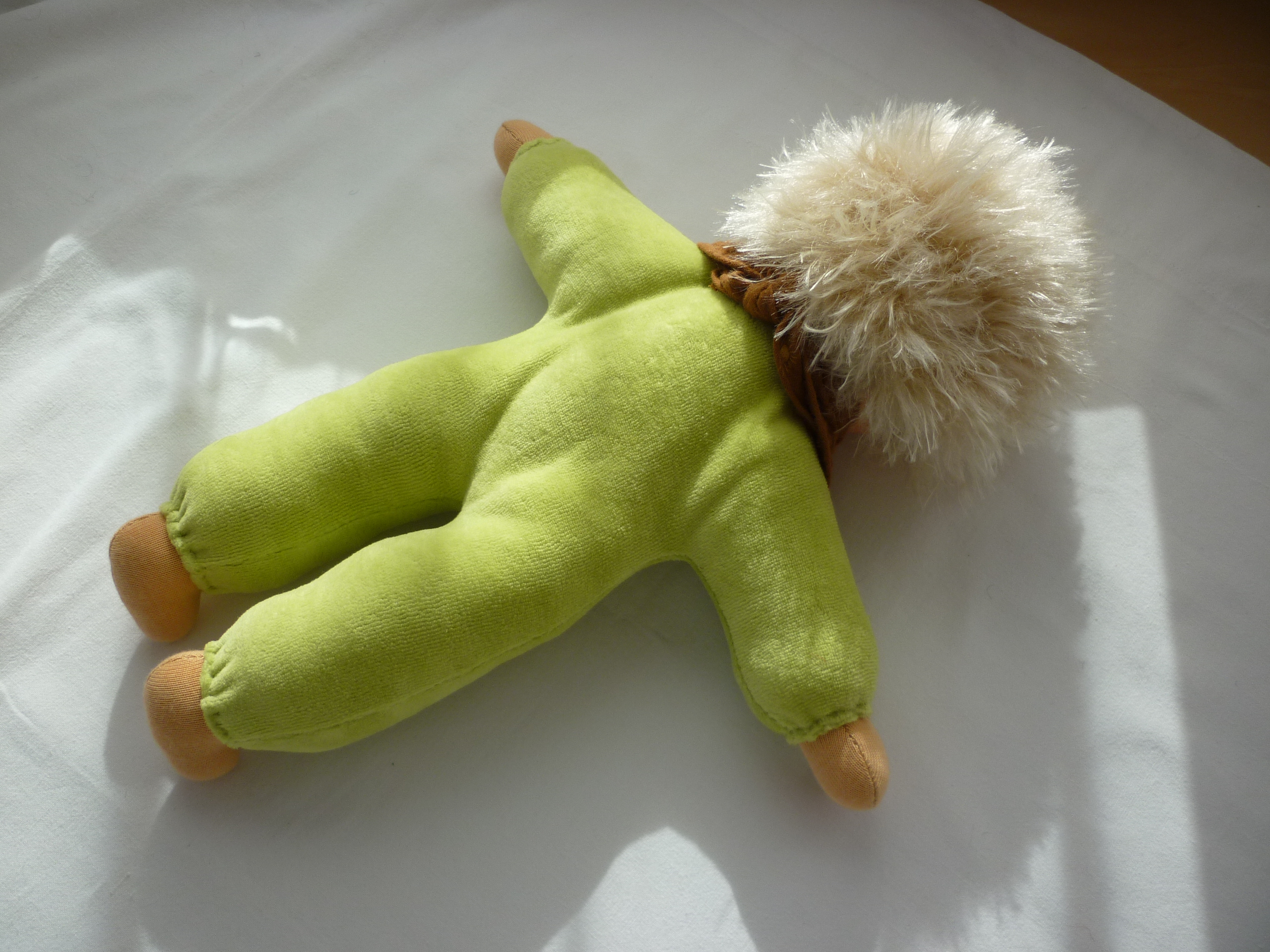 Kopf, Hände und Füße sind aus Schweizer Puppentrikot, mit Schafwolle gefüllt, der Körper ist aus grünem Nickistoff genäht und mit Schafwolle mittelfest gefüllt. Für die Haare habe ich aus "Fake-Fell"-Garn (97% Rayon, 3% Polyamid) eine Perücke gehäkelt und auf den Kopf genäht. Die braunen Augen und der Mund sind mit wasserfester Stoffmalfarbe gemalt.