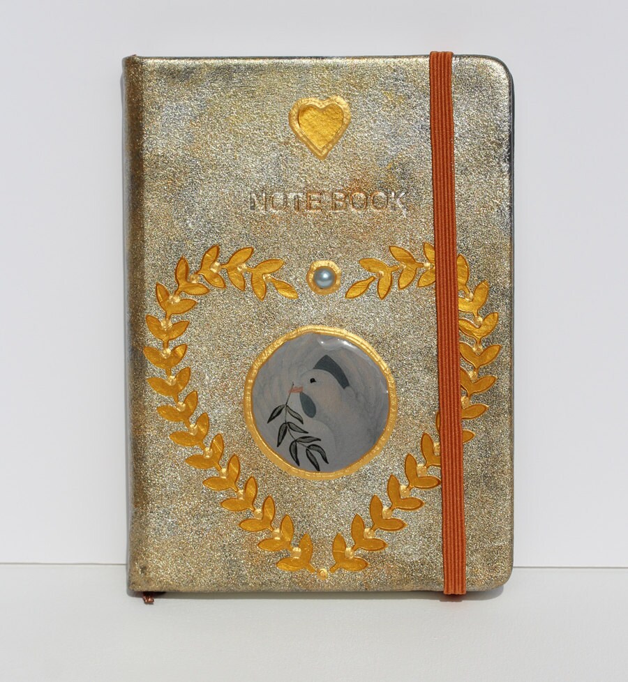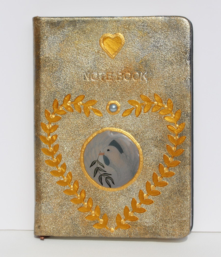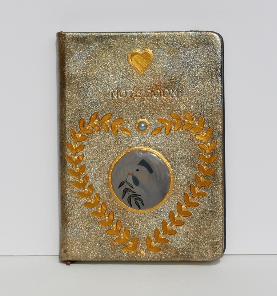 Ein ganz besonders hübscher Platz für Deine Erinnerungen, Notizen, Wünsche und Träume ist dieses handdekorierte Notebook im Design "Peace Dove" mit der anmutigen weissen Taube, mit Liebe handpatiniert in metallisch schimmerndem Hellblau-Silber, verziert mit Perle und schönen Effekten.