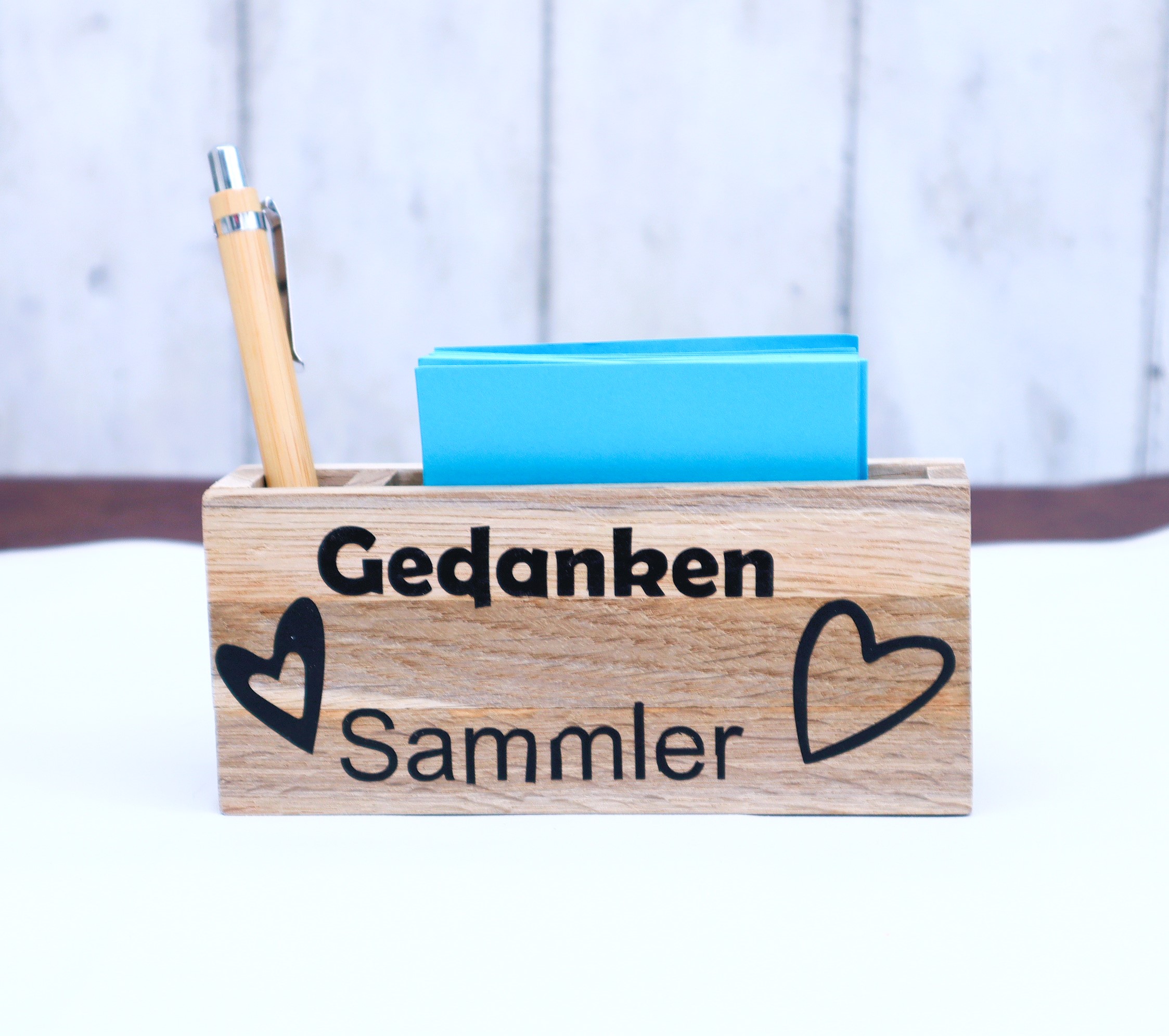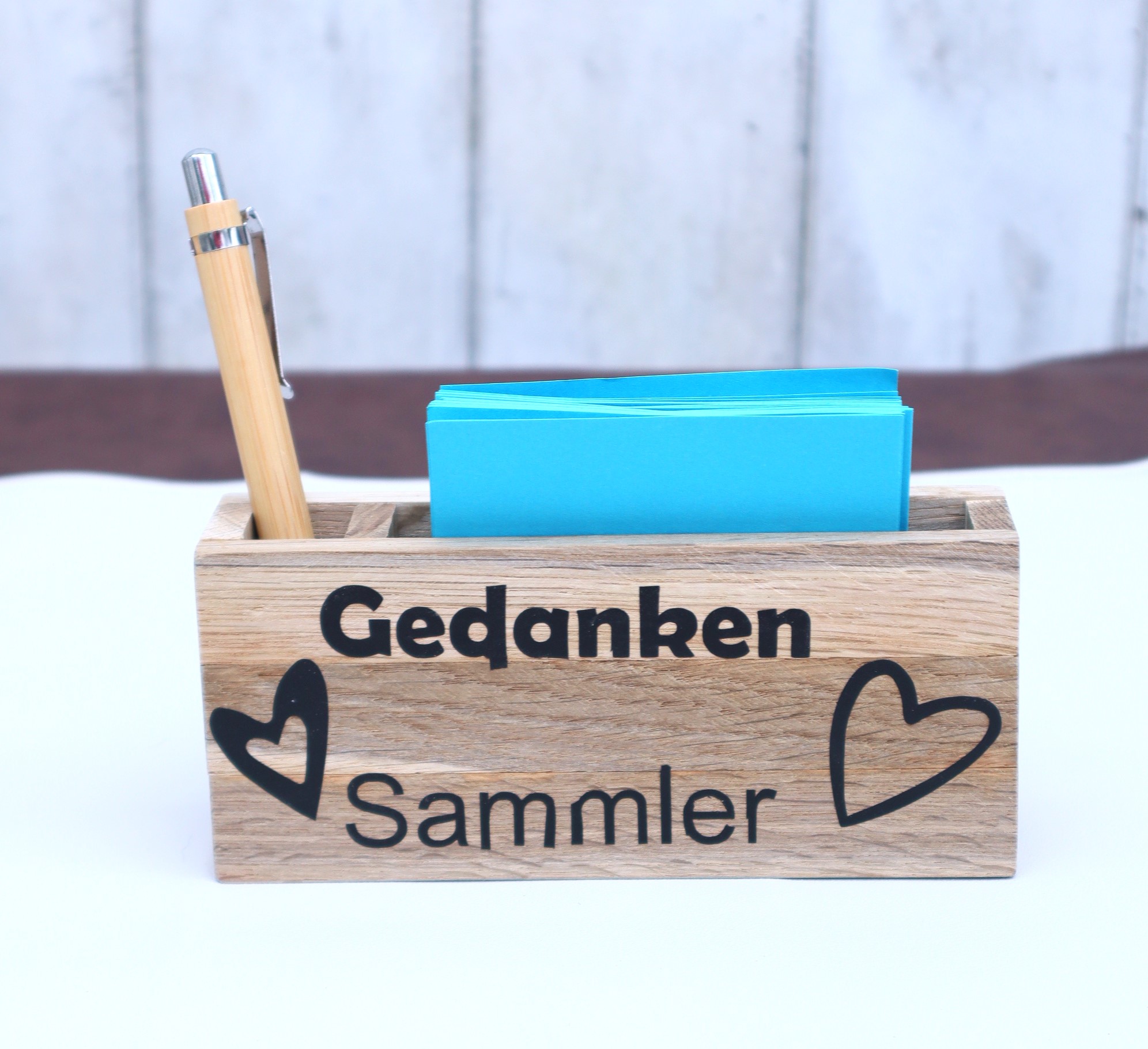 Witzige Geschenkidee mit graviertem Kuli und einem Notizzettelhalter aus Holz. Ein tolles Geschenk für die Freundin, den Opa oder die Mama, die gerne ständig ein Blatt Papier suchen, um sich etwas zu notieren.Nun muß nicht mehr gesucht werden, in der kleinen Holzbox ist alles was nötig ist untergebracht, ein gravierter Kugelschreiber und ein Notizblätter.