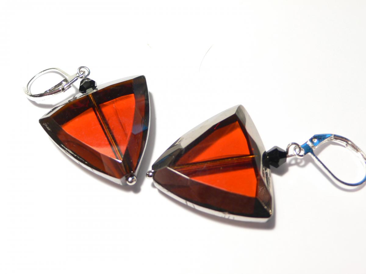 Diese Ohrringe bestehen aus dreieckigen Spiegelglasperlen. Diese sind an den Seiten bedampft und haben daher einen silbrigen Rand. Die Farbe ist ein klares Rostbraun. Getoppt wird die Perle von einer schwarzen Doppelkegelglasperle. Die Ohrhänger werden mit silver plated Klappbrisuren geschlossen. Länge gesamt 4,1cm. Die Perlen sind Vintageperlen und haben daher leichte Fehler in der seitlichen Bedampfung. Das erhöht ihren Charme.