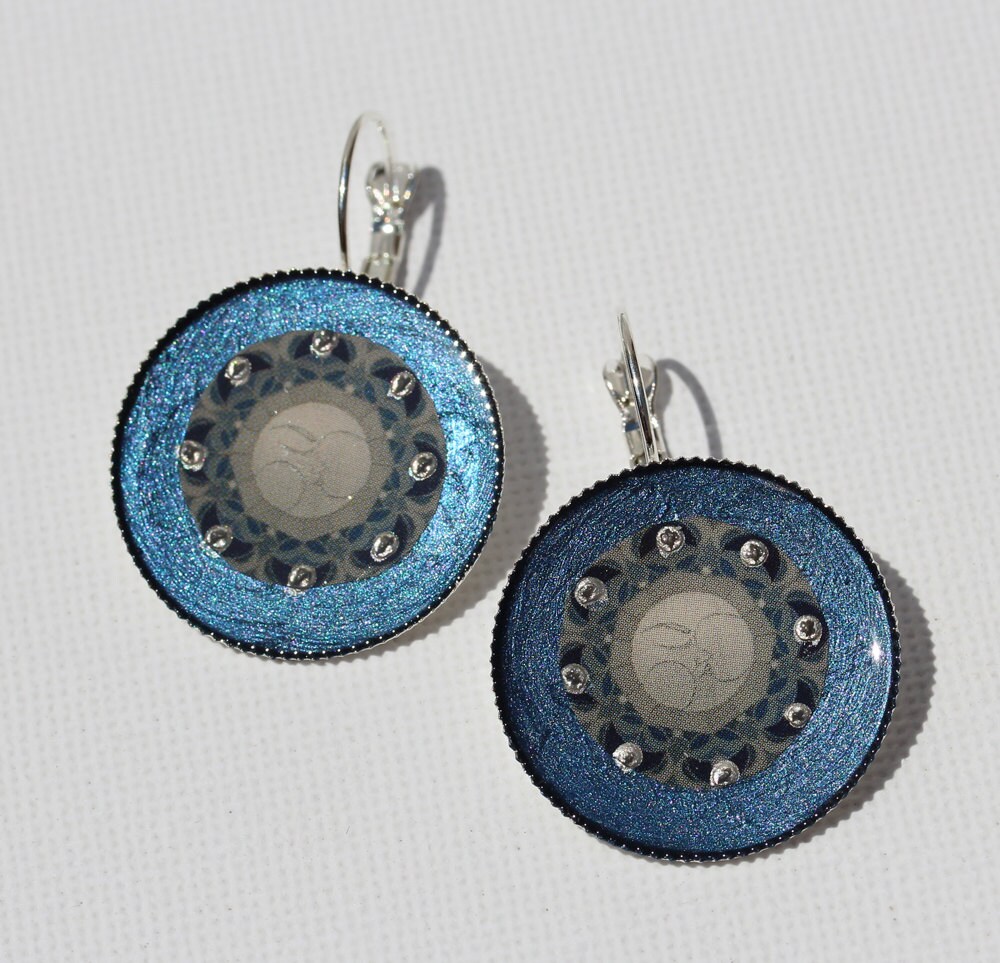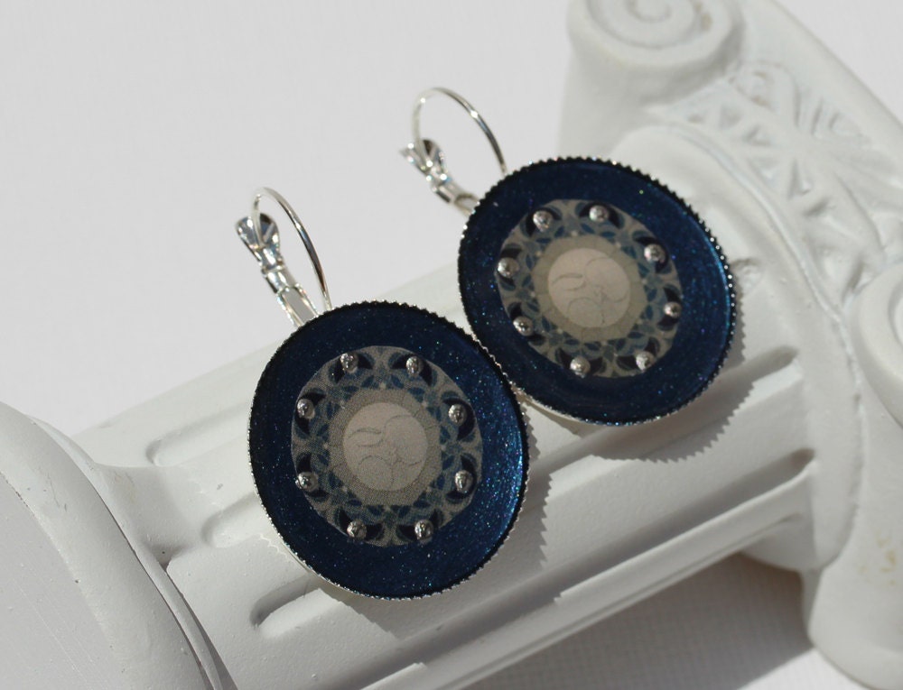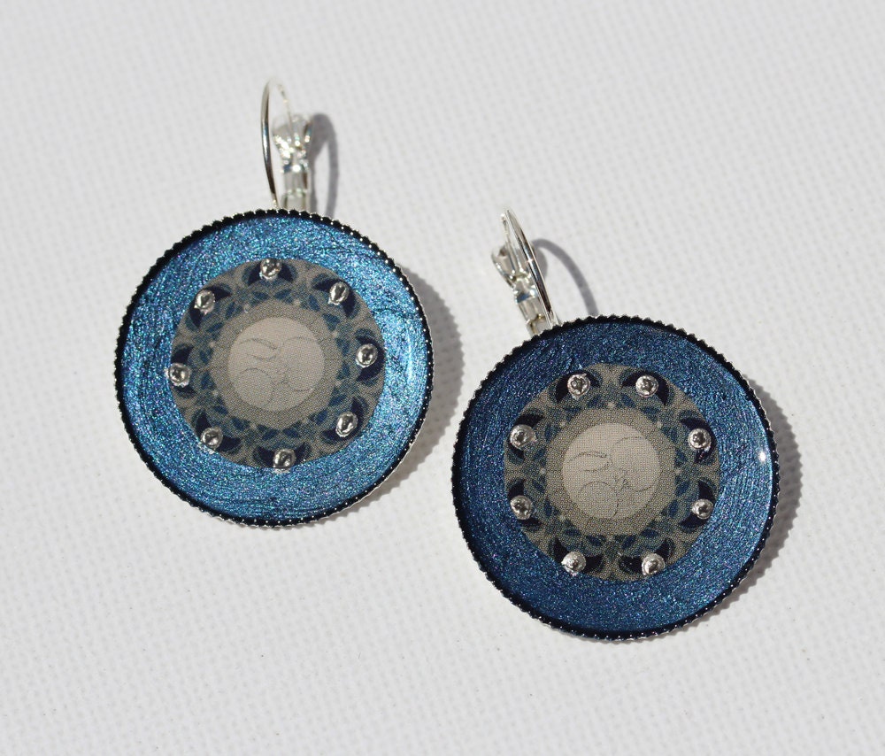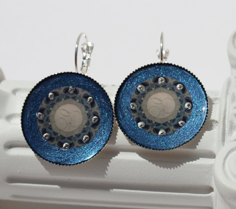 Ohrringe mit dem schönen Mond Mandala Motiv "Lunasacrada" auf edlem blausilbernem Grund. Das Motiv ist von Hand eingearbeitet in schützenden Resinguß, verziert mit kleinen silbernen Glanzpunkten.