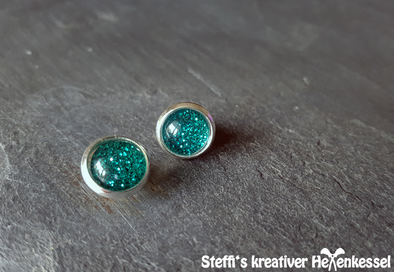 Schöne silberfarbene Ohrringe als Stecker, bestehend aus einem grün glitzernden Cabochon als Schmuckstein in einer Fassung.