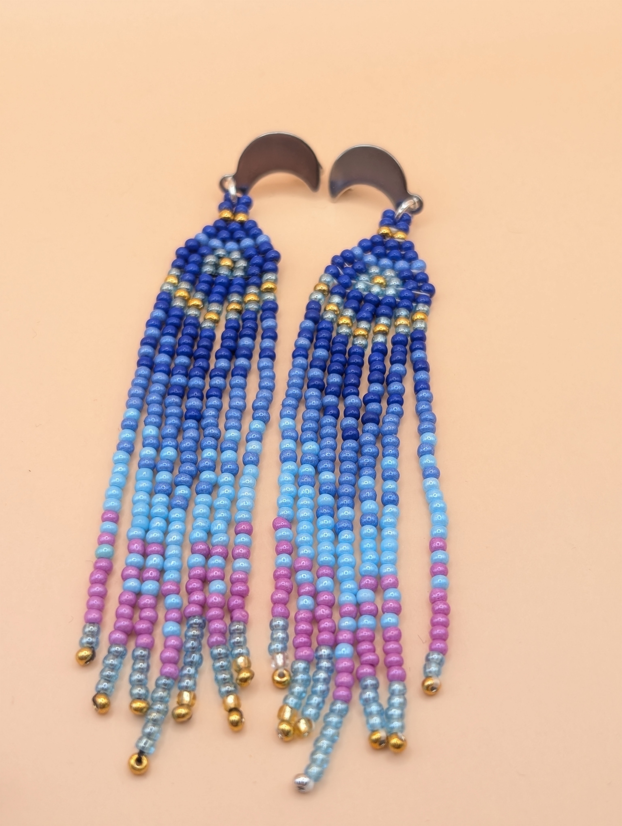 Diese handgefertigten Perlenohrringe im Boho Stil vereinen kunstvolle Handarbeit mit modernen Farben. Das harmonische Farbspiel aus dunklem Blau, Türkis, Rosa und goldenen Akzenten verleiht den Ohrringen eine besondere Eleganz und einen lebendigen Look.