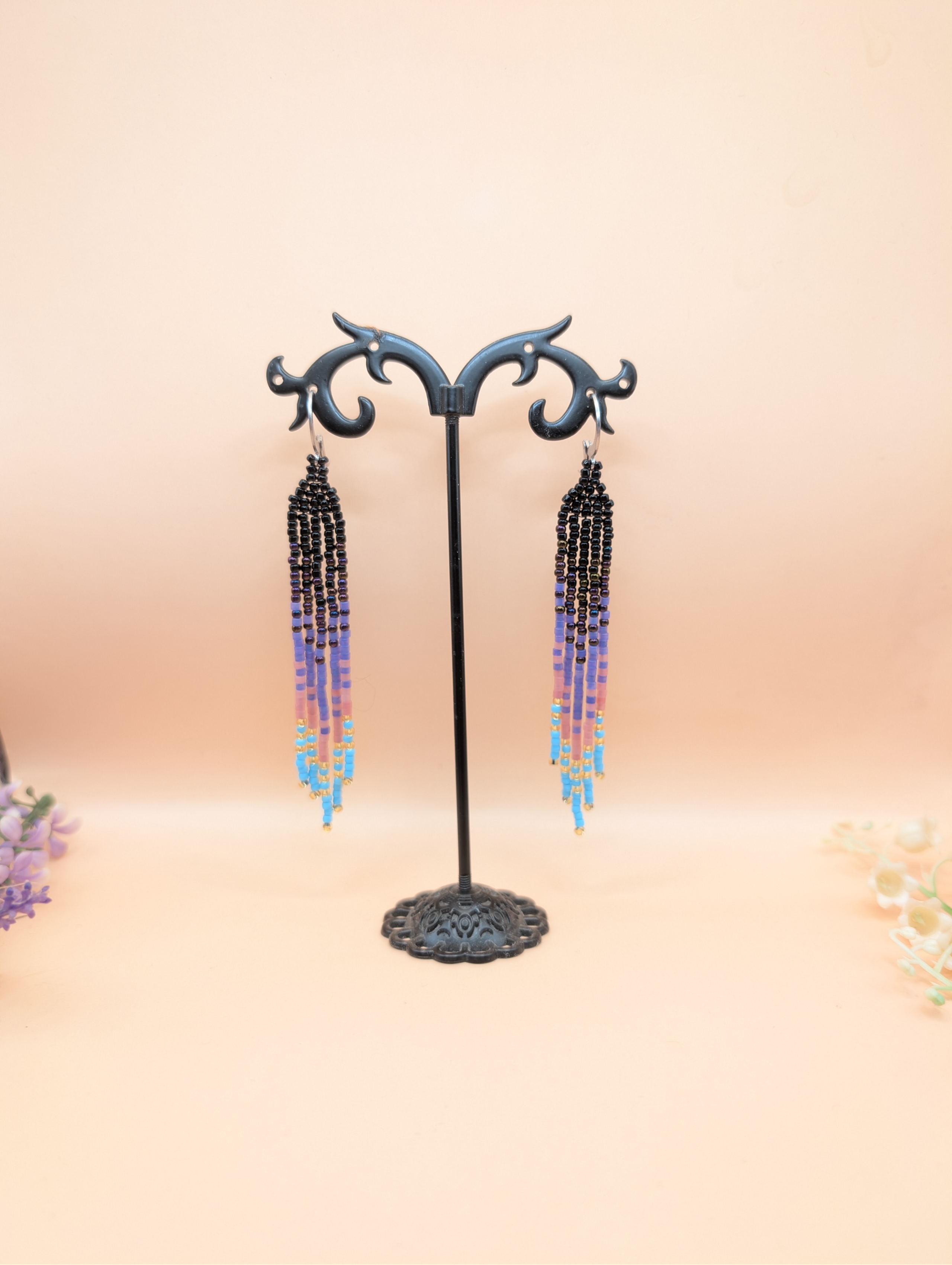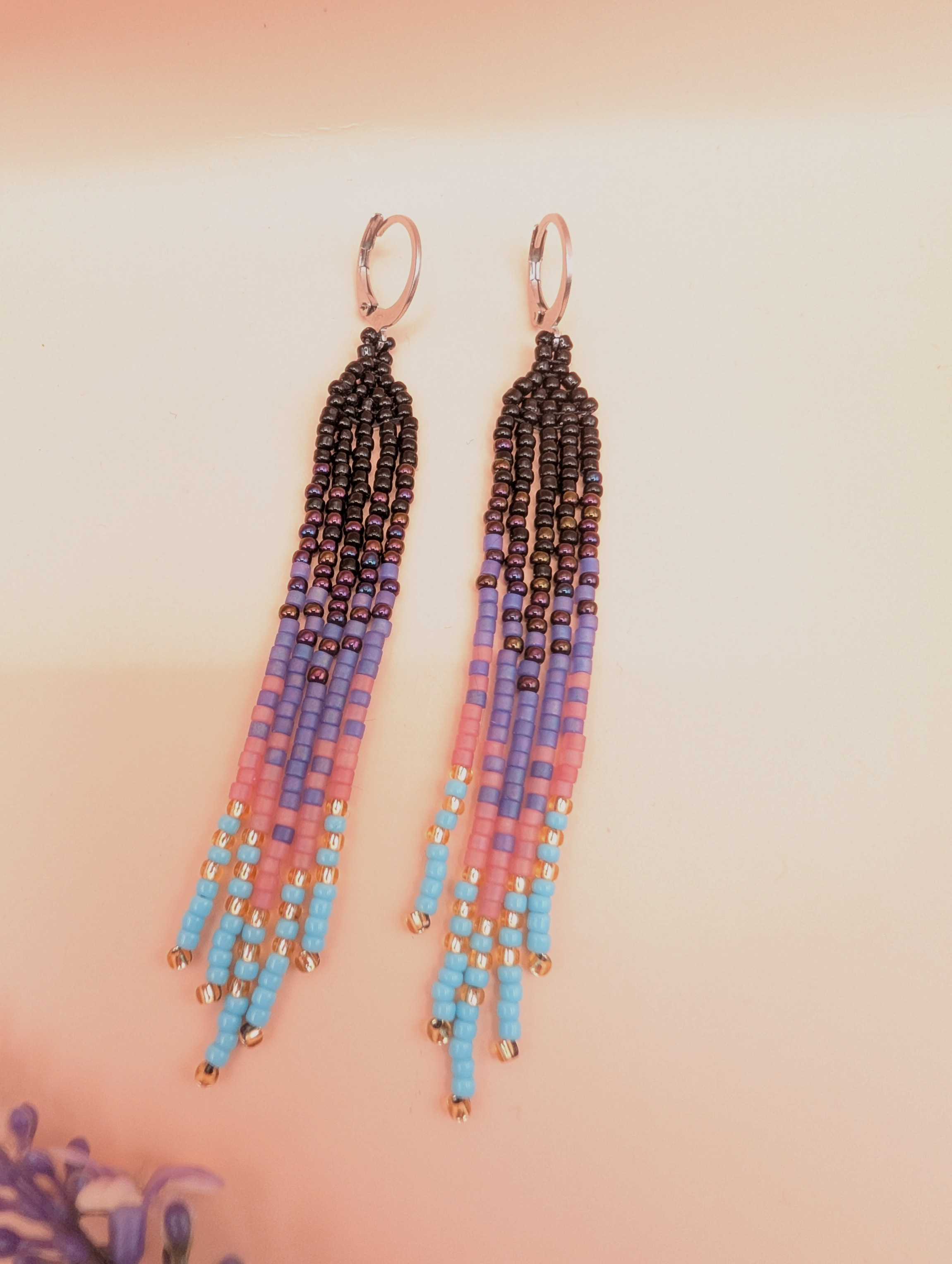 Diese handgefertigten Perlenohrringe im Boho-Stil sind ein stilvoller Blickfang. Die feinen Glasperlen sind sorgfältig zu langen Fransen verarbeitet und ergeben ein harmonisches Farbspiel aus Schwarz, Lila, Rosa und Türkis.