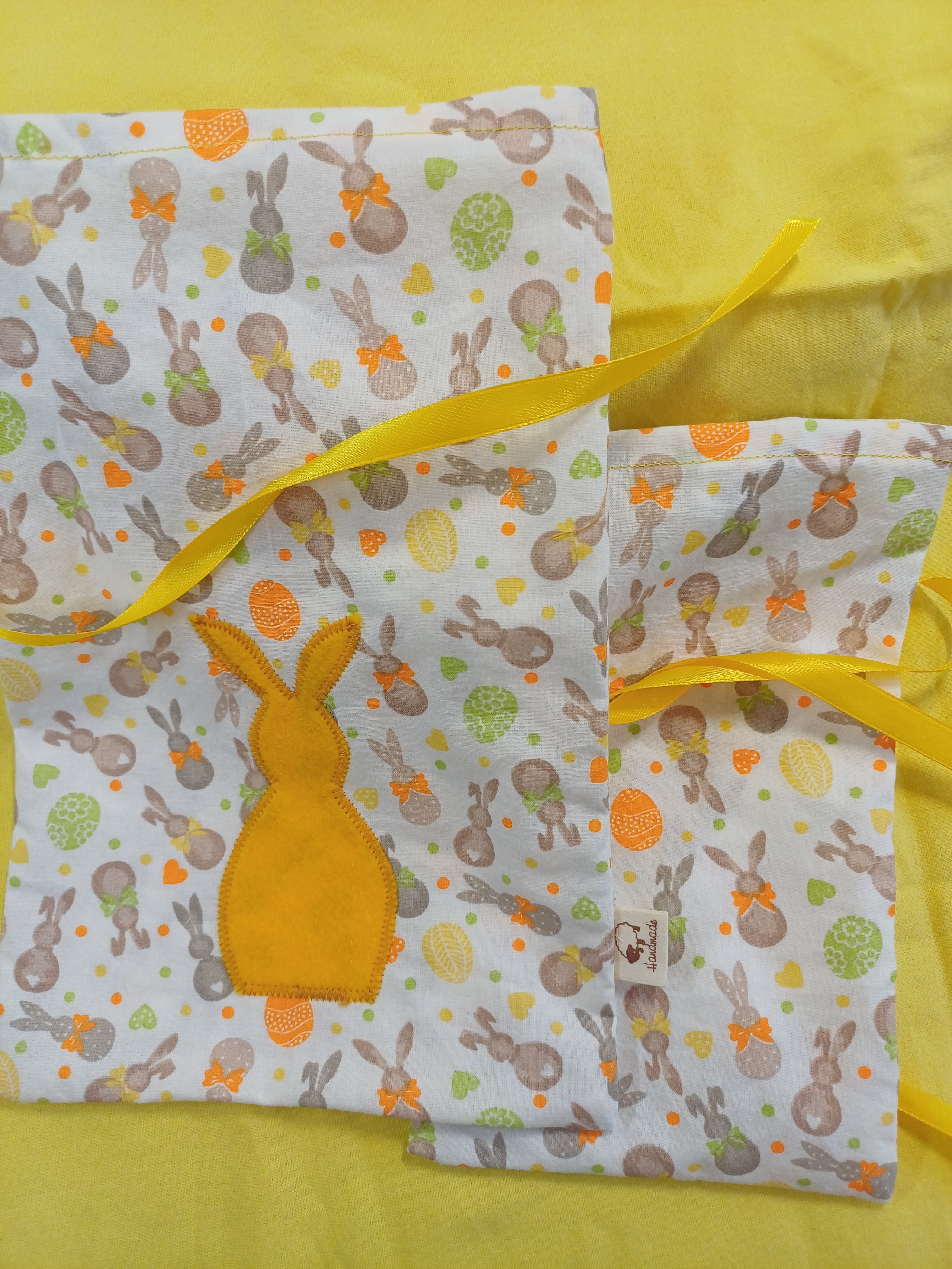 Beide Beutel haben ein farblich passendes Band zum schnüren. Die Bänder sind sicher am Beutel vernäht und können so, unter normalen Umständen, auch nicht verloren gehen.
