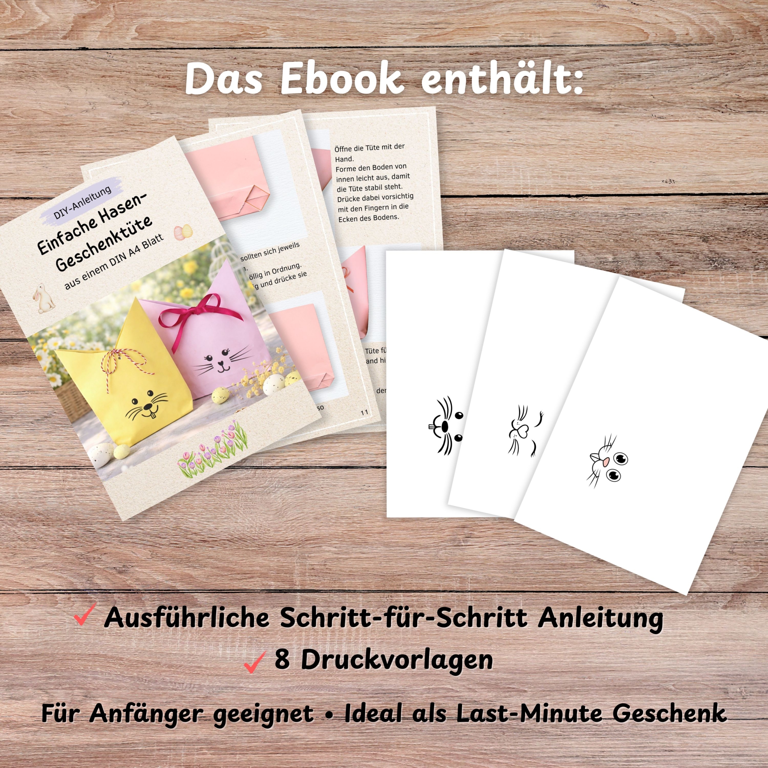 Mit dieser digitalen Bastelanleitung gestaltest du aus nur einem DIN A4 Blatt eine Hasen-Geschenktüte aus Papier – auch ohne Bastelerfahrung.