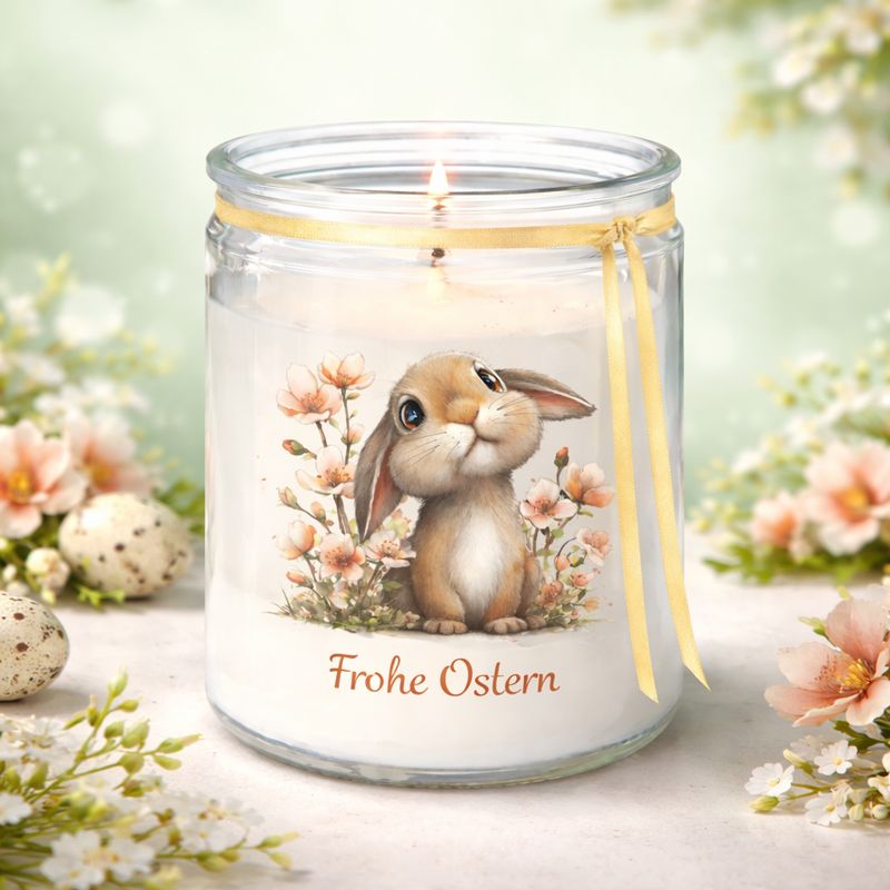 Das zarte Hasenmotiv, mit Botschaft "Frohe Ostern" gedruckt auf eine Wasserschiebefolie und von Hand liebevoll aufgebracht, die Glaskerze veredelt mit einem golden schimmernden Satinband oben am Rand, macht diese Kerze zu einem ganz besonderen Hingucker – perfekt für Ostern und die Frühlingszeit.