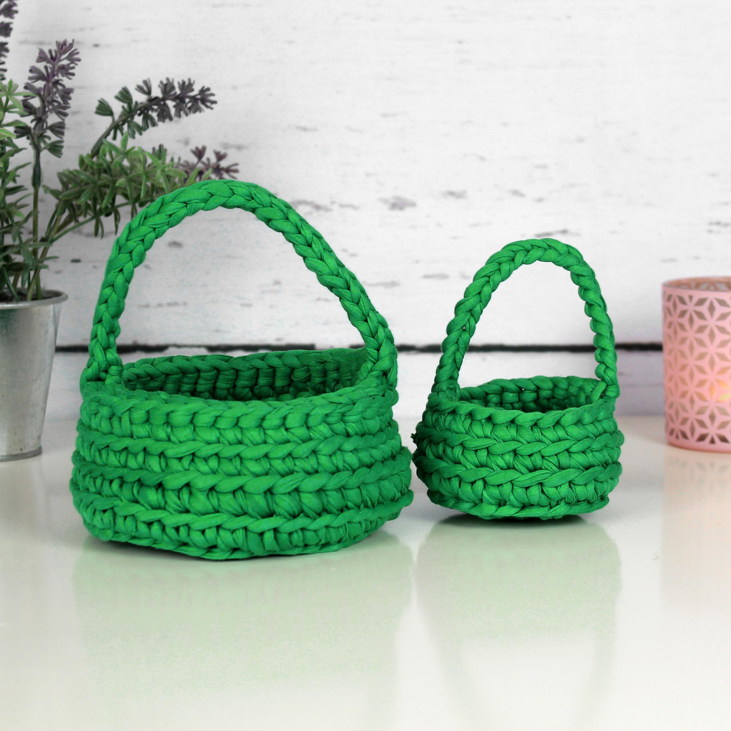 Süße gehäkelte Körbchen mit Henkel aus Textilgarn in grün. Formstabil und standfest.