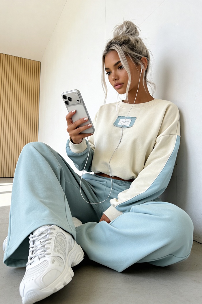 Oversize 2-Teiler in Türkis/Beige bestehend aus einer weiten bequem Hose & einem off Shoulder Shirt in den Größen XS/S und M/L