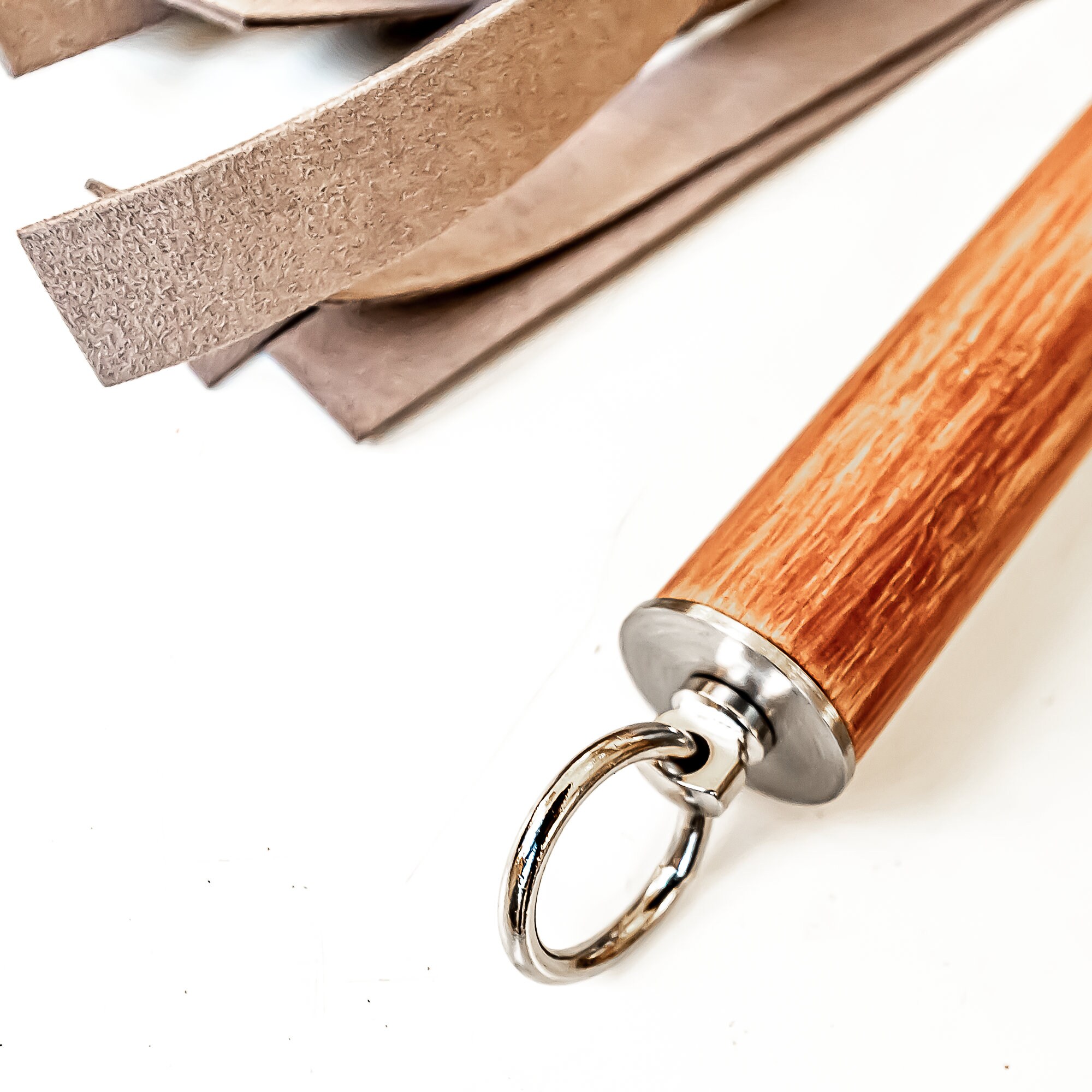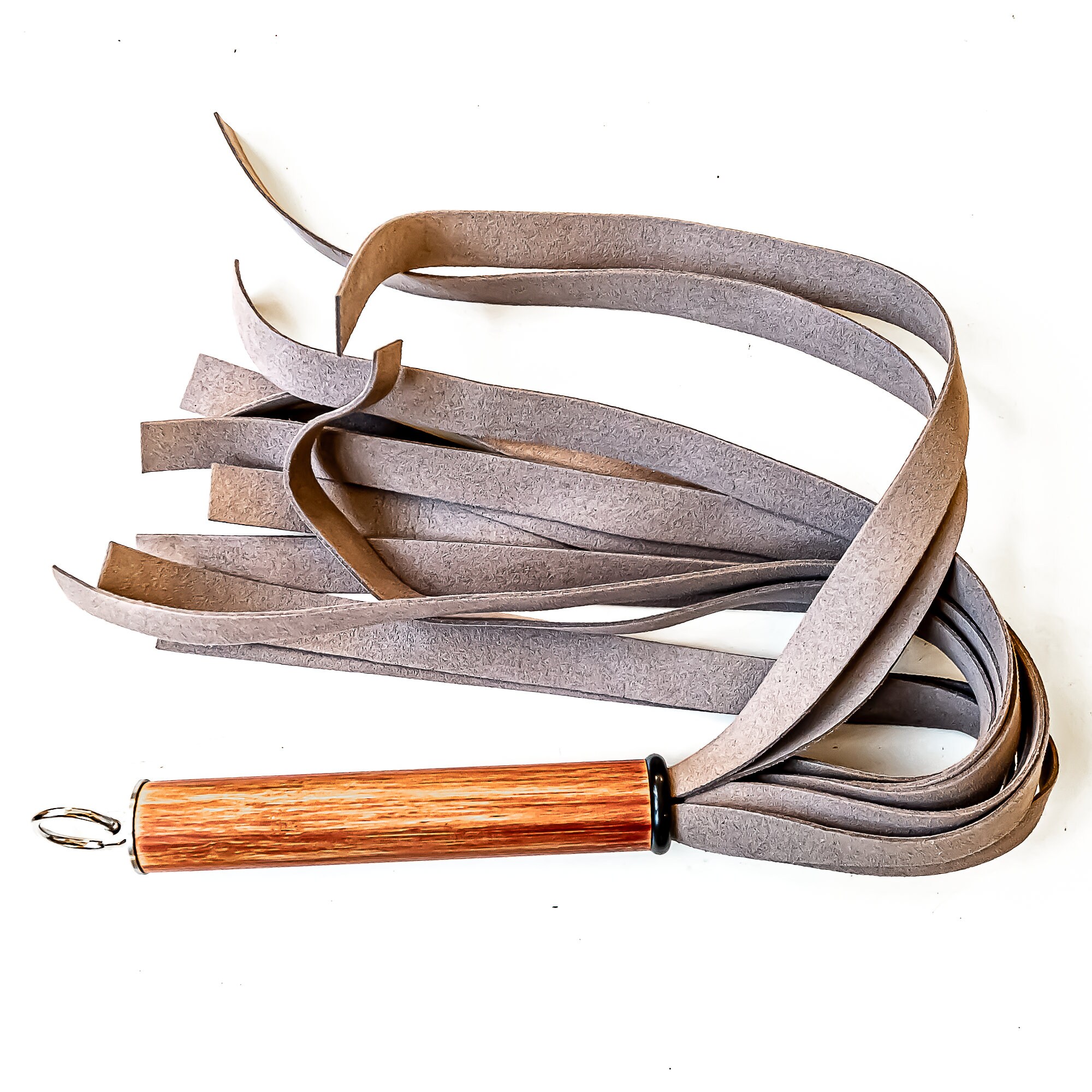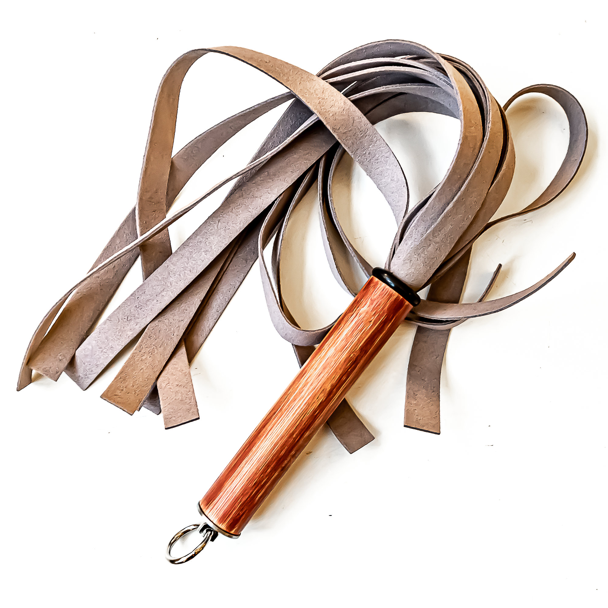 Flogger mit 12 Strängen aus grauen 20mm Fake-Wildlederstreifen, ca. 61cm/24", davon ca. 17cm/7“ Griff aus individuell gefärbtem Bambusholz, veredelt mit feinstem Lack und mit einem Abschluss aus V2A Edelstahl und vernickeltem Messing.
