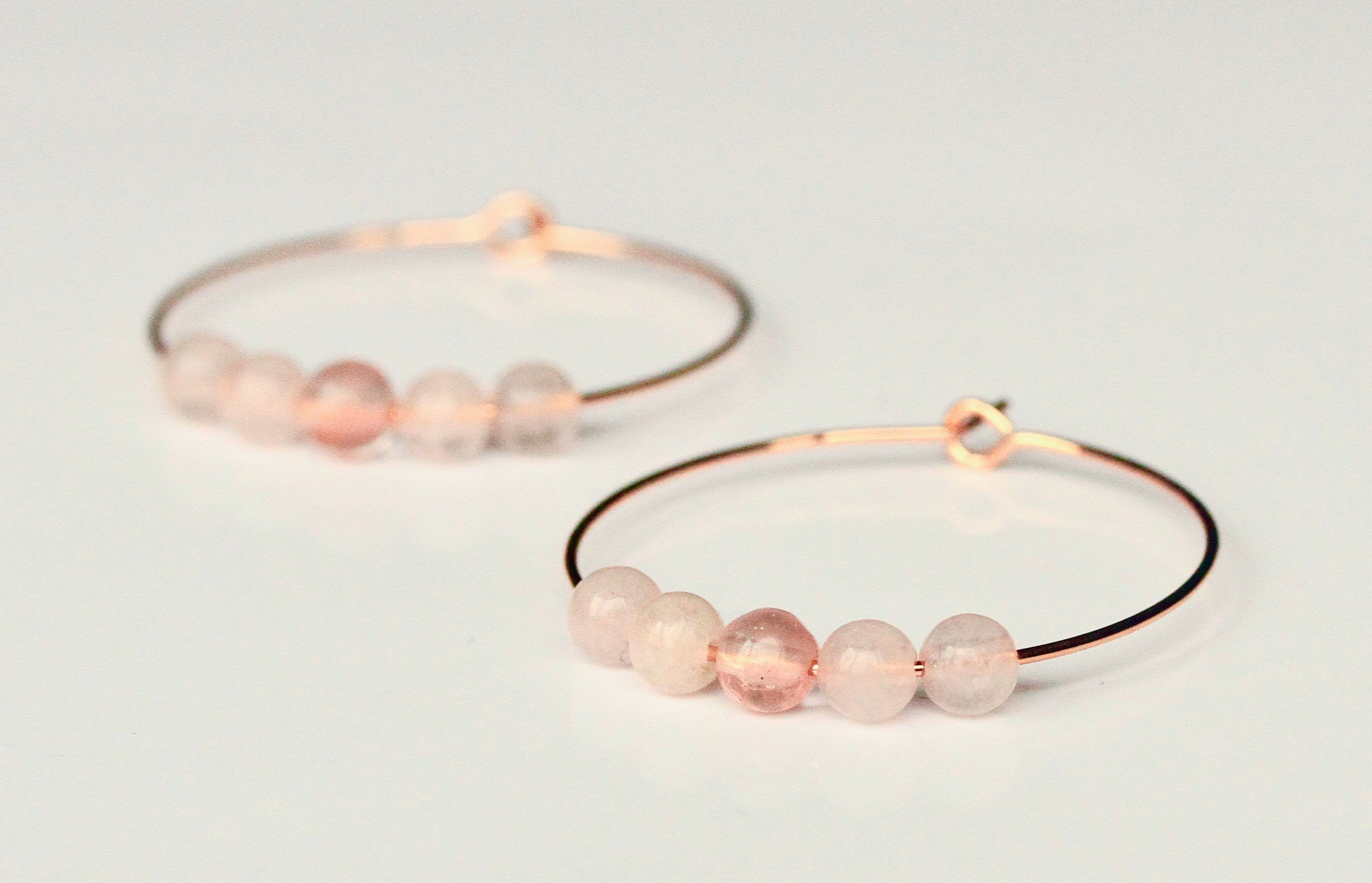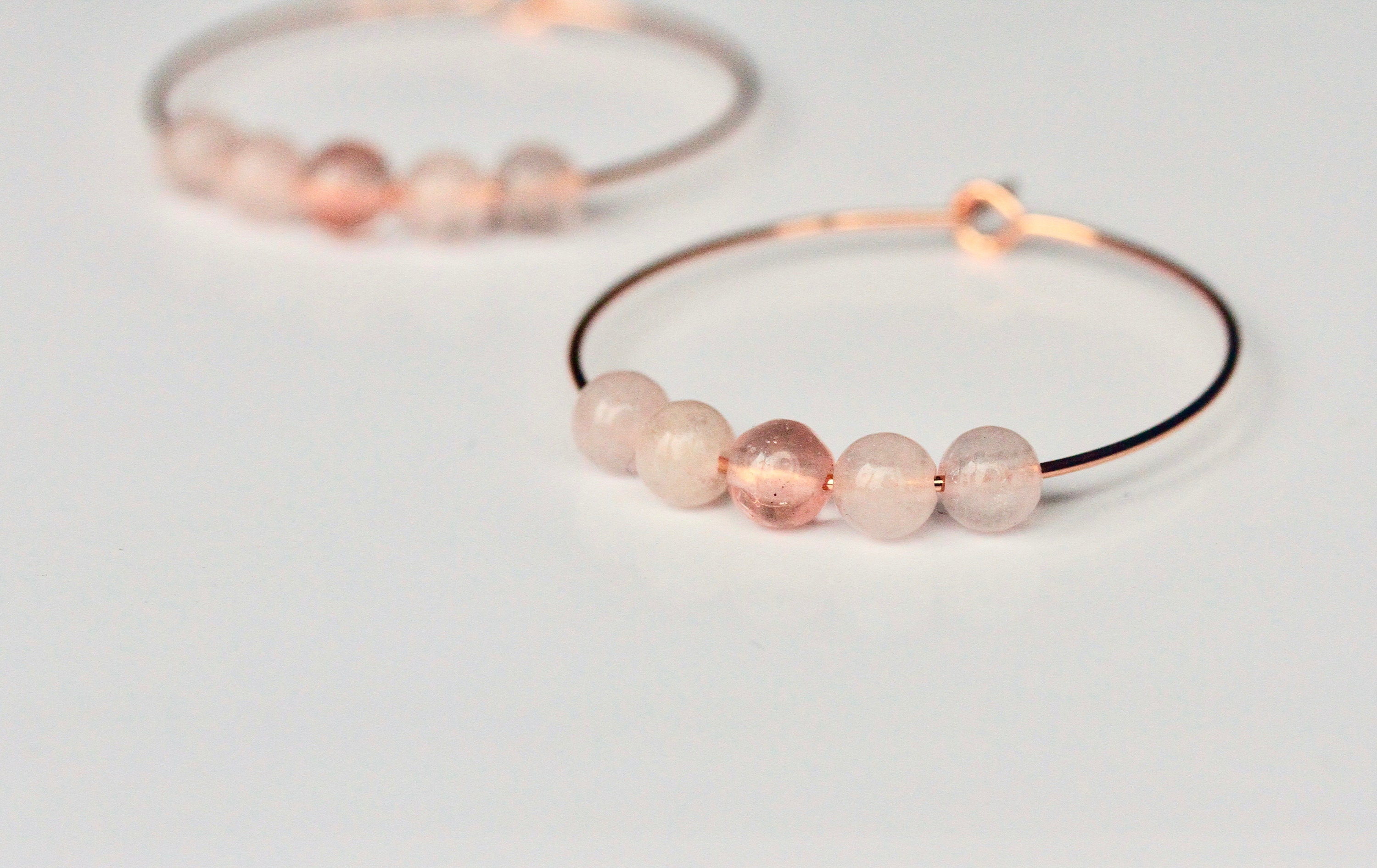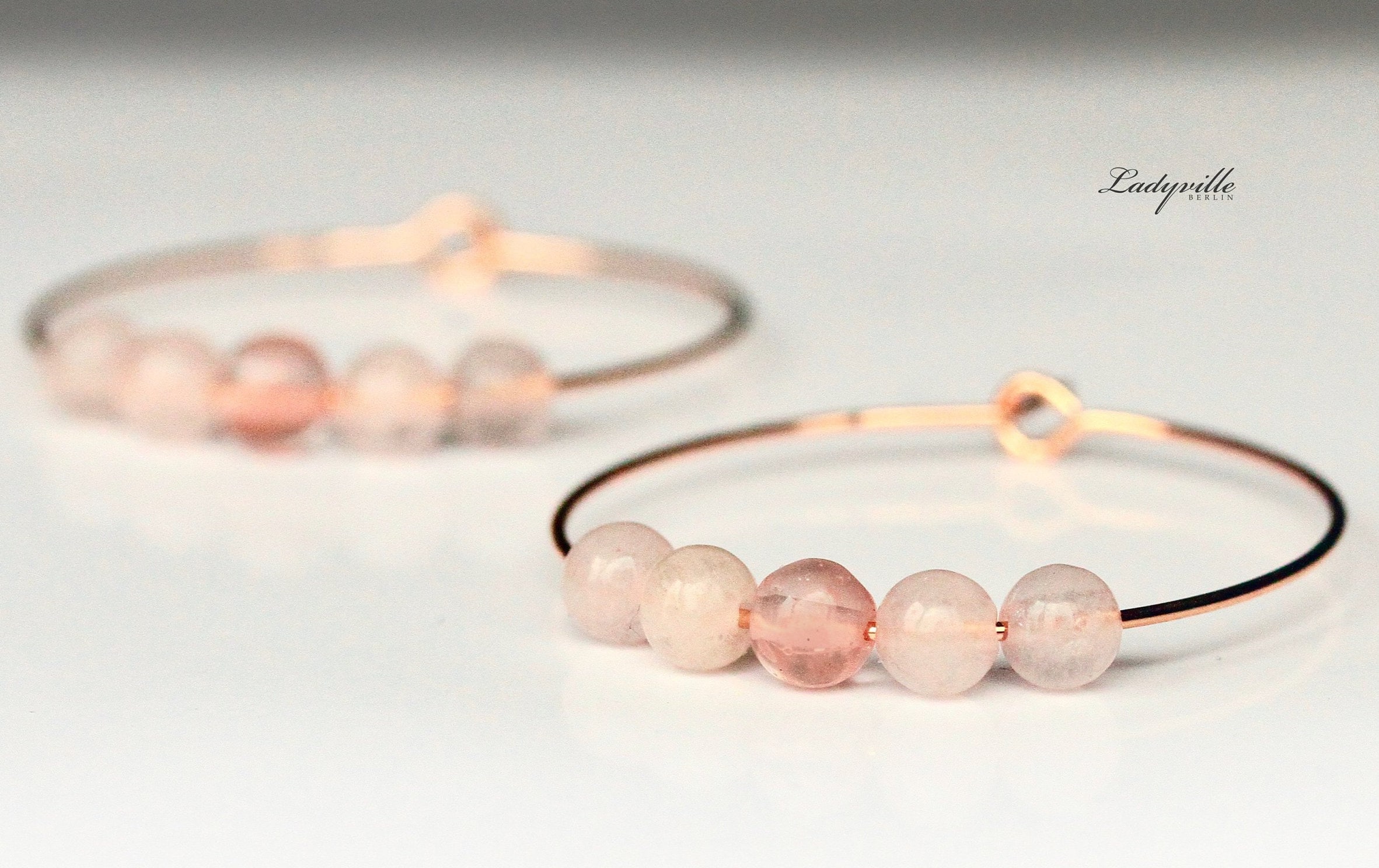 Glänzende Creolen aus 316L Edelstahl, rosegoldfarben und mit vier microfacettierten Perlen aus Rosenquarz und einer mittigen Cherry Quarz Perle.