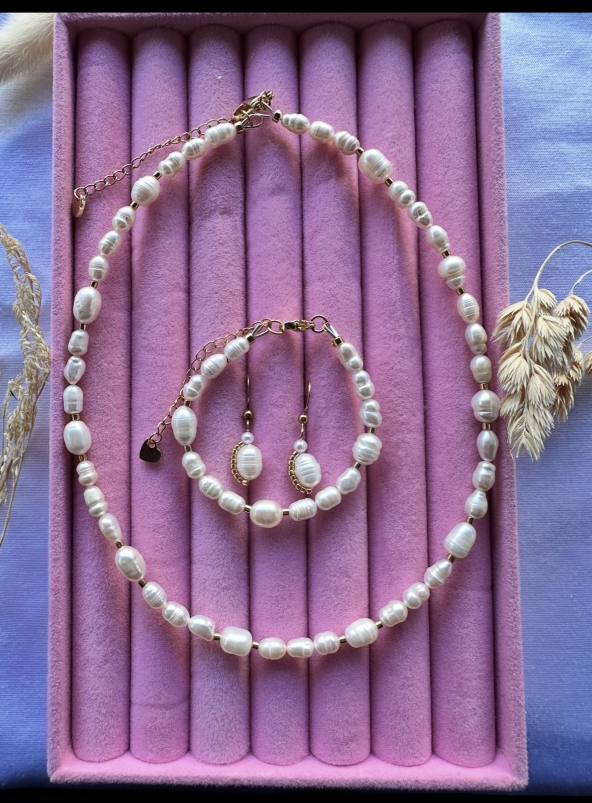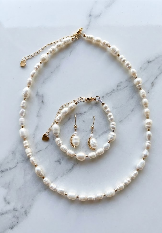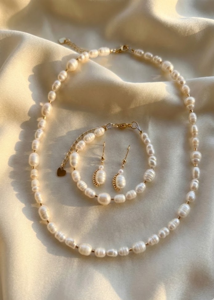 Dieses Schmuckset aus echten Süßwasserperlen kombiniert natürlichen Glanz mit goldfarbenen Edelstahl-Elementen. Es besteht aus einer Halskette, einem Armband und passenden Ohrringen – alles perfekt aufeinander abgestimmt.
