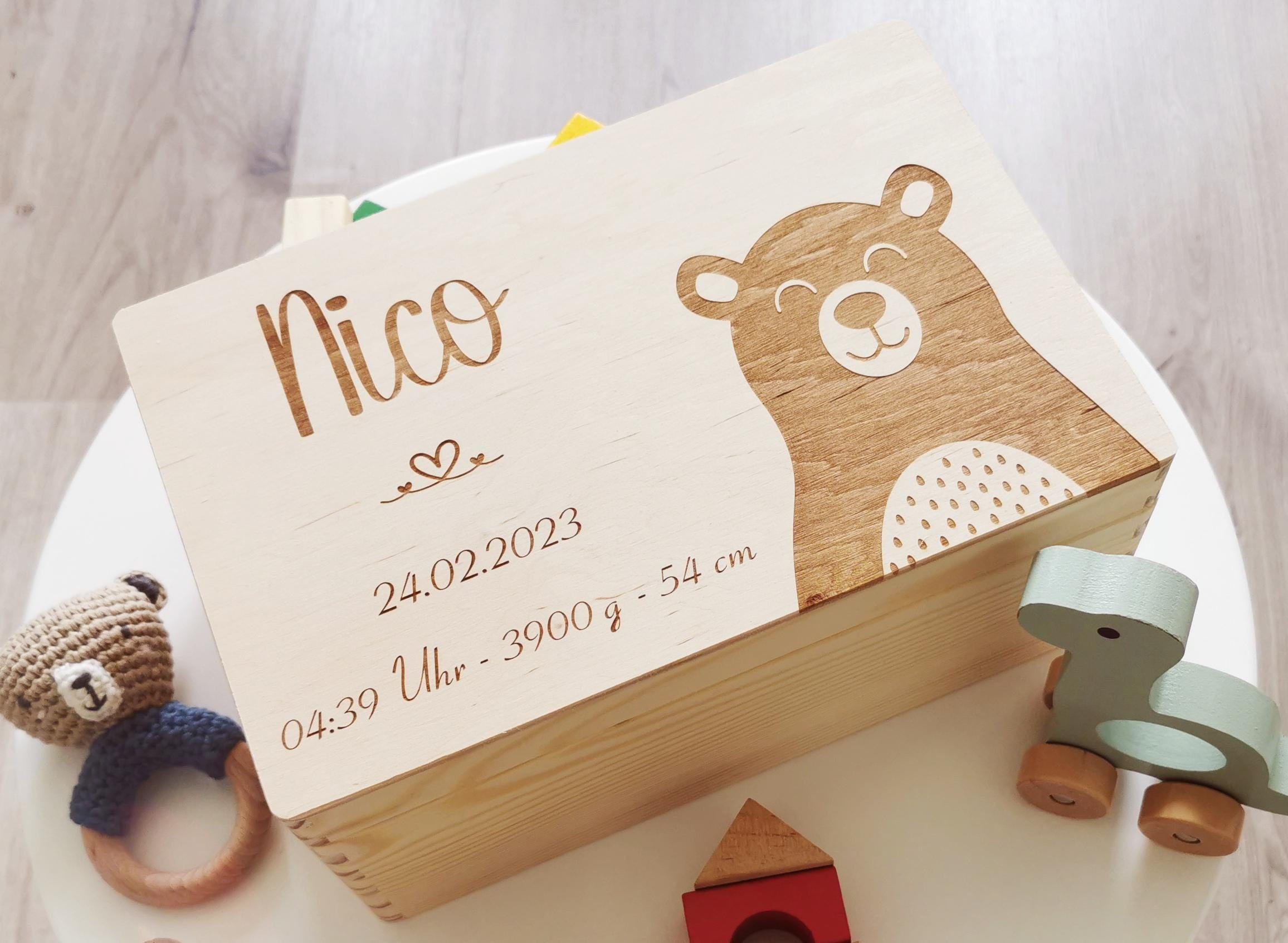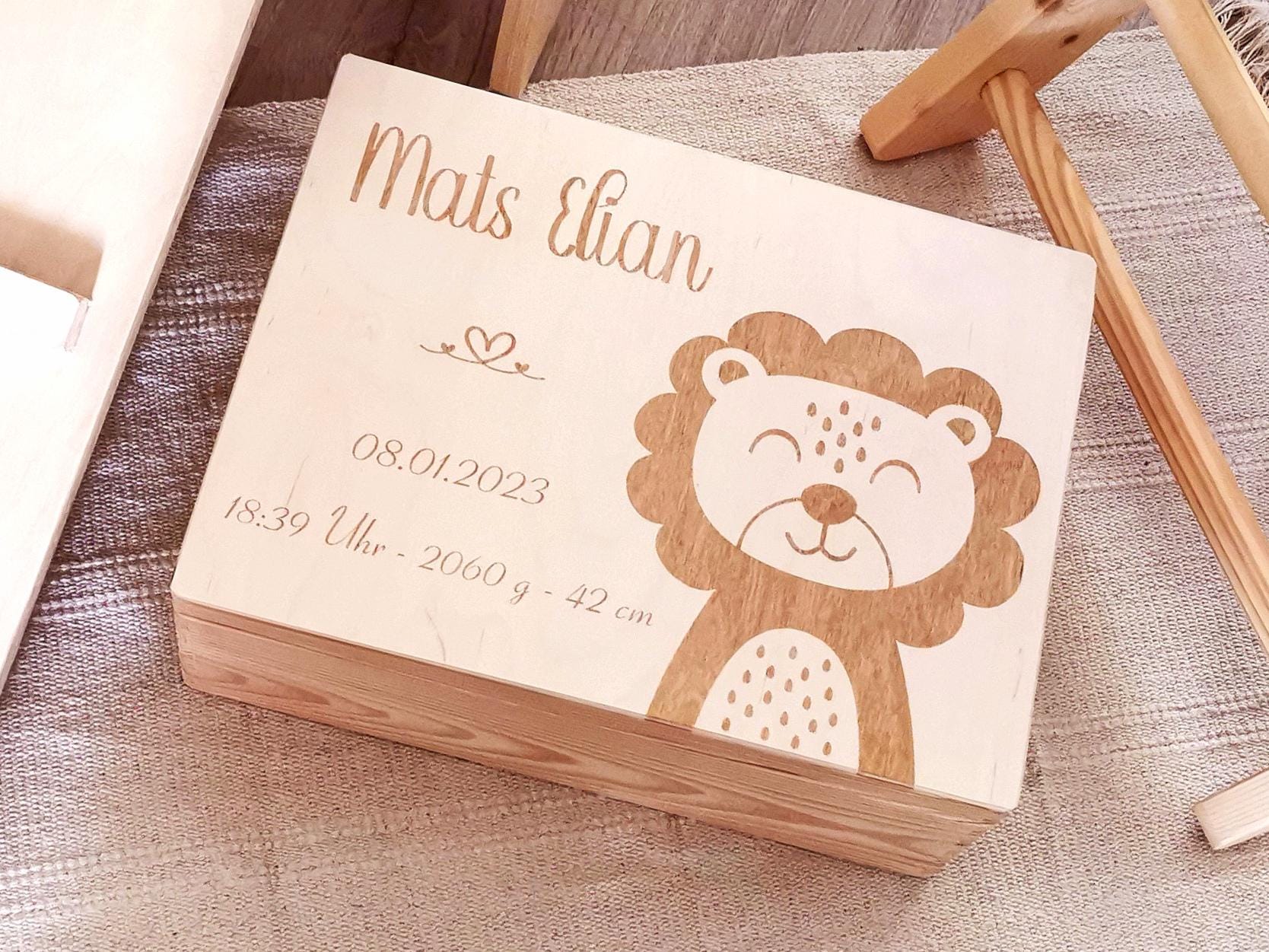 Personalisierte Erinnerungskiste zur Geburt – Holzkiste mit Gravur & Tiermotiv