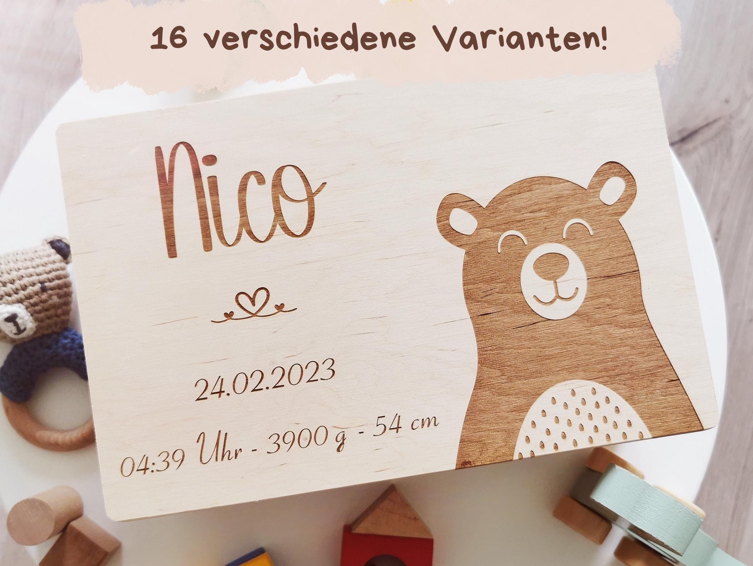 ✨ Zeitlose Gravur mit Liebe zum Detail: Jedes unserer 16 Tiermotive wird zusammen mit deinen Wunschdaten präzise per Laser in das helle Echtholz graviert. Im Gegensatz zu Aufklebern ist die Gravur dauerhaft, abriebfest und wirkt durch die natürliche Holzoptik besonders elegant und hochwertig.