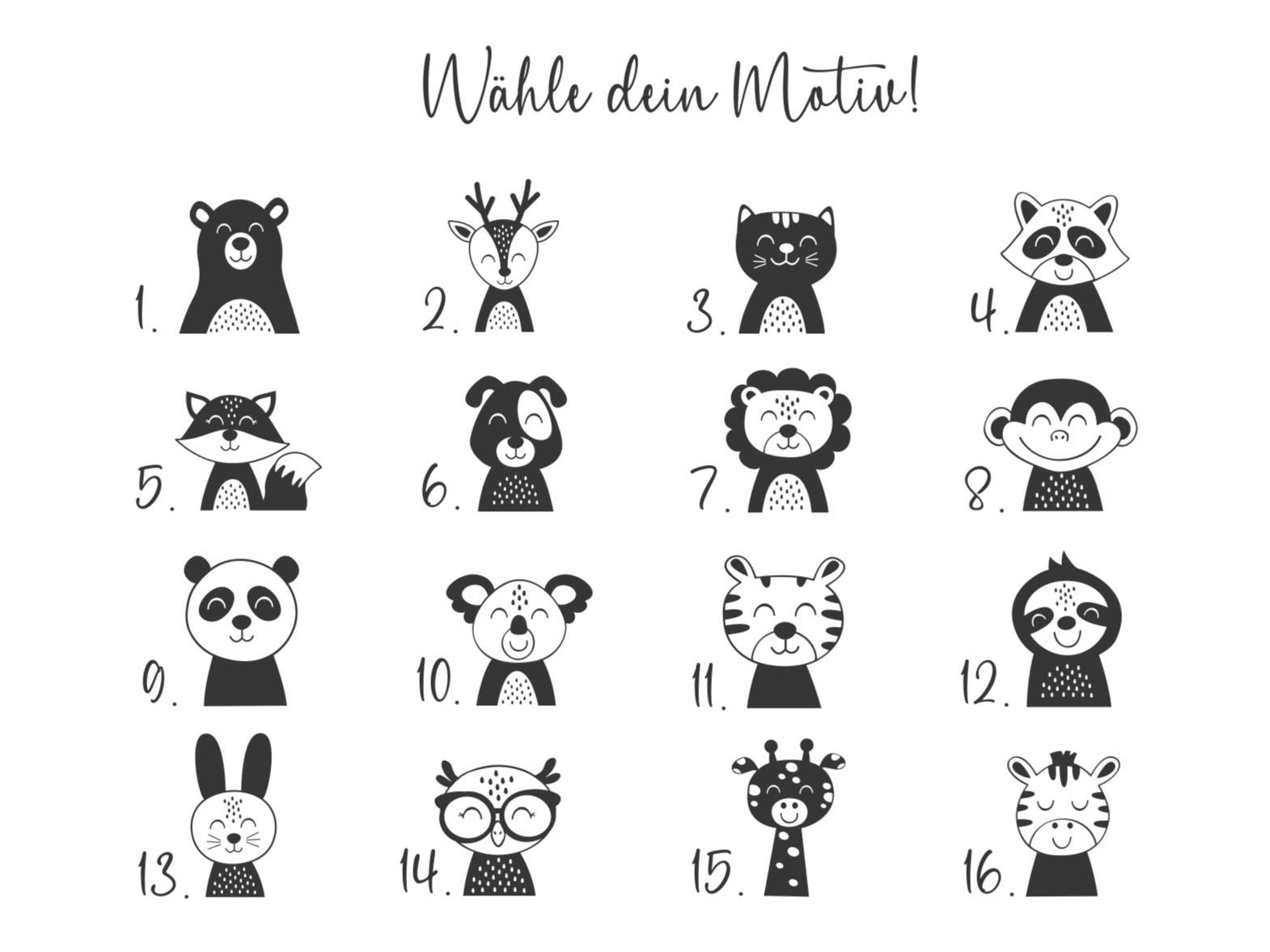 • 16 süße Tiermotive: Wähle dein Lieblingstier (z. B. Bär, Reh, Löwe oder Hase).