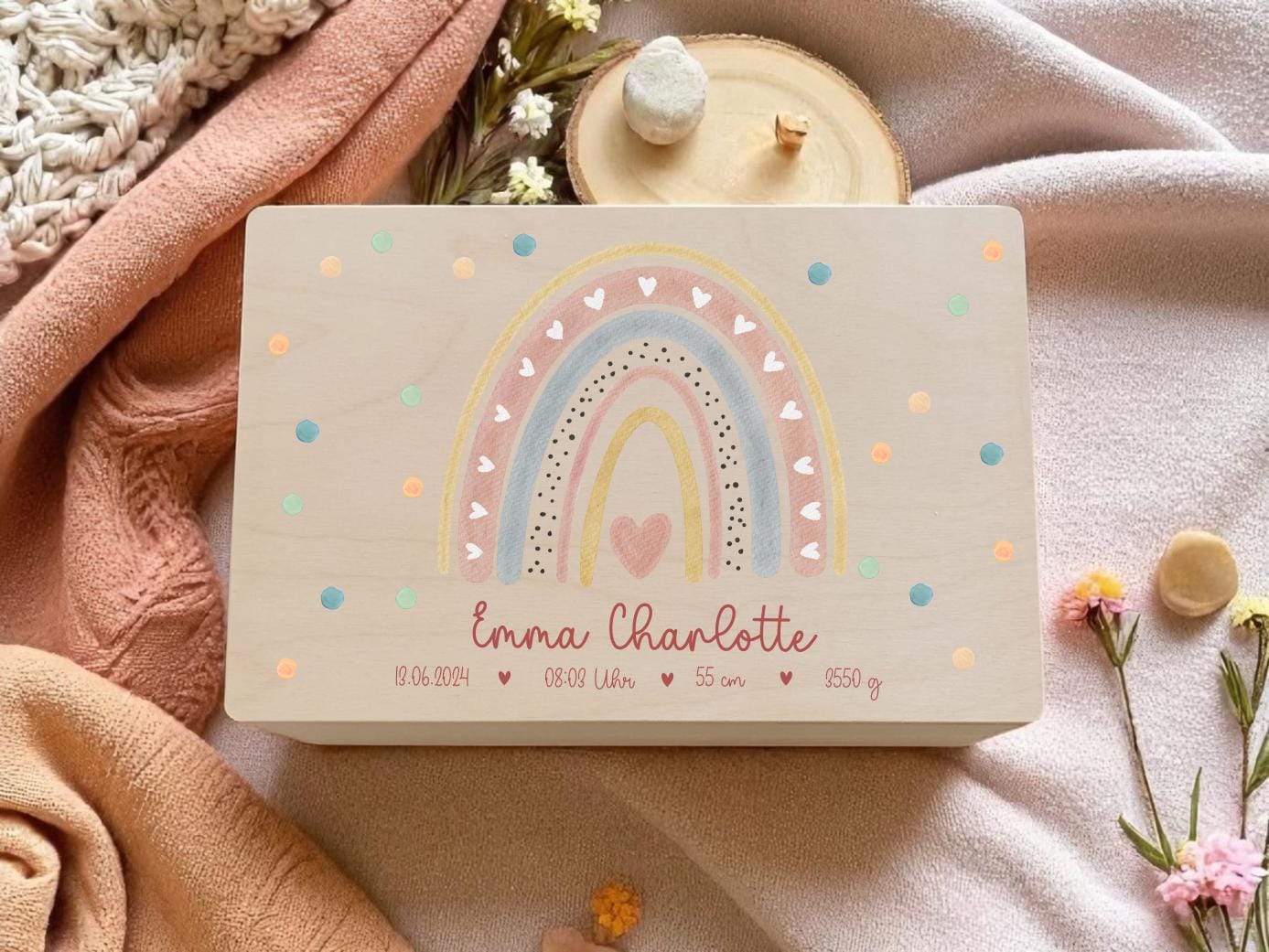 • Schenke ein Unikat, das mitwächst! Diese hochwertige Holzkiste besticht durch ein zeitloses Design im angesagten Boho-Stil. Ein wunderschöner Regenbogen in sanften Pastelltönen bildet das Herzstück, spielerisch umrahmt von feinen, farblich abgestimmten Pastell-Punkten, die sich über die Kiste verteilen.
