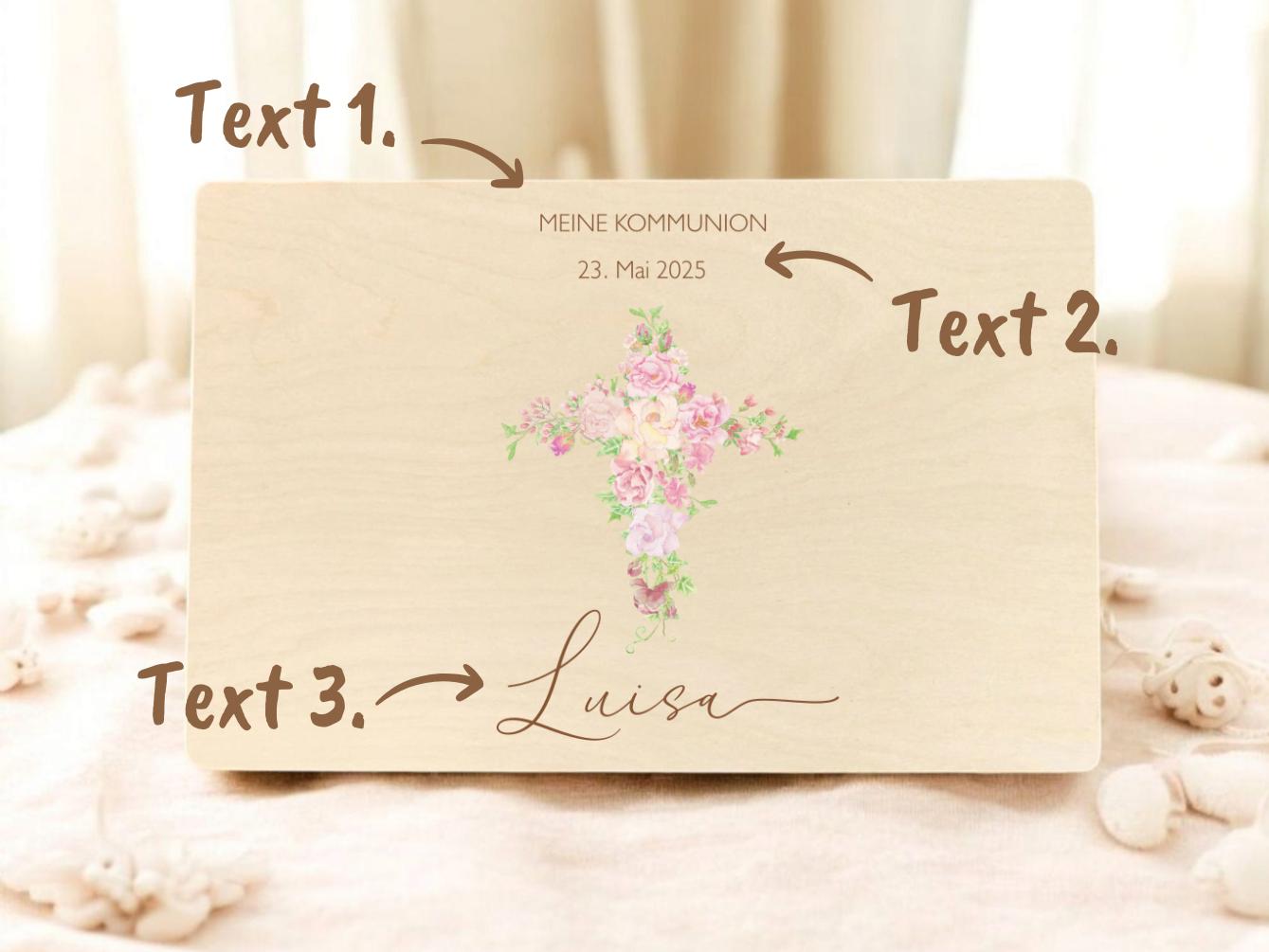 ✨ Individuelle Personalisierung: Du kannst die Kiste ganz nach deinen Wünschen gestalten. Die Box ist mit einem edlen Kreuz-Motiv versehen und lässt sich über drei Textfelder individuell anpassen: