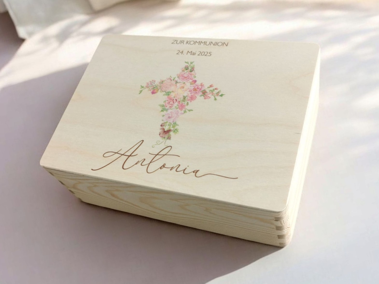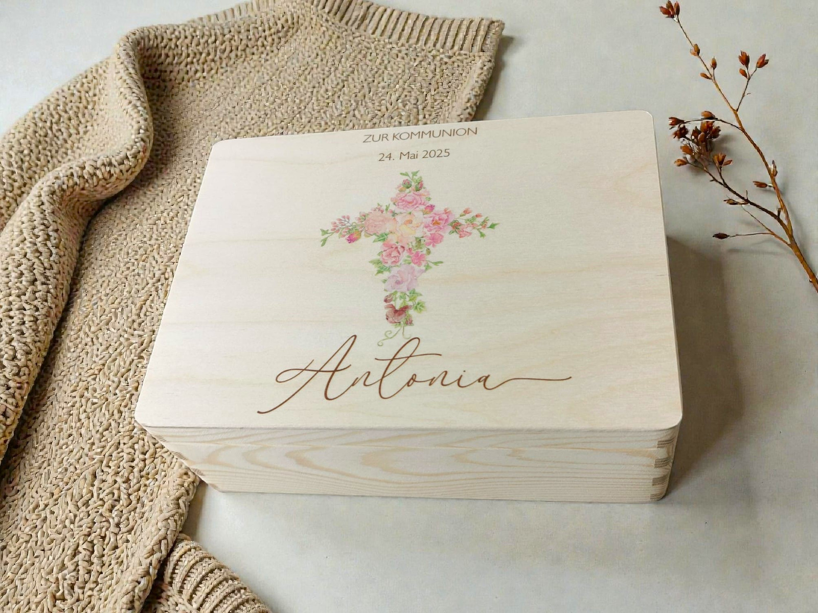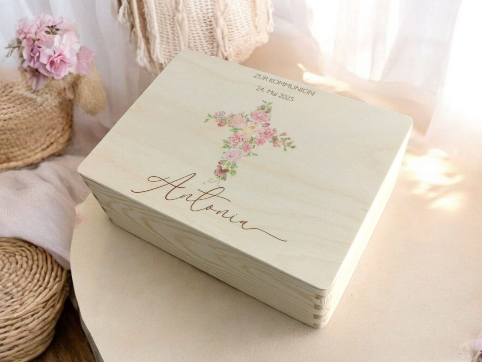 Suchst du ein persönliches Geschenk zur Konfirmation, ein besonderes Taufgeschenk oder ein Andenken zur Erstkommunion? Unsere handgefertigte Erinnerungskiste aus Holz ist die ideale Geschenkidee von Paten, Großeltern und Eltern. Personalisiere diese hochwertige Holzkiste mit dem Namen, dem Datum und einem individuellen Wunschtext, um diesen bedeutenden spirituellen Meilenstein für immer festzuhalten.✨