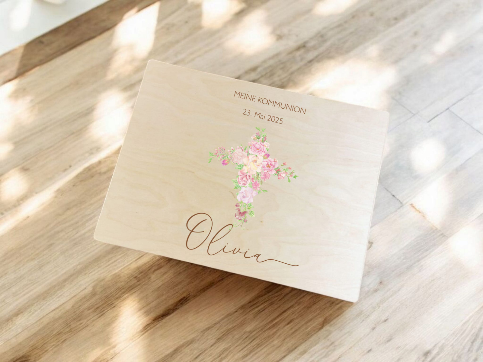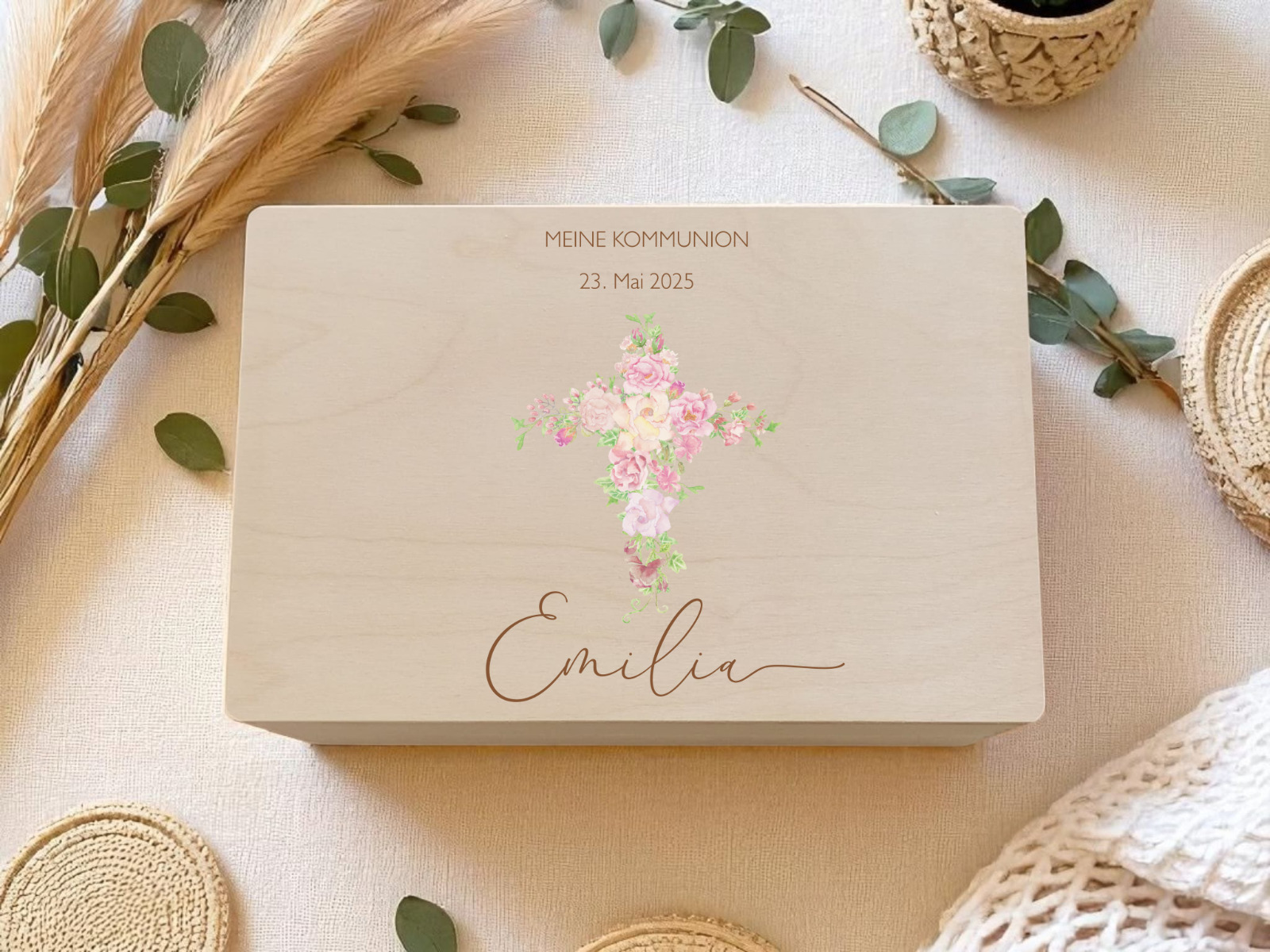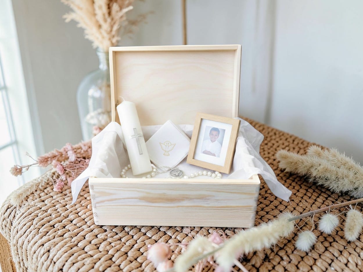 Suchst du ein persönliches Geschenk zur Konfirmation, ein besonderes Taufgeschenk oder ein Andenken zur Erstkommunion? Unsere handgefertigte Erinnerungskiste aus Holz ist die ideale Geschenkidee von Paten, Großeltern und Eltern. Personalisiere diese hochwertige Holzkiste mit dem Namen, dem Datum und einem individuellen Wunschtext, um diesen bedeutenden spirituellen Meilenstein für immer festzuhalten.✨