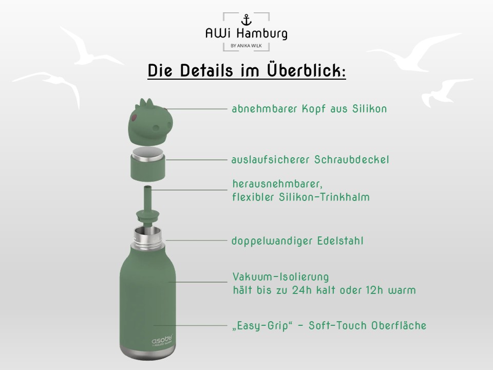 Sie wurde speziell für kleine Hände entwickelt und lässt sich dank des kindgerechten Silikon-Tierkopfes leicht öffnen und schließen. Mit ihrem niedlichen Tierdesign und der angenehm griffigen Soft-Touch-Oberfläche wird sie schnell zur Lieblingsflasche im Alltag für kleine Abenteurer.