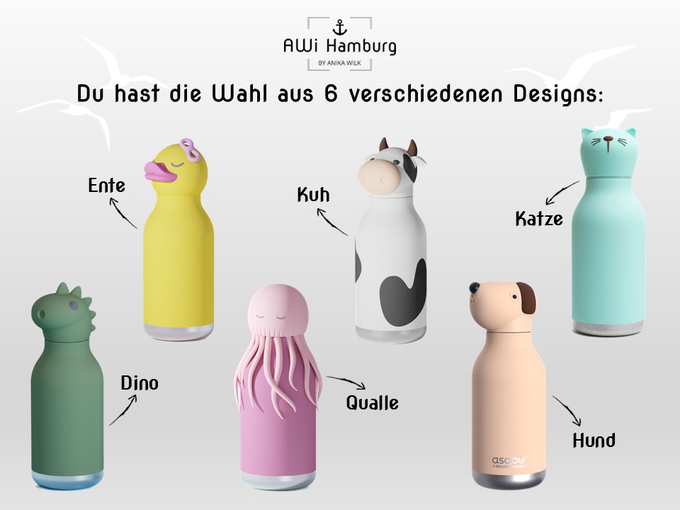 ~ eine Trinkflasche in deinem ausgewählten Design (inkl. Silikonkopf, integriertem Silikon-Trinkhalm, Reinigungsbürste für den Trinkhalm)