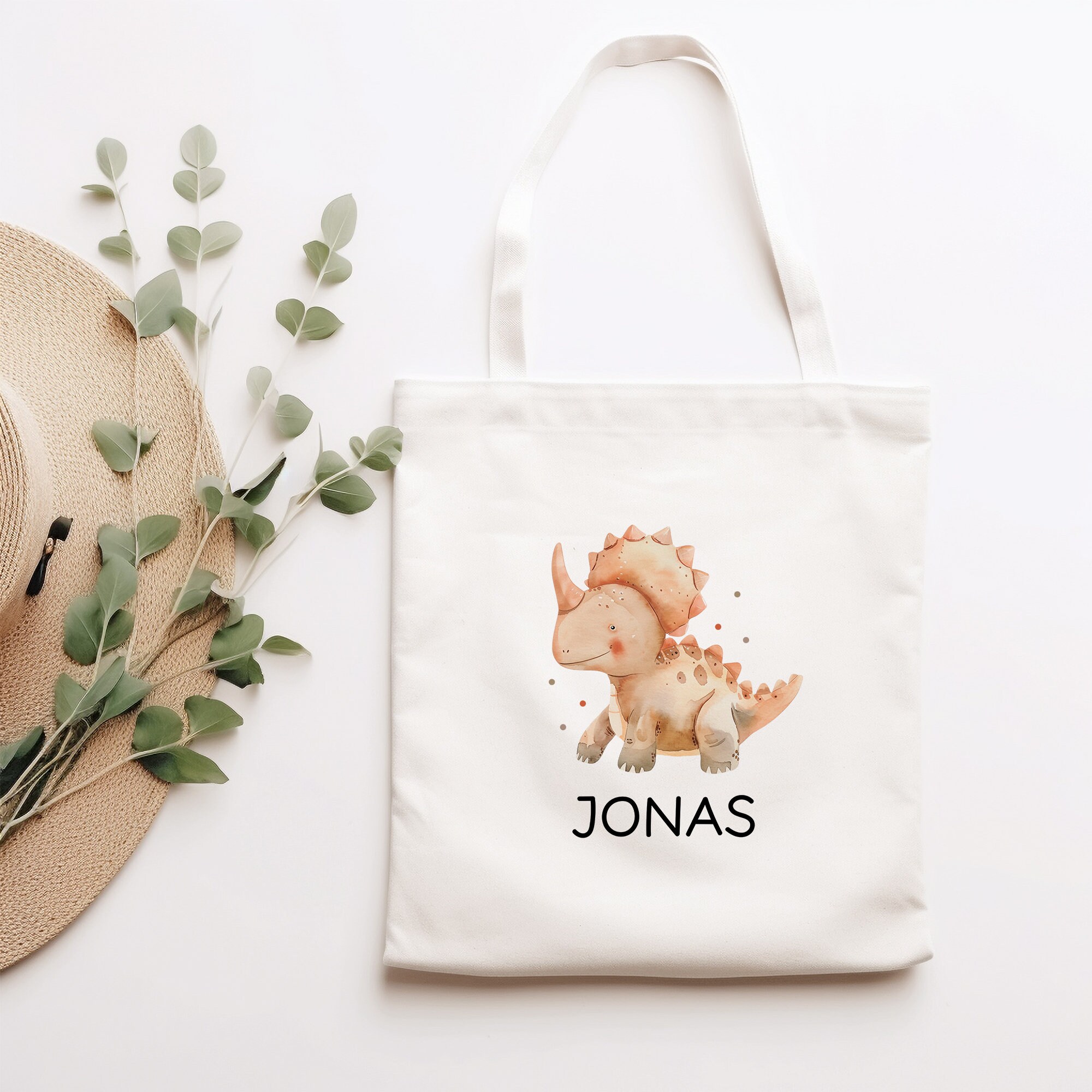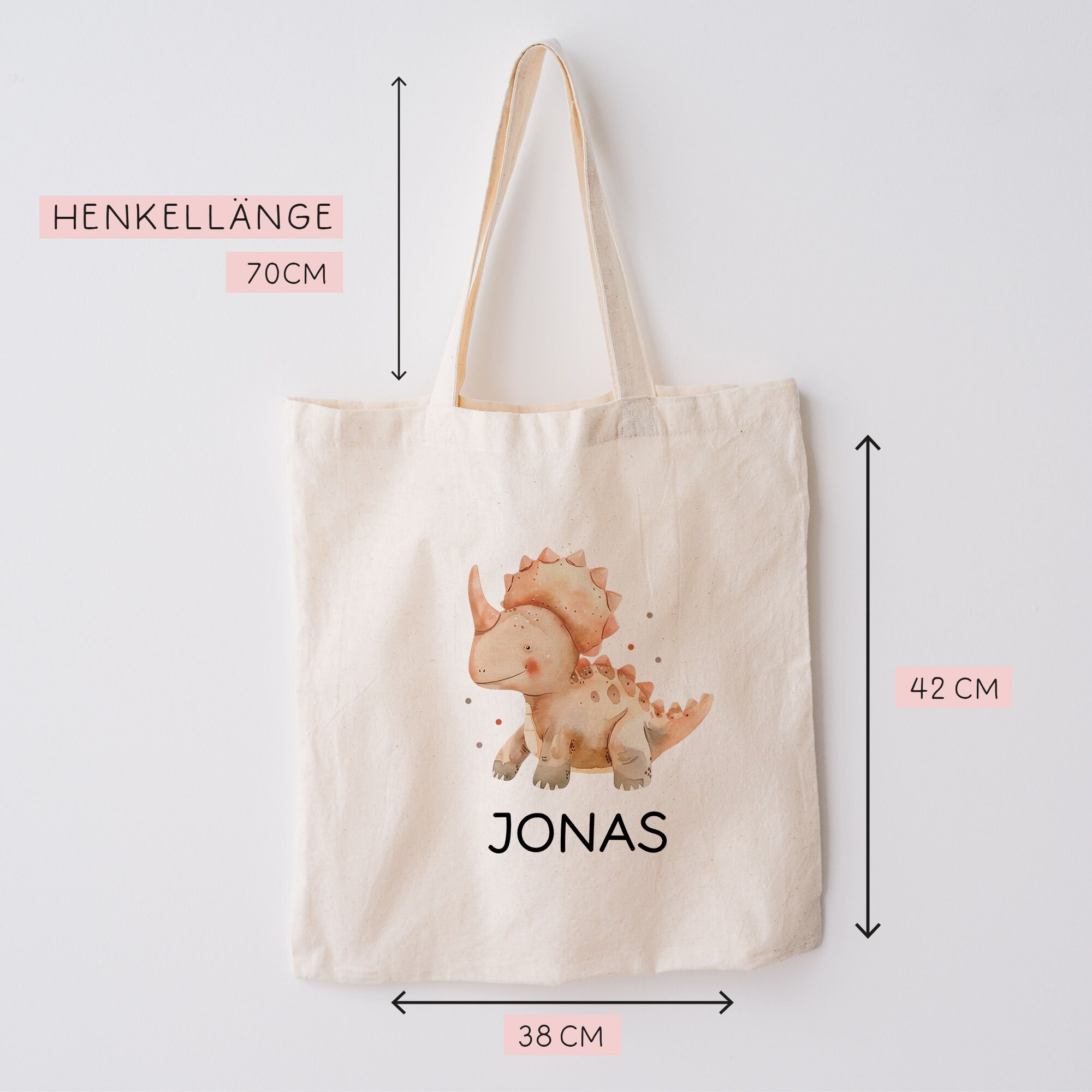 Der personalisierte Turnbeutel für Kinder ist vielseitig einsetzbar, besteht aus robuster Bio-Baumwolle und ist ein treuer Begleiter für unsere Kleinen. Er ist mit einem süßen Triceratops Dinosaurier und dem Namen des Kindes bedruckt.