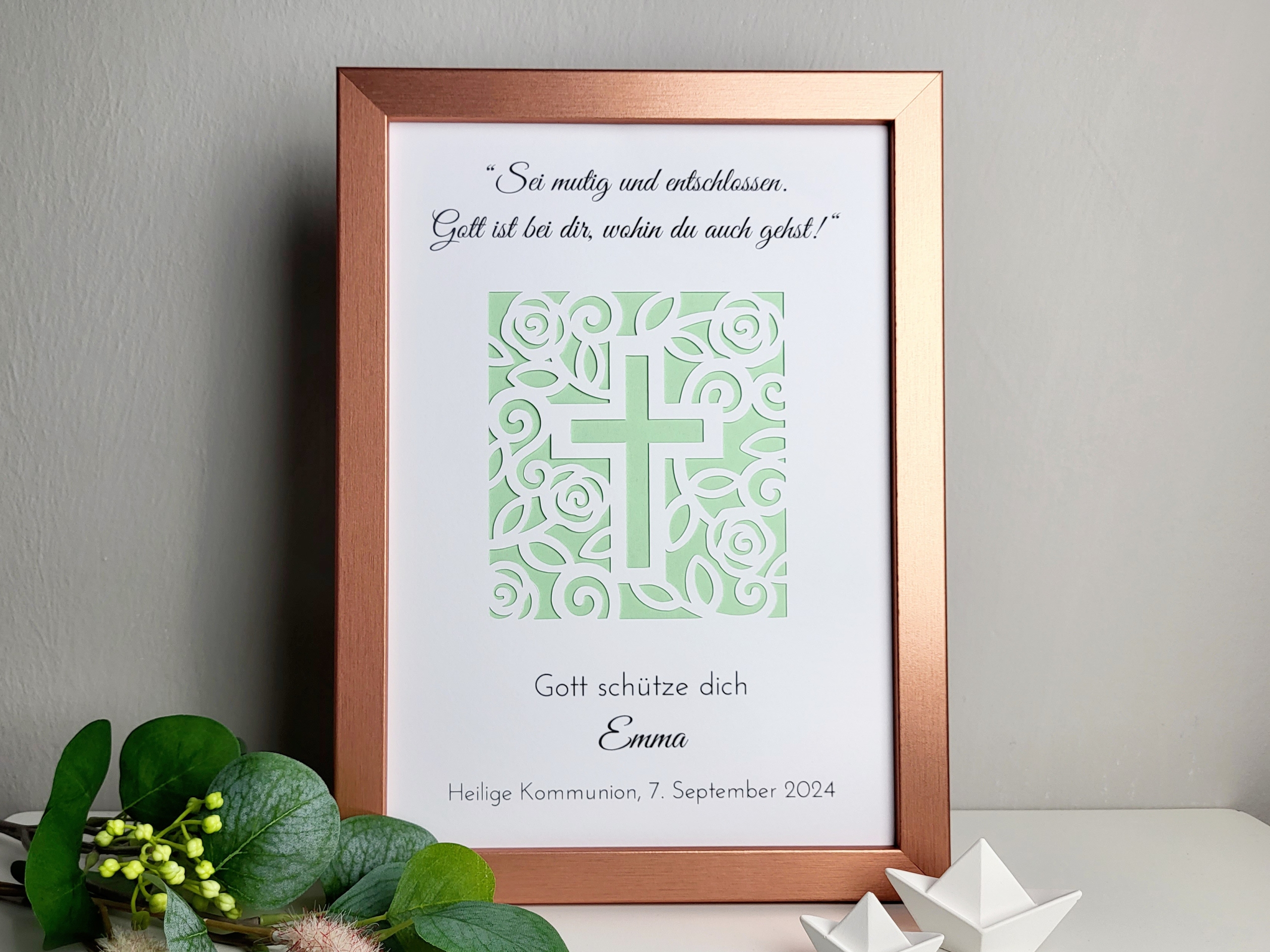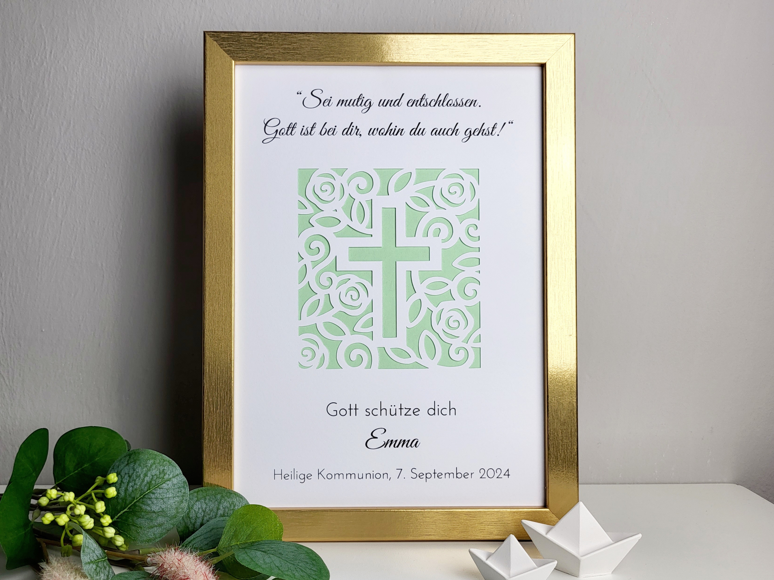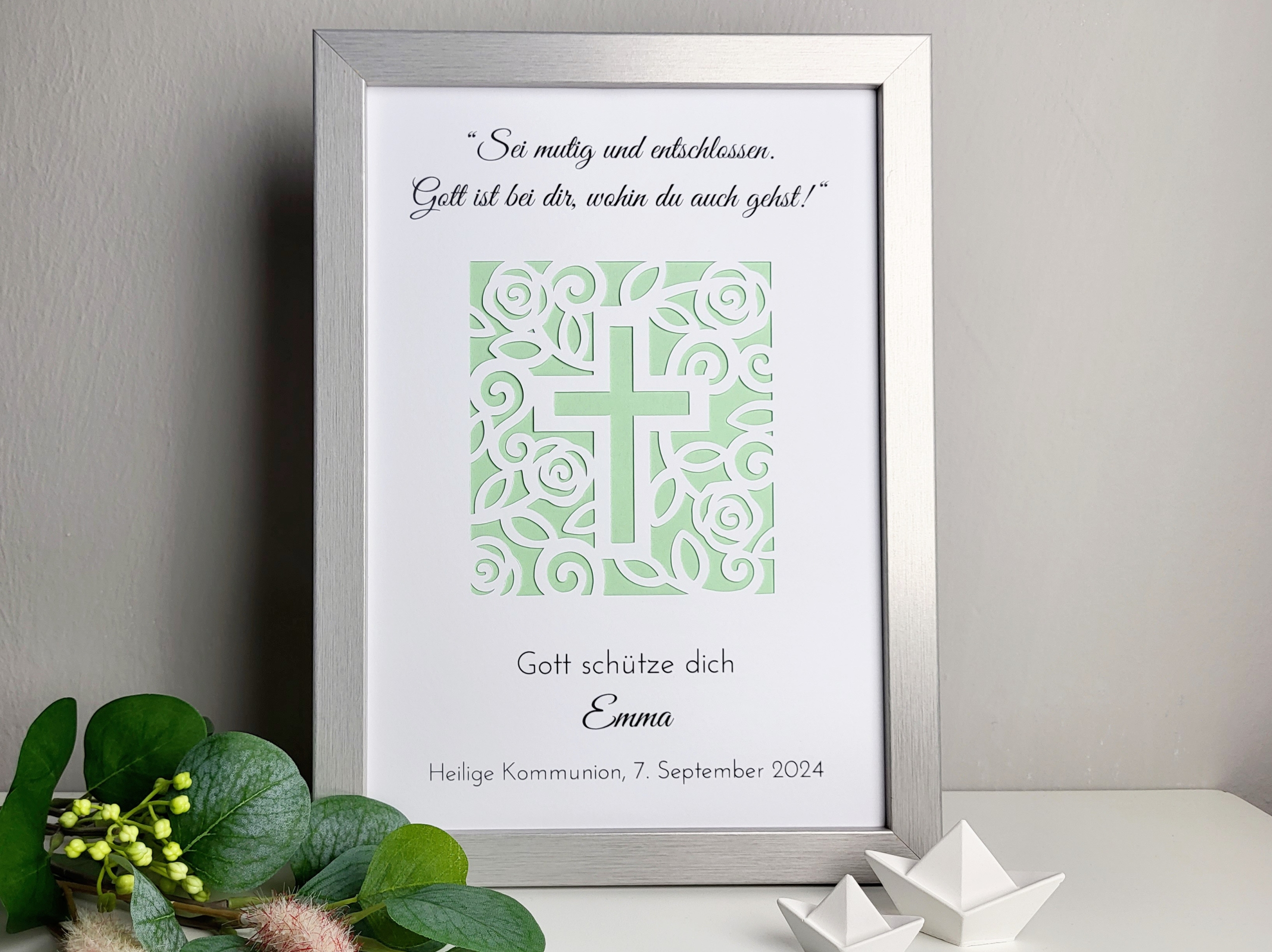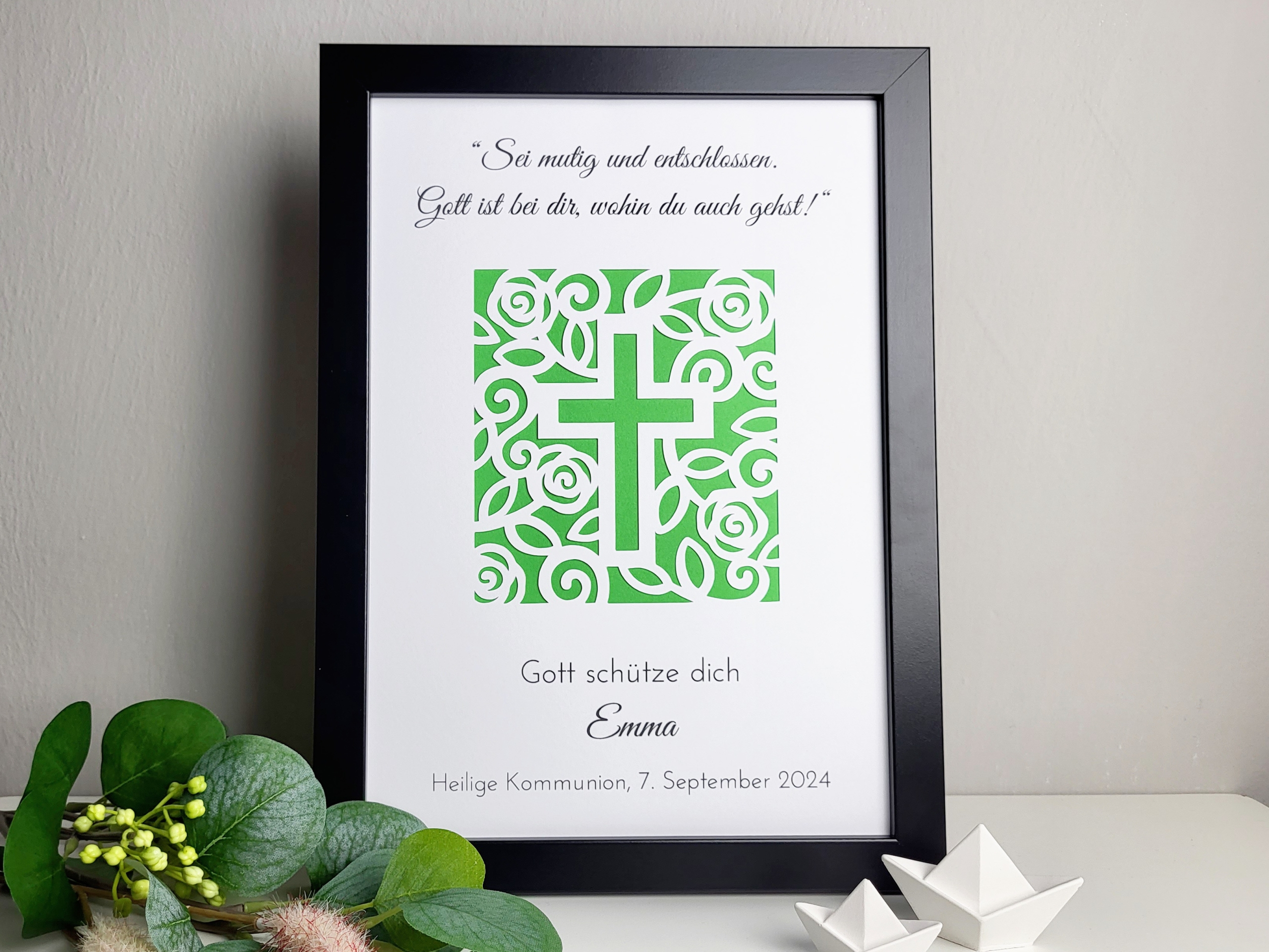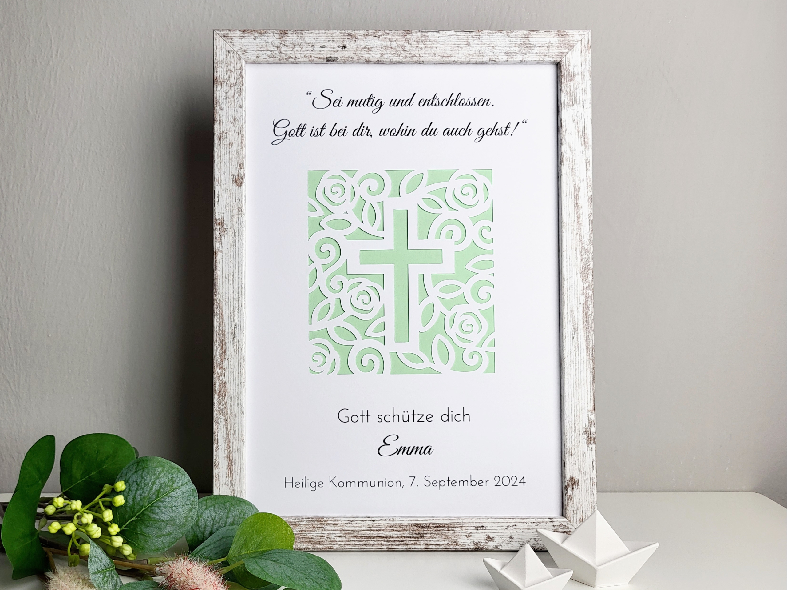 Das filigrane Kreuz aus Blumen steht für Segen, Hoffnung und Glauben – ein passendes Motiv für diesen wichtigen Lebensschritt. Durch die geschmackvolle Gestaltung wirkt der Rahmen edel und gleichzeitig herzlich, sodass er auch nach dem Fest als Erinnerung dekorativ aufgestellt werden kann.