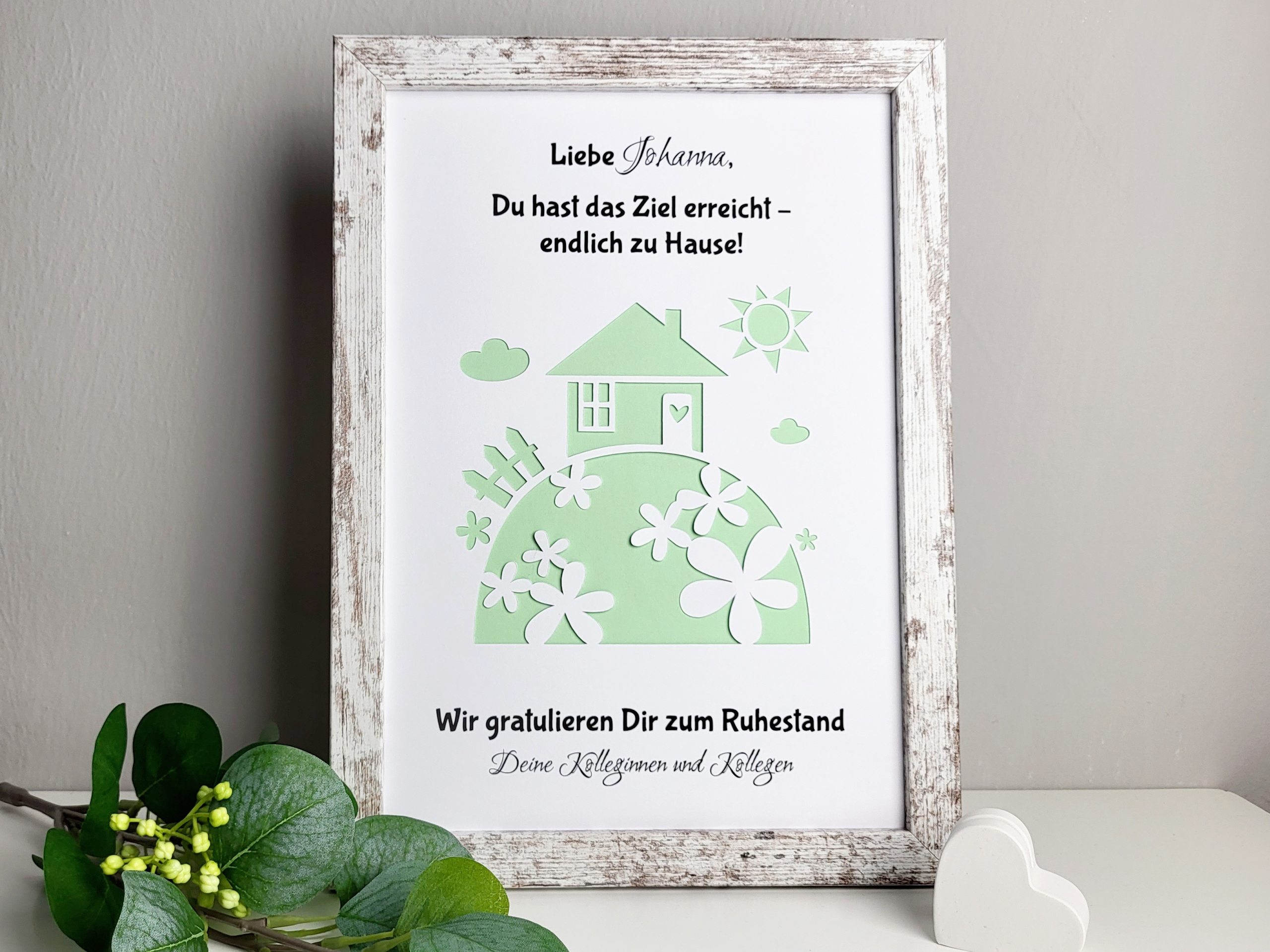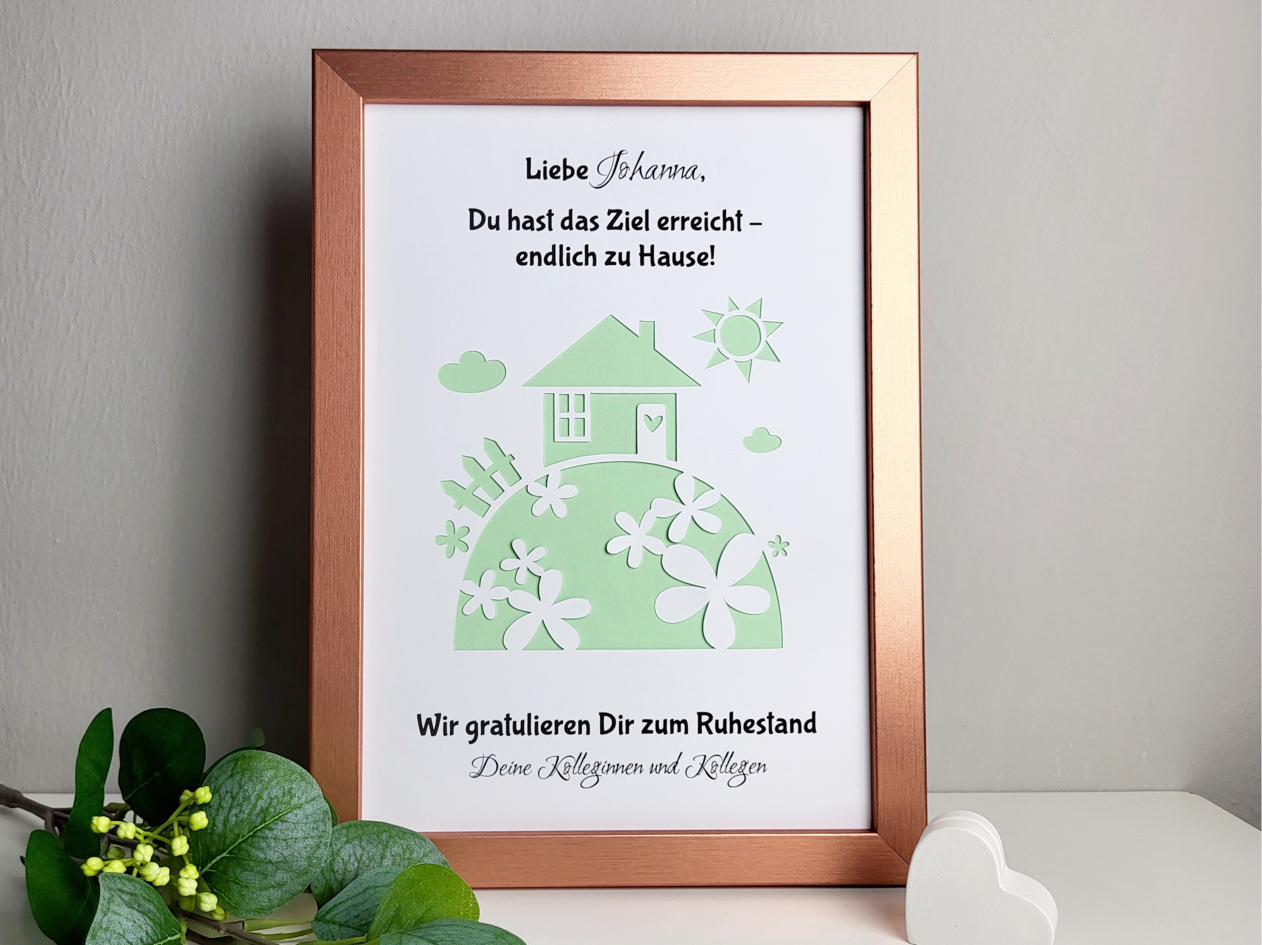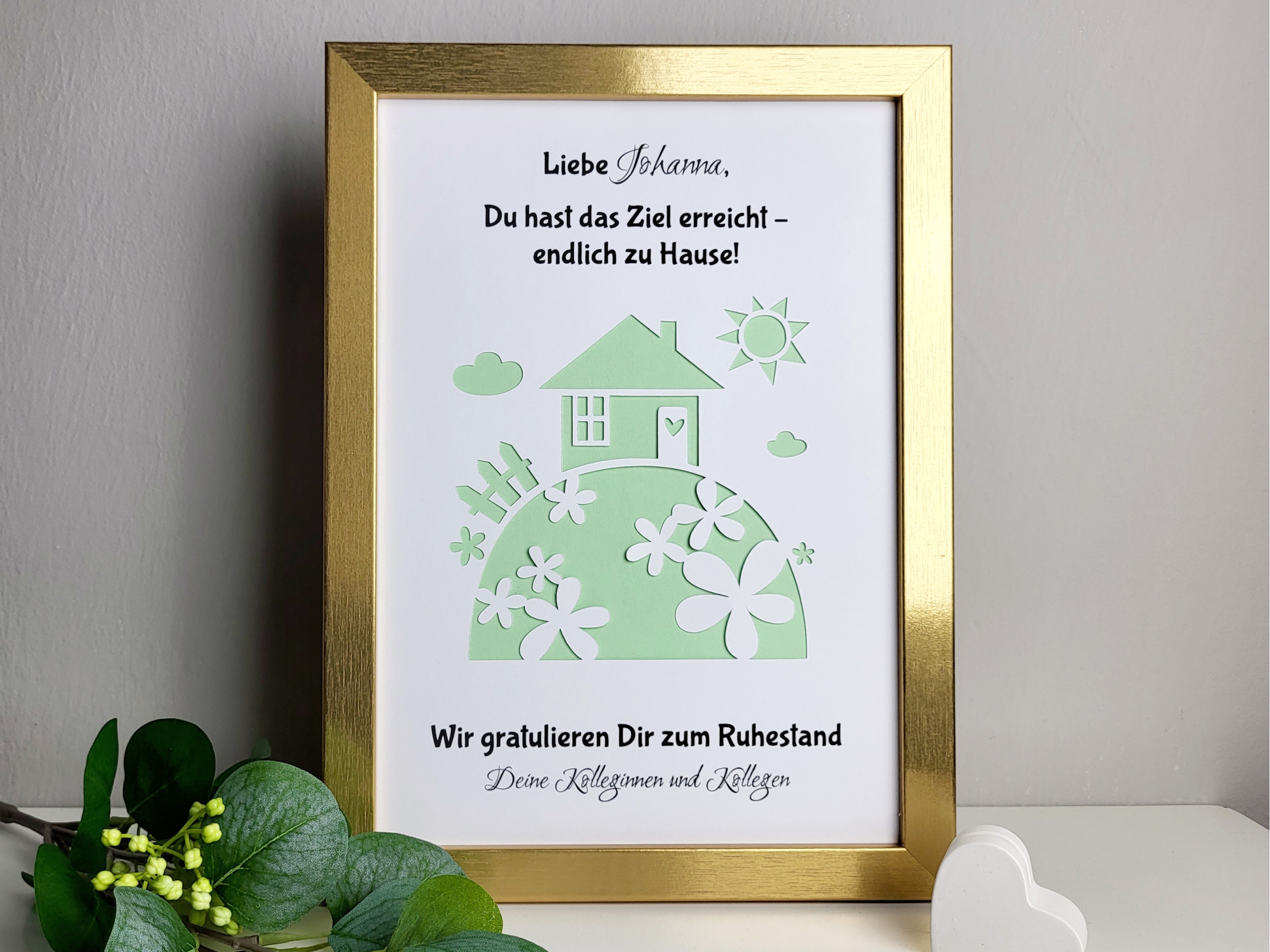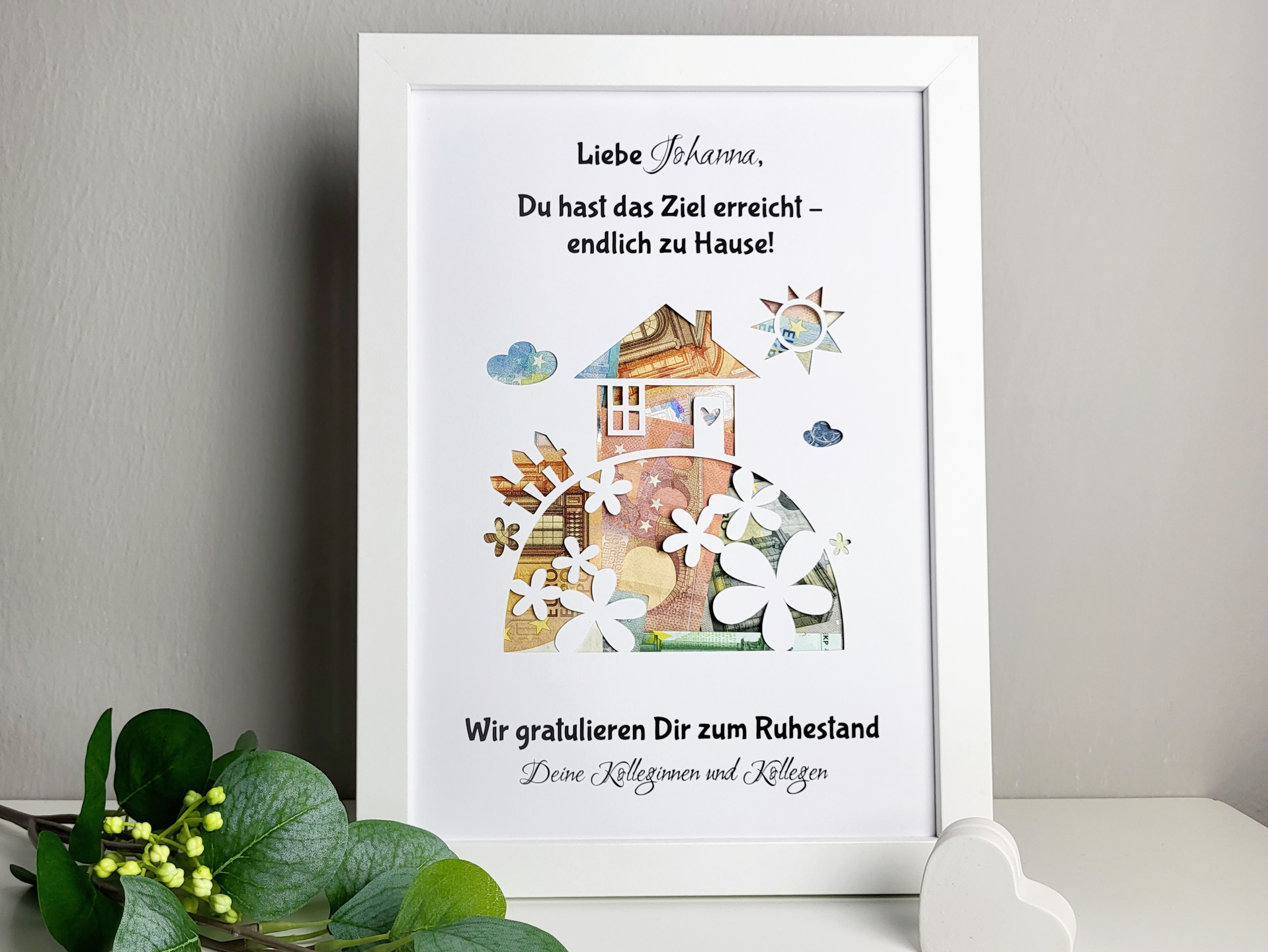 Überrasche einen frischgebackene(n) Ruheständler:in mit einem besonderen und liebevoll gestalteten Geldgeschenkrahmen. Das stilvolle Haus & Garten Motiv symbolisiert den neuen Lebensabschnitt: mehr Zeit zu Hause, Entspannung im Garten und endlich Raum für die schönen Dinge des Lebens. Eine kreative und persönliche Art, Geld zur Pensionierung zu verschenken.