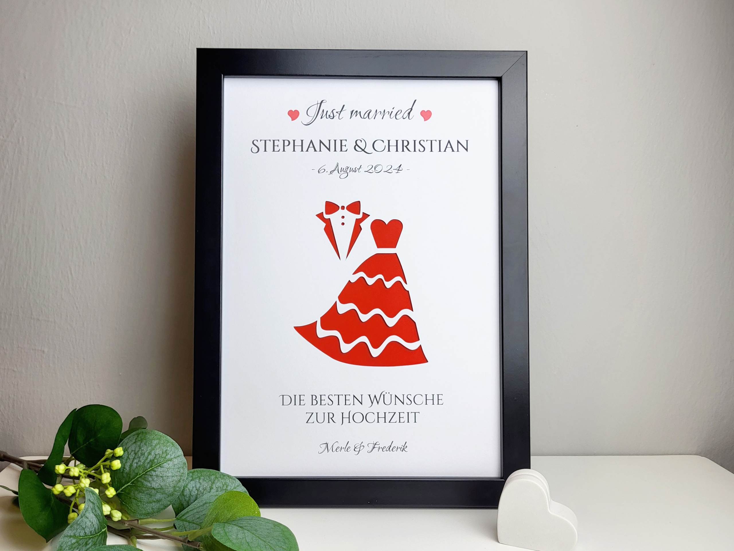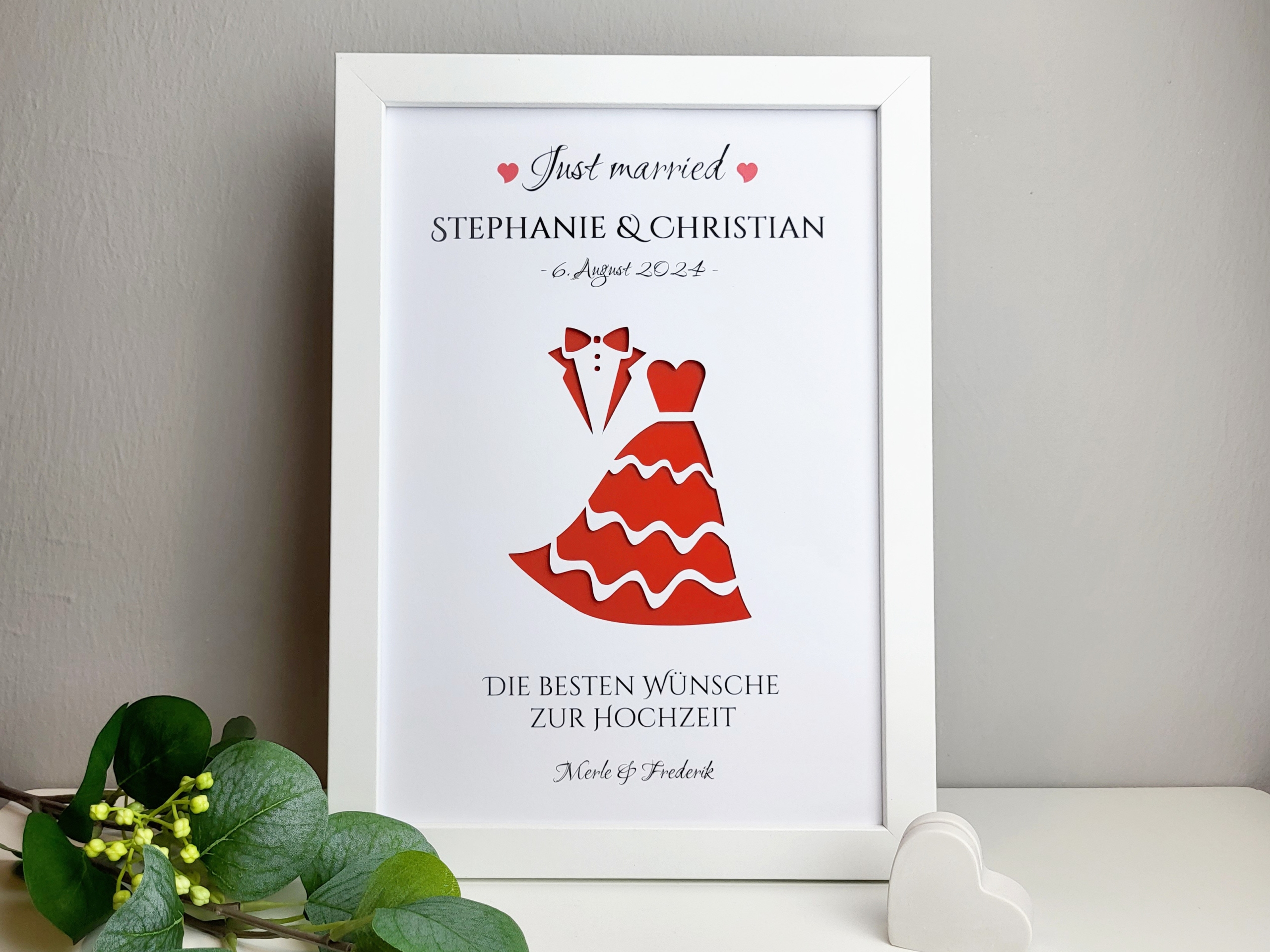 Mach' dein Hochzeitsgeschenk zu etwas ganz Besonderem! Mit diesem liebevoll gestalteten Geldgeschenkrahmen überreichst du Geld nicht einfach nur im Umschlag, sondern dekorativ und persönlich. Der Rahmen bietet Platz für Geldscheine, Fotos oder kleine Botschaften und wird so zu einem unvergesslichen Erinnerungsstück für das Brautpaar. Platziere Geldscheine hinter der bereits ausgeschnittenen Silhouette des Kleides und des Anzugs.