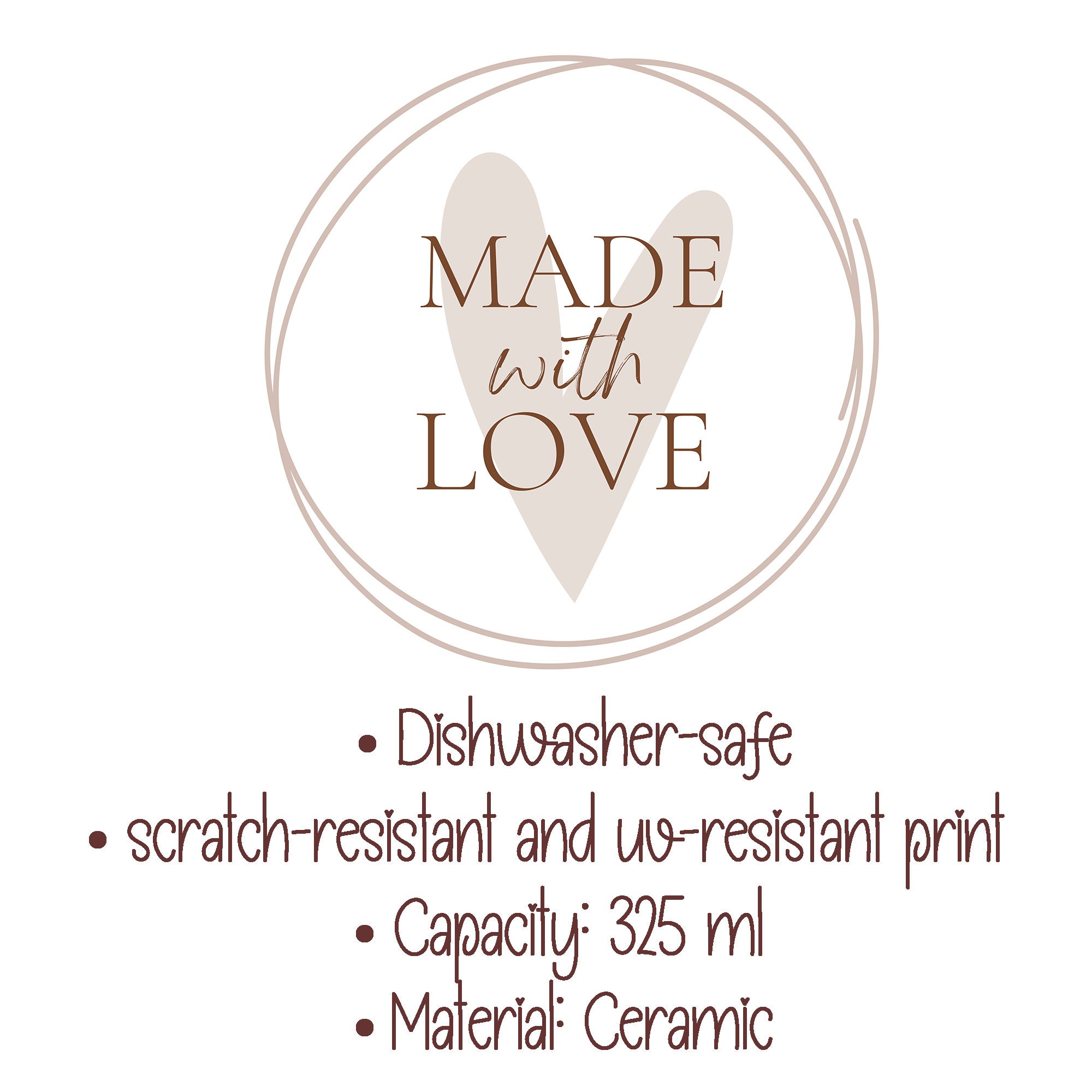 With a generous 325 ml capacity, this personalized mug offers the perfect space for your favourite drinks. Enjoy your morning coffee, a refreshing sip of milk or relax with a soothing tea - all in your unique, personalized mug.