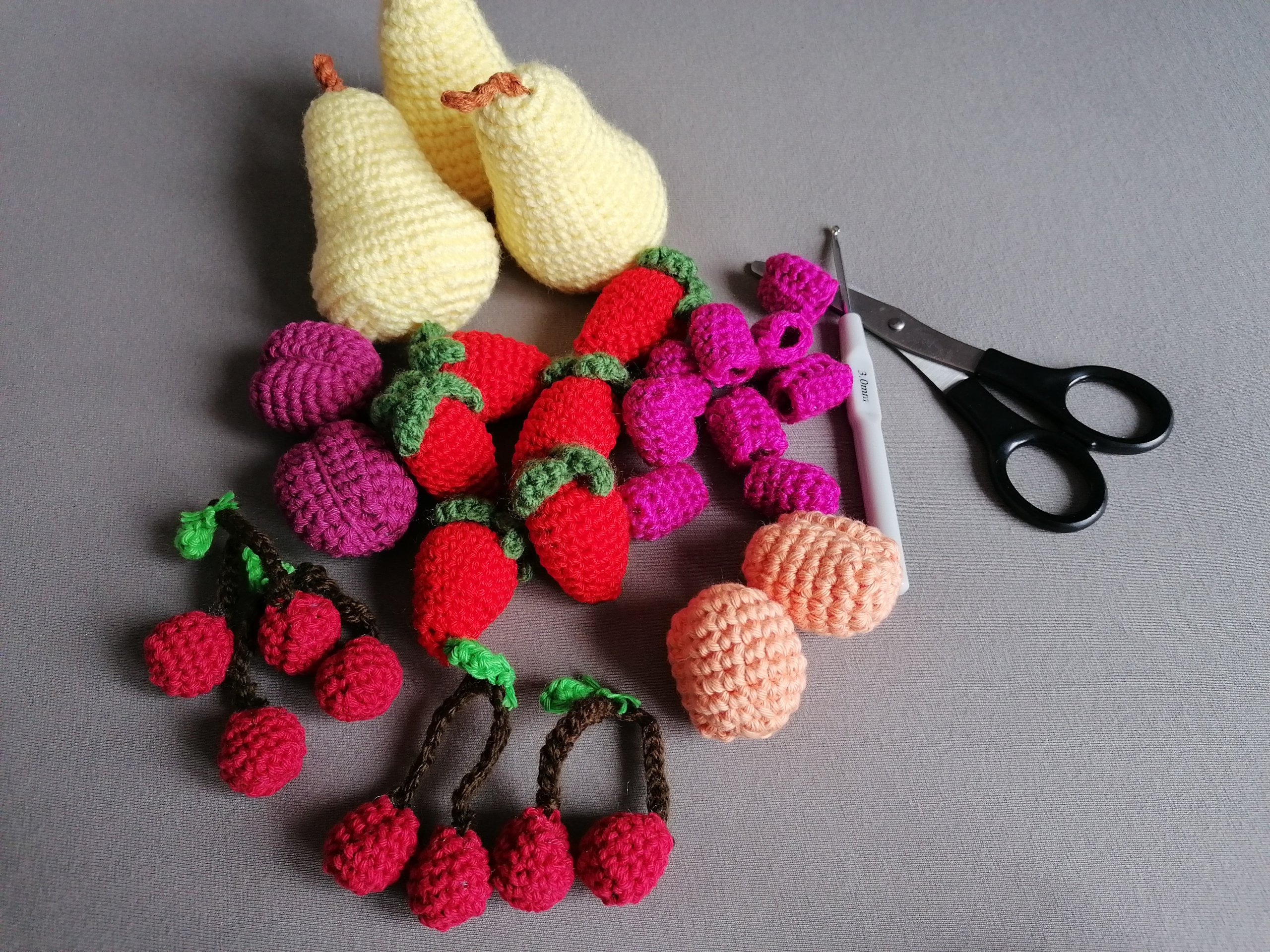 Zum Verkauf steht eine Vielzahl selbst gehäkelter Teile für den Kaufmannsladen oder die Kinderküche.
