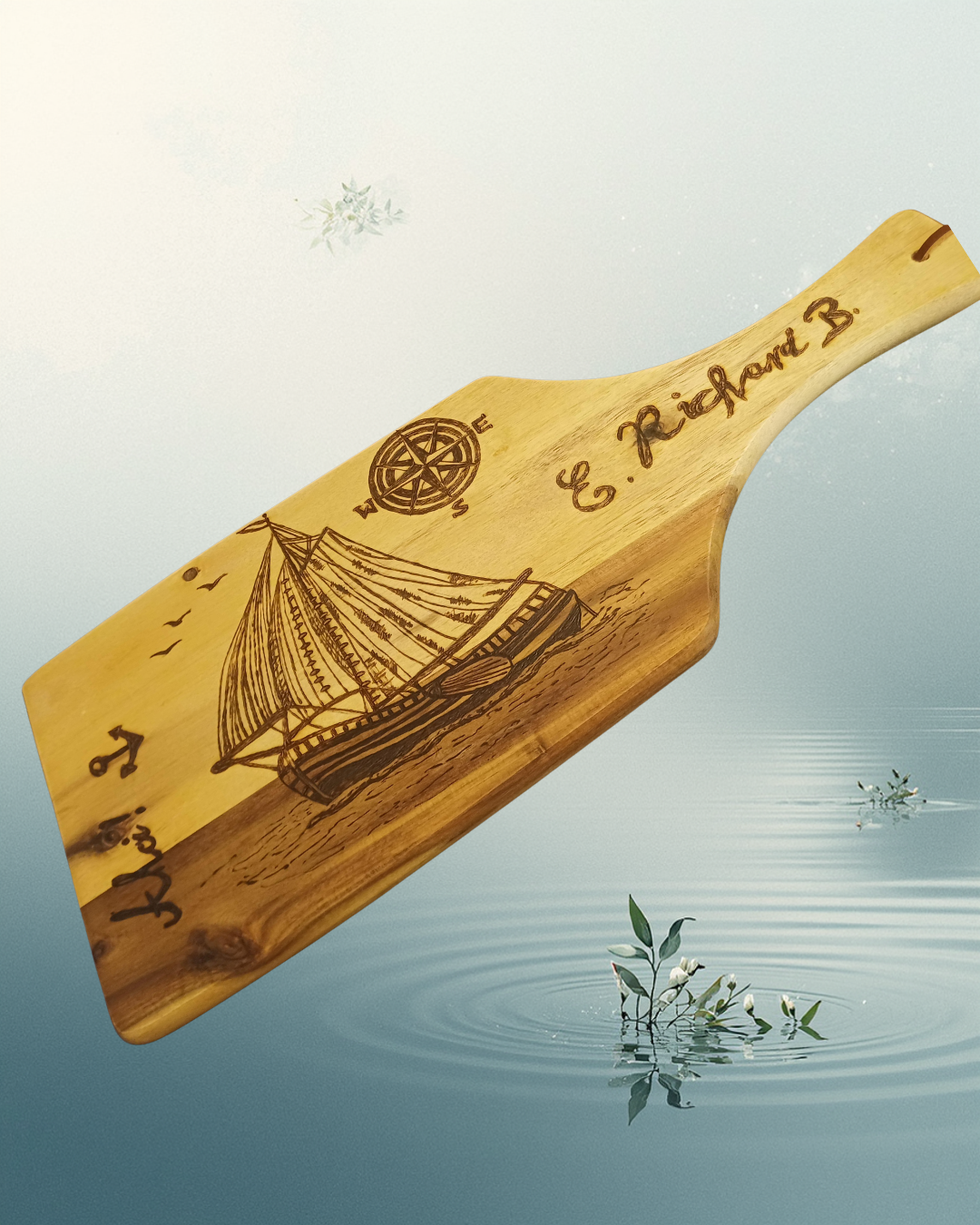 Ich verkaufe hier ein Schneidebrett mit einem Plattbodenschiff (gerne auch ein anderes Schiff) mit Individualisierung und Windrose.