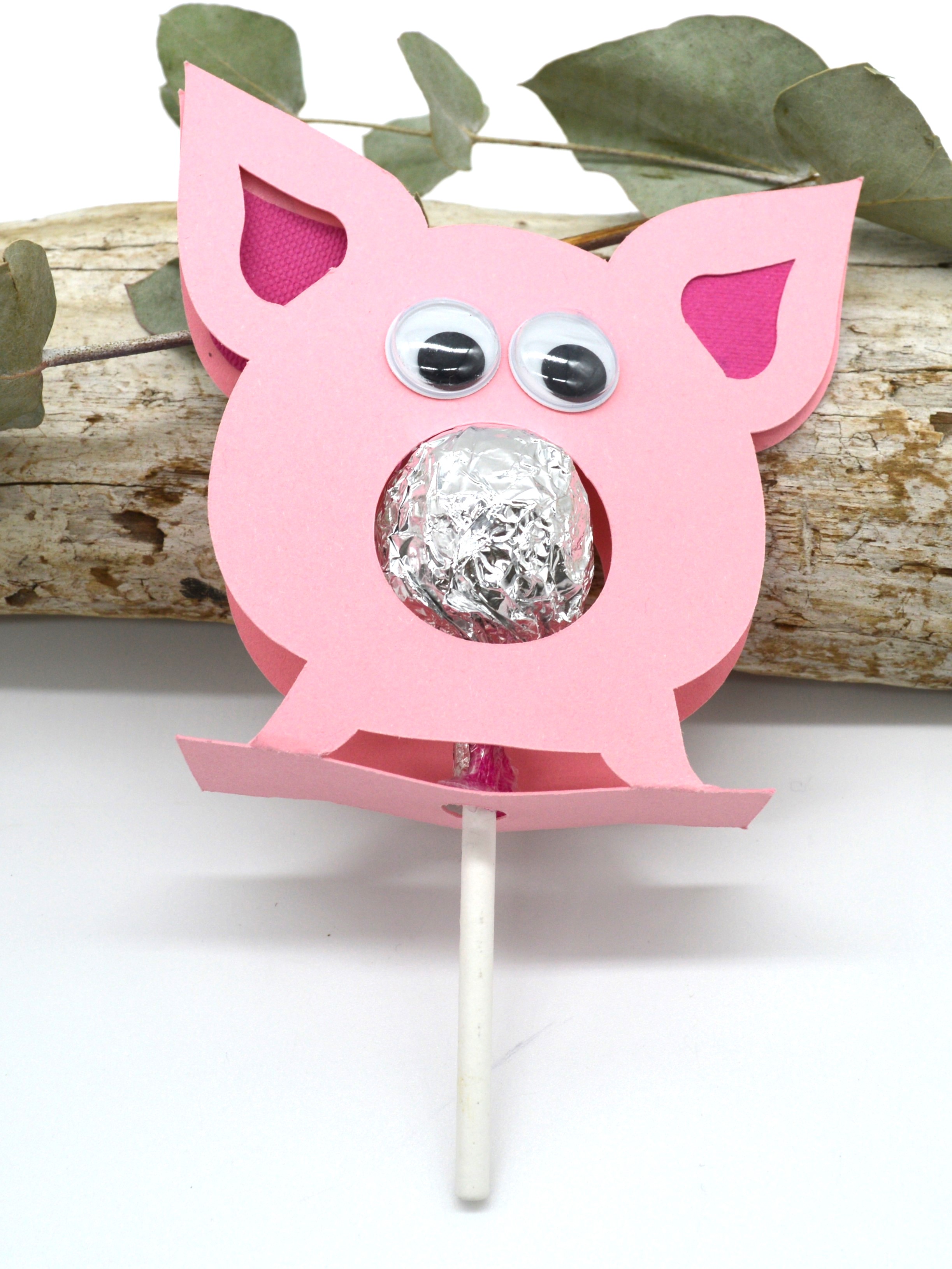 Süße Geschenkverpackung für einen Lutscher oder eine runde Schokopraline. Das Schwein dekoriert den Tisch zu Silvester oder anderen Gelegenheiten, wenn man Glück brauchen kann. Zusätzlich gibt es auch das Schweinchen für einen Lutscher.
