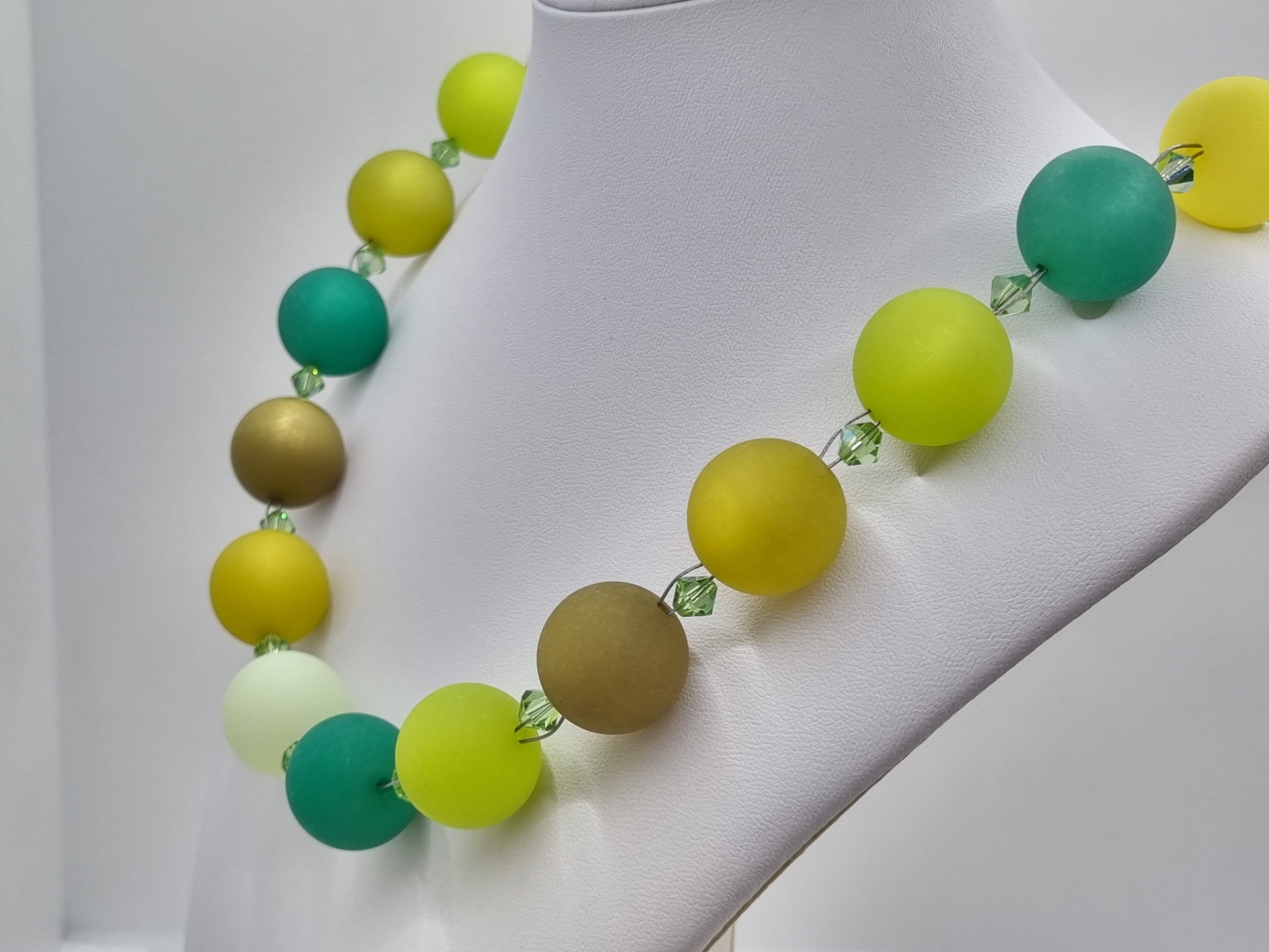 Erlebe einzigartigen Schmuck mit der Polariskette aus extra großen Polarisperlen in verschiedenen Grüntönen und funkelnden Bicone Kristallen in der Farbe Peridot.