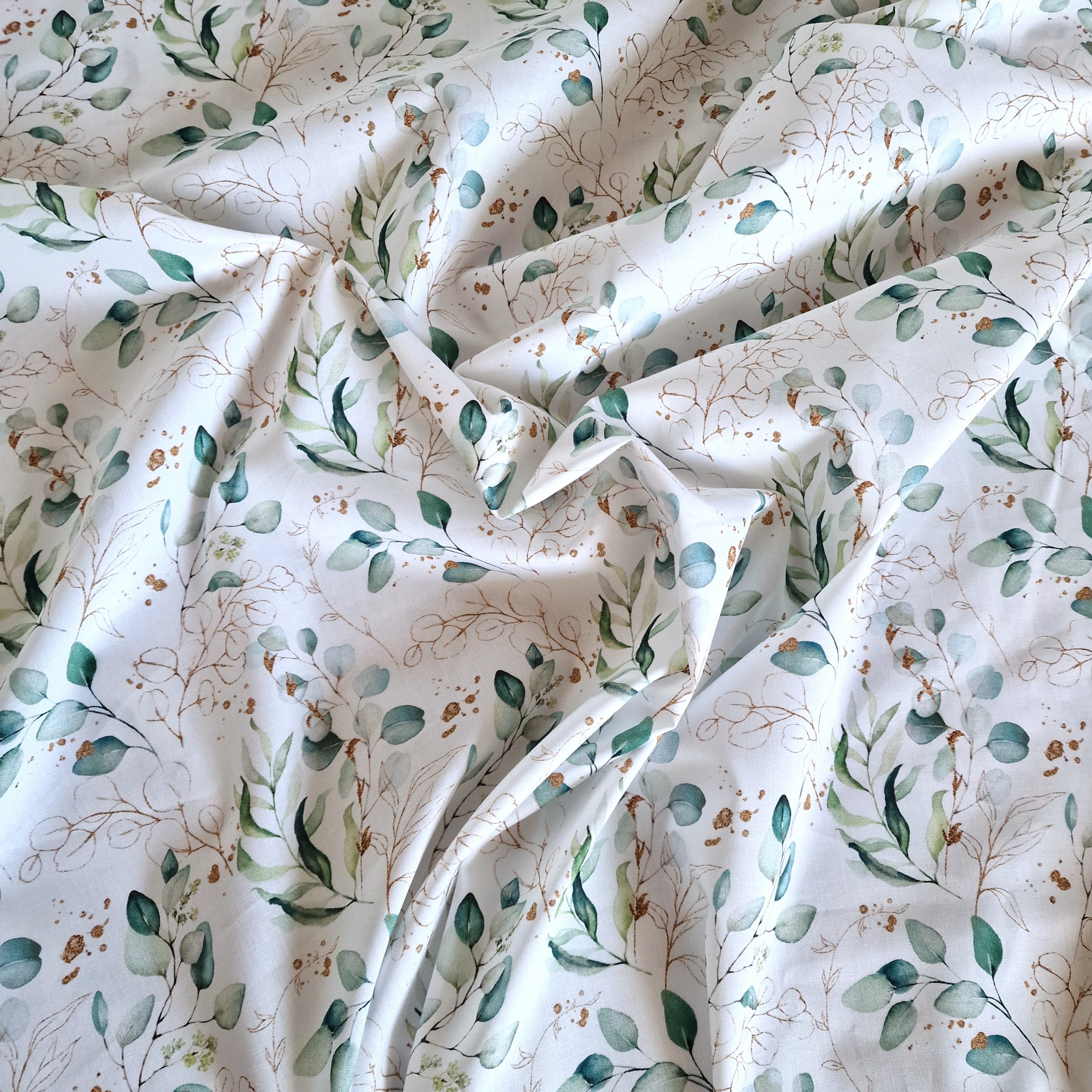 Verleihe deinen Nähprojekten eine frische, natürliche Note mit dieser hochwertigen Popeline aus merzerisierter Baumwolle. Das zarte Eukalyptus-Muster auf weißem Grund wirkt modern und beruhigend zugleich – ideal für stilvolle Kleidung, Heimtextilien oder Accessoires.