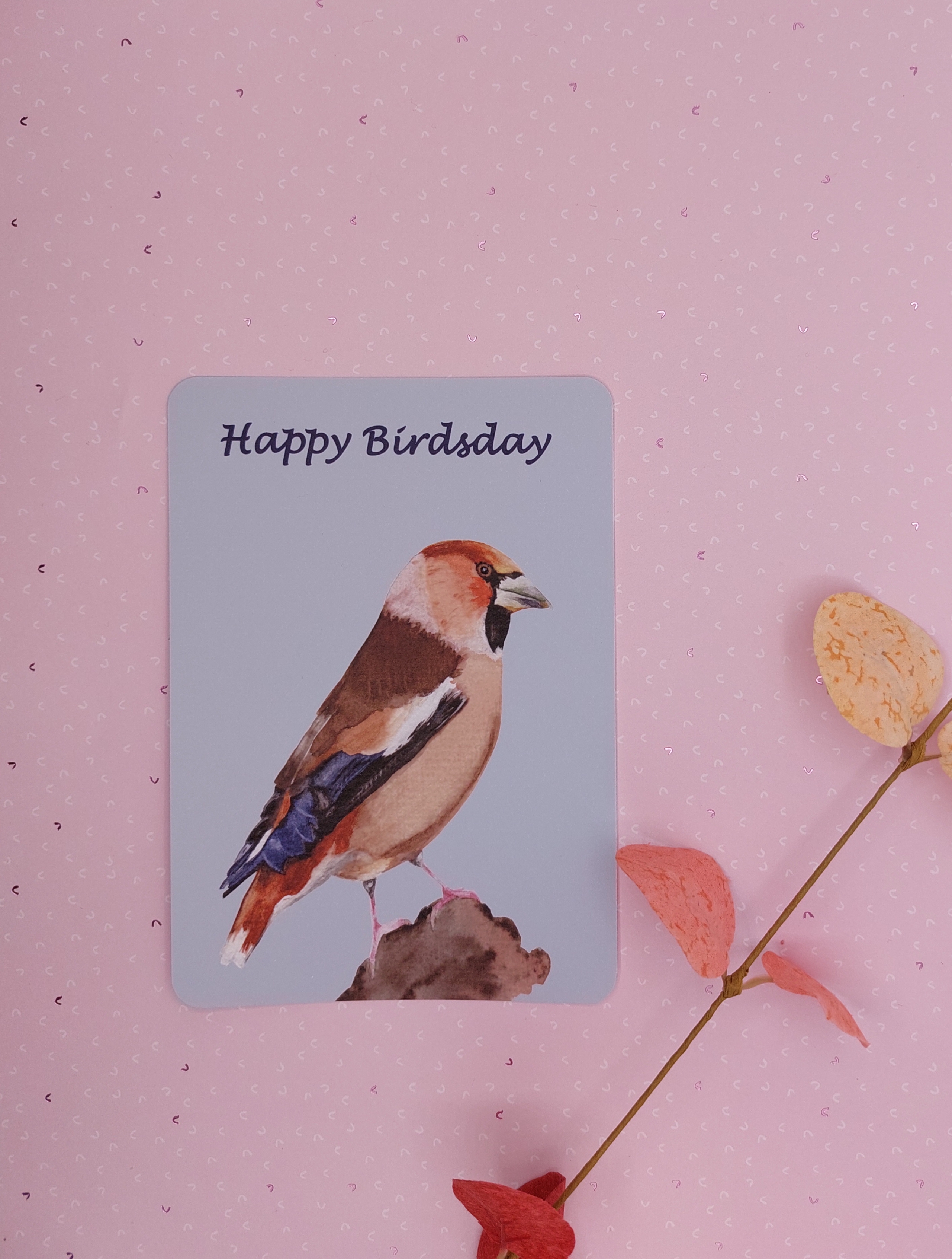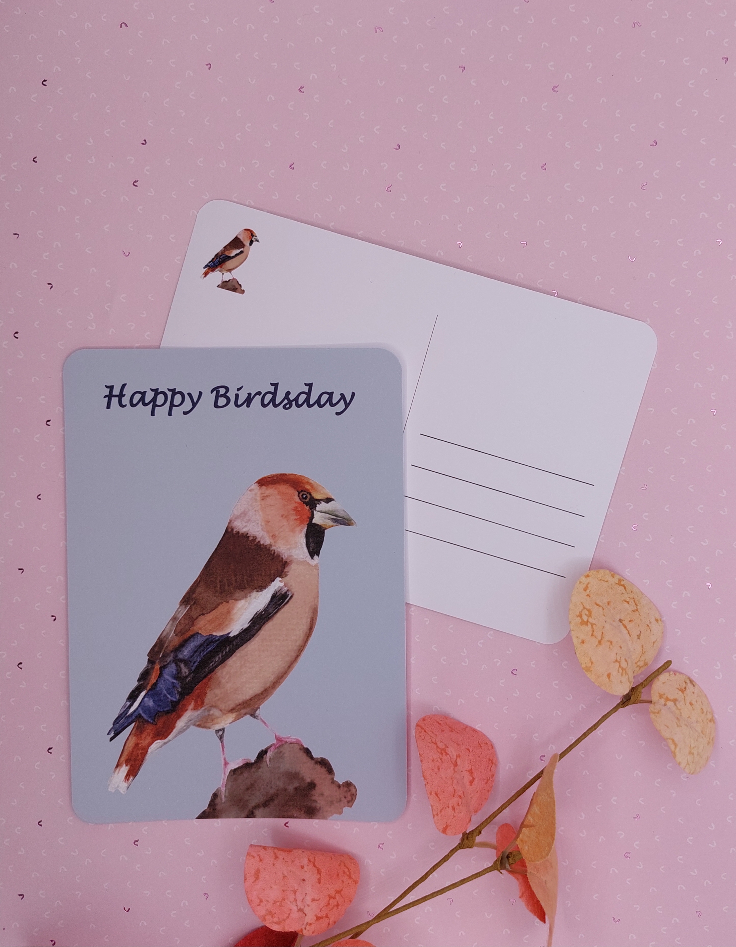 "Happy Birdsday" fand ich einfach total passend mit dem vorwitzigen Kernbeißer zusammen.