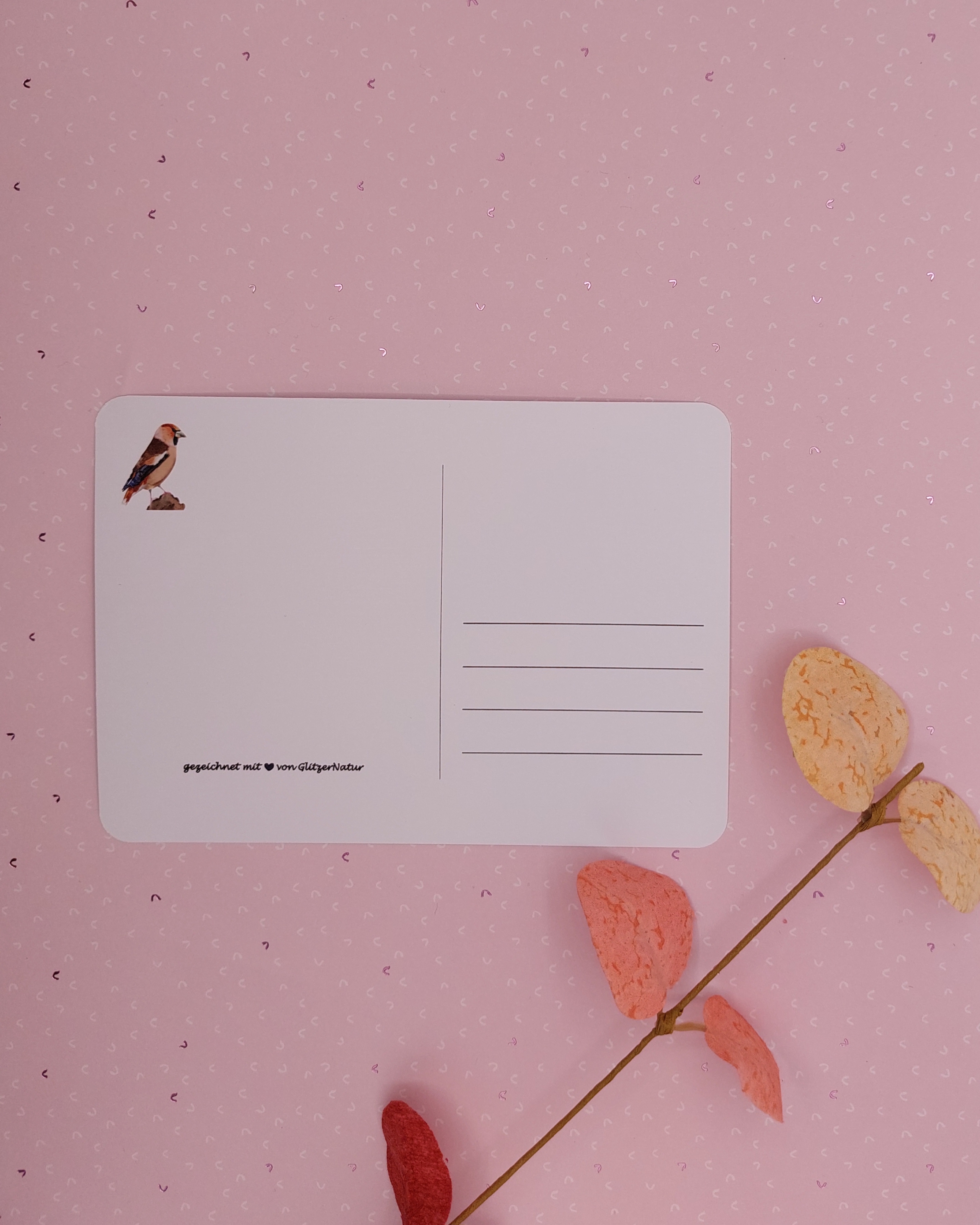 Ich bin Melanie und in meinem kleinen Atelier GlitzerNatur male ich liebend gerne mit Aquarell Farben. Dort ist auch dieser freche Kernbeißer entstanden.