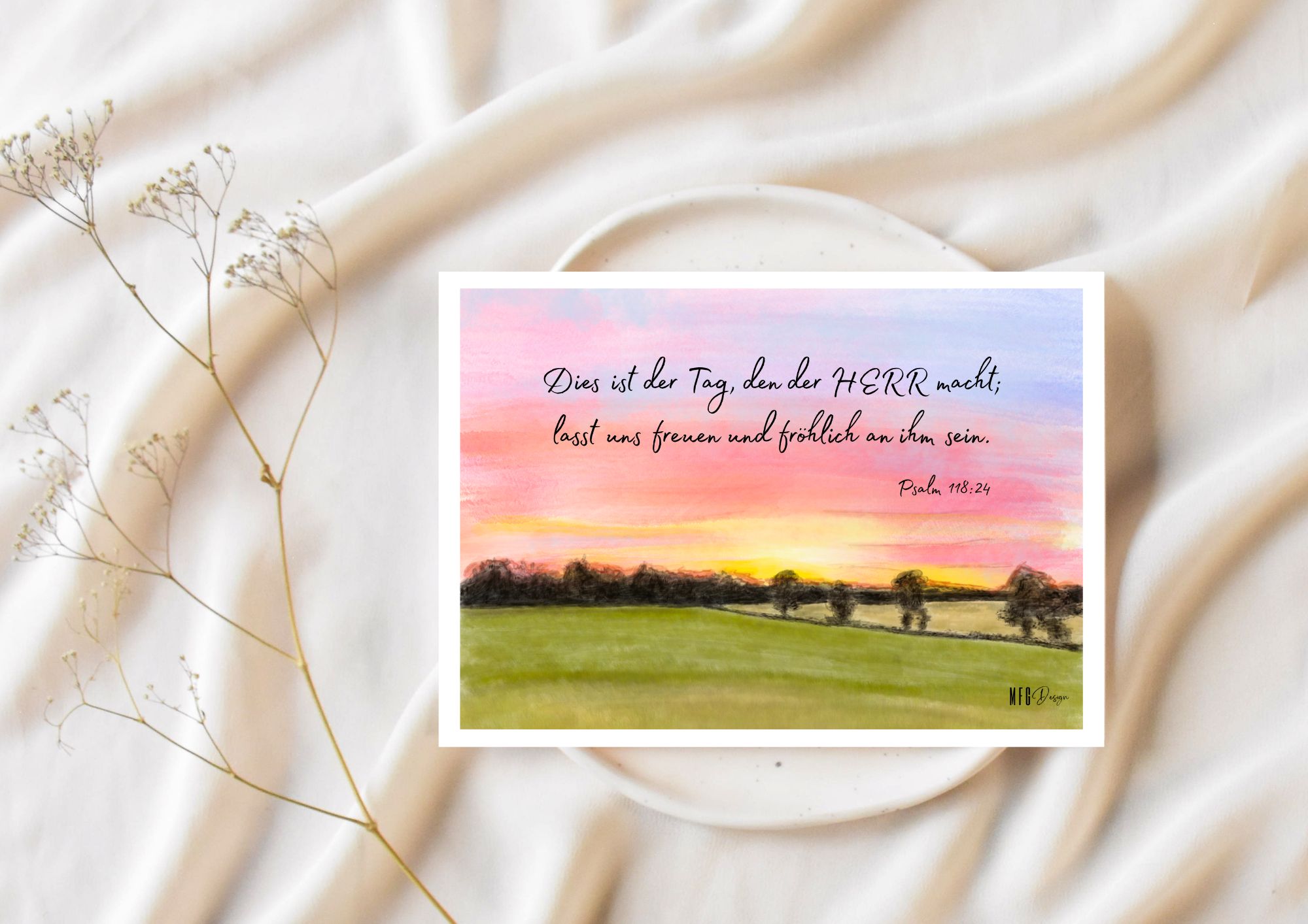Entdecke unsere wunderschöne Postkarte "Sonnenuntergang Süddänemark" – eine liebevoll handgezeichnetes Aquarellbild, die die atemberaubende Schönheit eines Sonnenuntergangs über den Feldern Süddänemarks einfängt. Diese einzigartige Karte ist mit einem inspirierenden Bibelvers versehen, der Hoffnung und Frieden vermittelt.