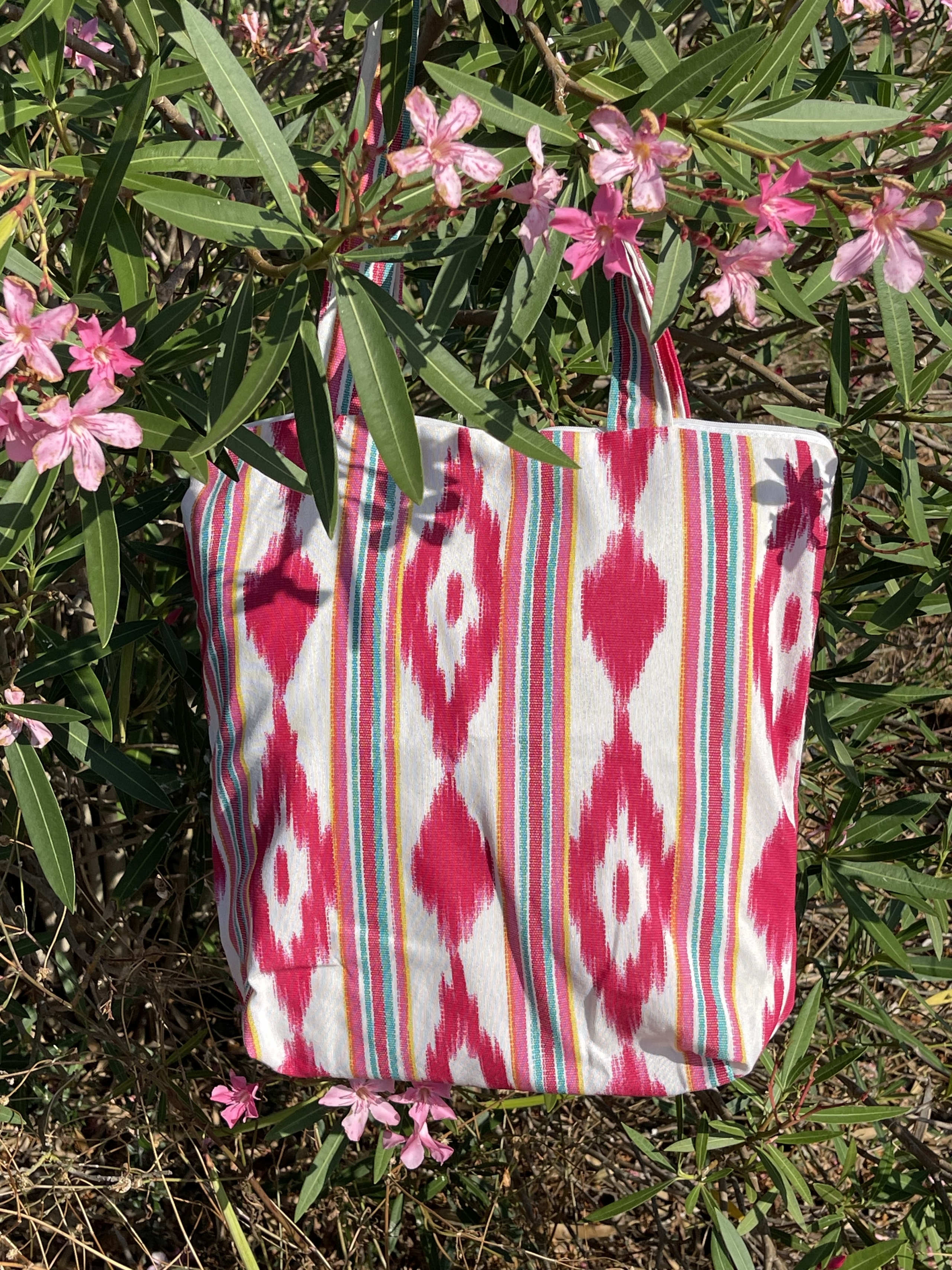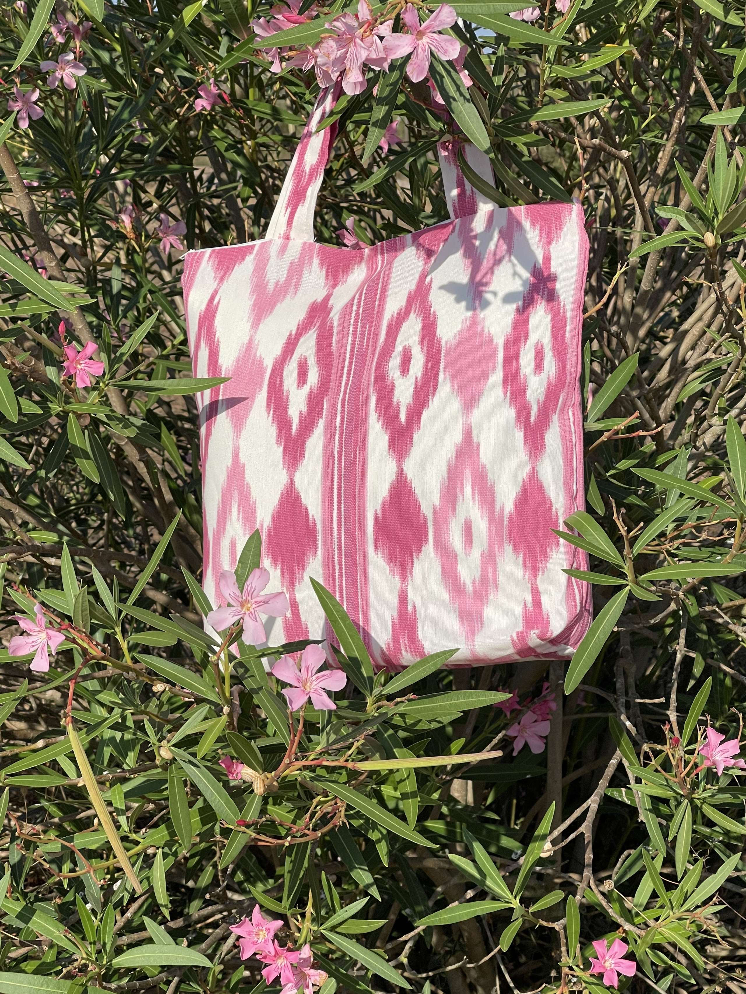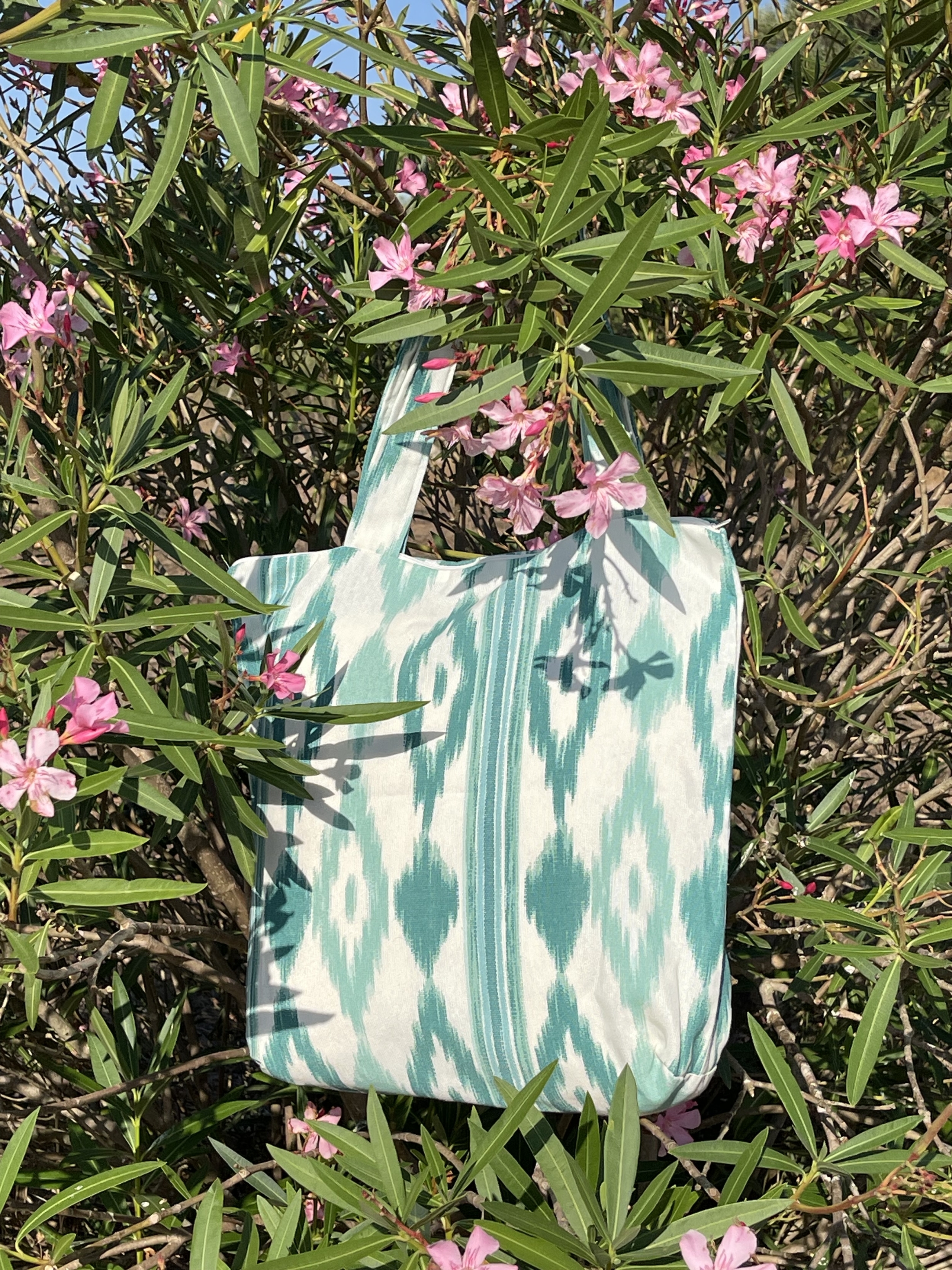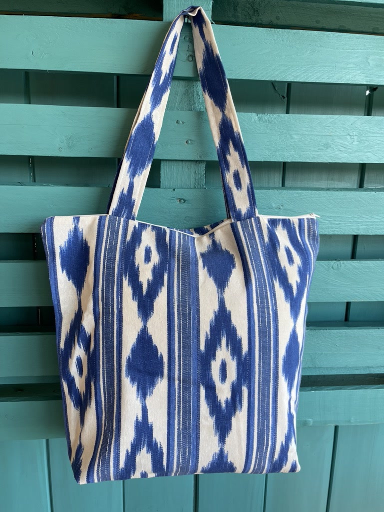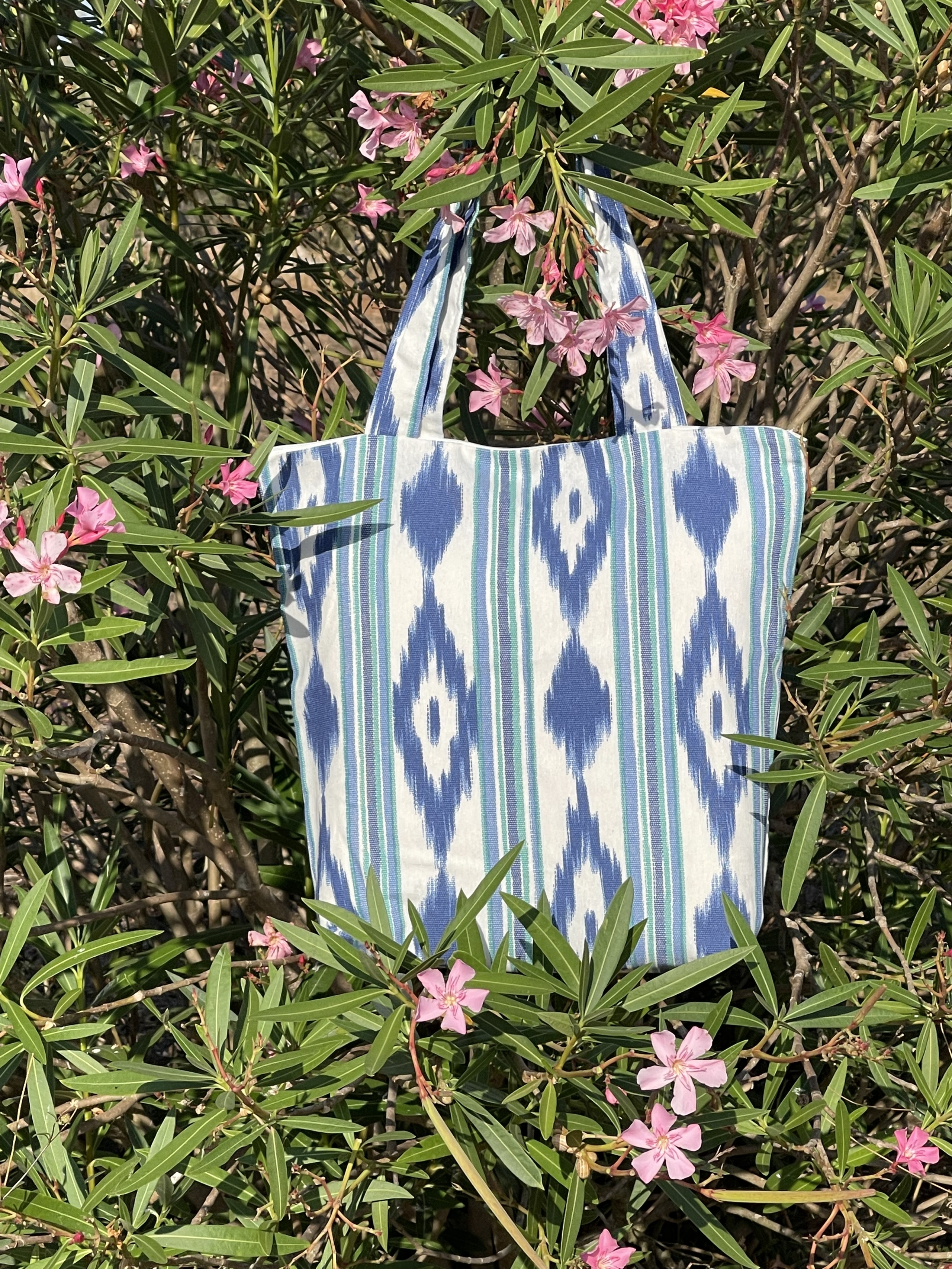 Schöne und praktische Einkaufstasche aus Telas de Lengua (Mallorca-Ikat oder Zungenstoff) – blau/weiß mit Baumwollhenkeln.