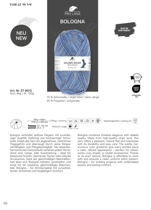 Entdecken Sie die neue, 4-fädige Sockenwolle "Bologna" von Pro Lana. Dezent gemustert, damit sind 2 gleiche Socken überhaupt kein Problem