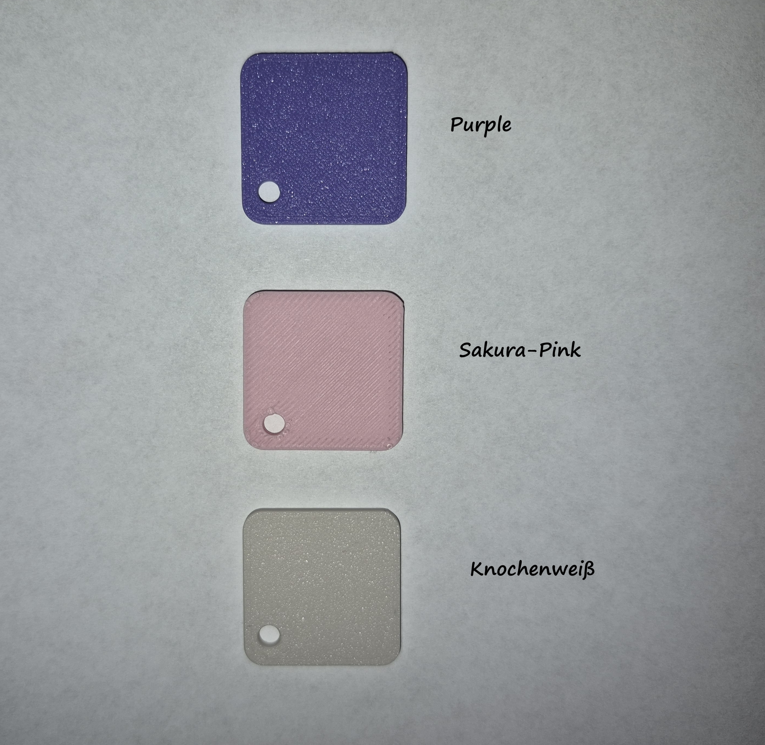 Die Farben wechseln nach Möglichkeit innerhalb der angegebenen Farbrange (Bild 12), die aktuelle Verfügbarkeit hängt von Marktlage und Filament-Lieferproblemen ab. Eine bestimmte Farbe ist nicht garantiert und bei Wunsch einer bestimmten Farbe könnten längere Lieferzeiten nötig werden. Sakura Pink ist nahezu aufgebraucht. Die nächste Produktcharge wird in Purple und Knochenweiß gedruckt.