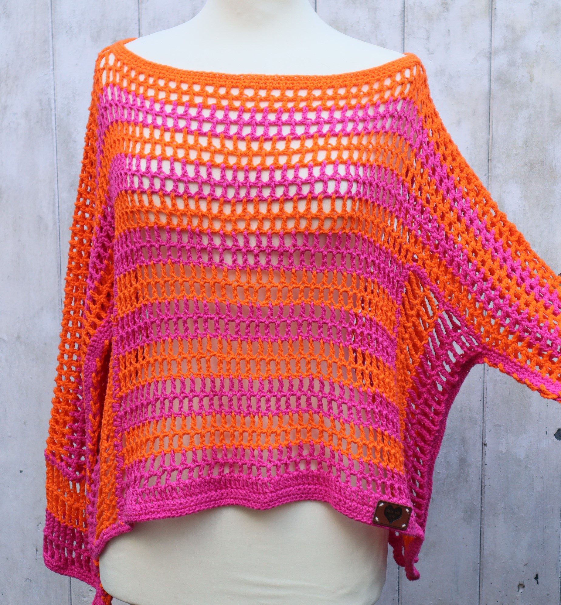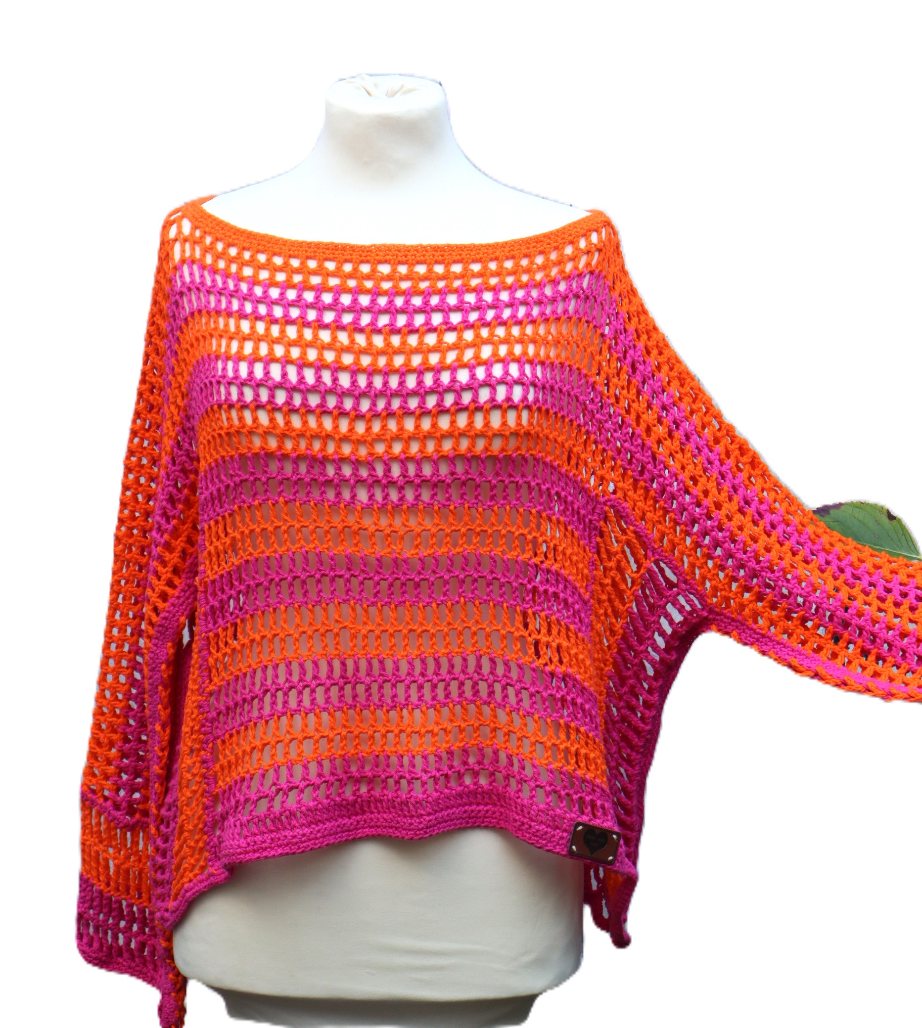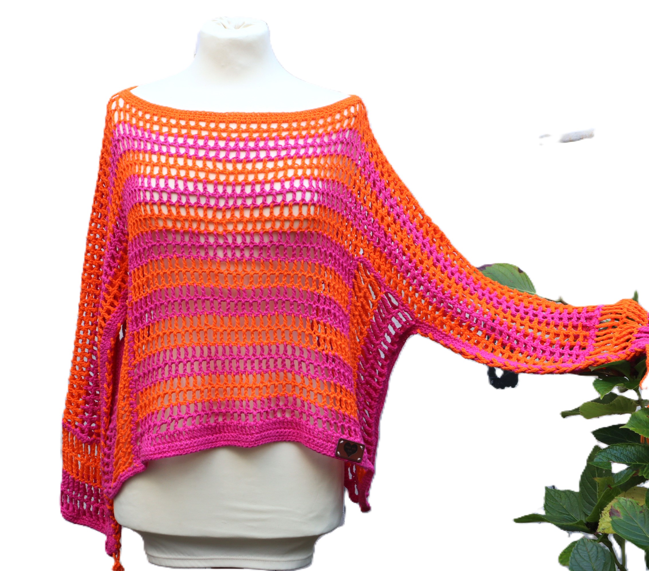 Liebevoll von Hand gehäkelter,luftiger Pullover in kräfitigen pink und orange Tönen .Die Unterseite der Ärmel habe ich nicht zugenäht , sondern eine gehäkelte Schüre eingezogen, so ergibt sich ein toller zusätzlicher Effekt. Das Oberteil wurde aus Baumwollgarn gehäkelt. Ein weiches Kuschelteil, das man schnell über ein Bikinioberteil oder ein anderes Top anziehen kann.