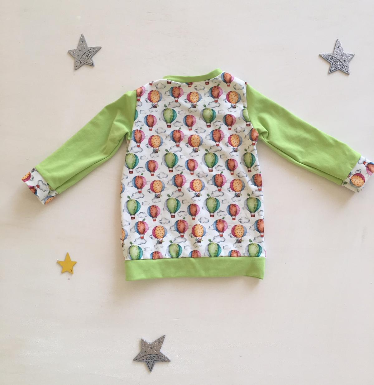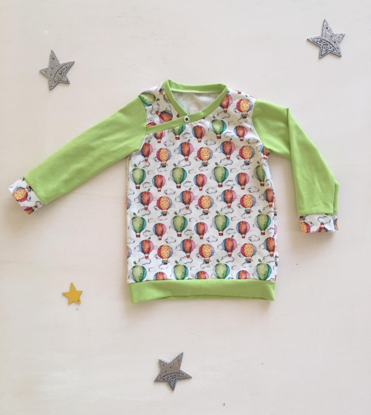 Das Shirt ist mit einem asymmetrischen Halsausschnitt genäht. Am Ausschnitt ist ein Druckknopf mit Sternmotiv um das Anziehen zu erleichtern. Der Kombistoff ist limette, beide Stoffe sind aus Jersey.