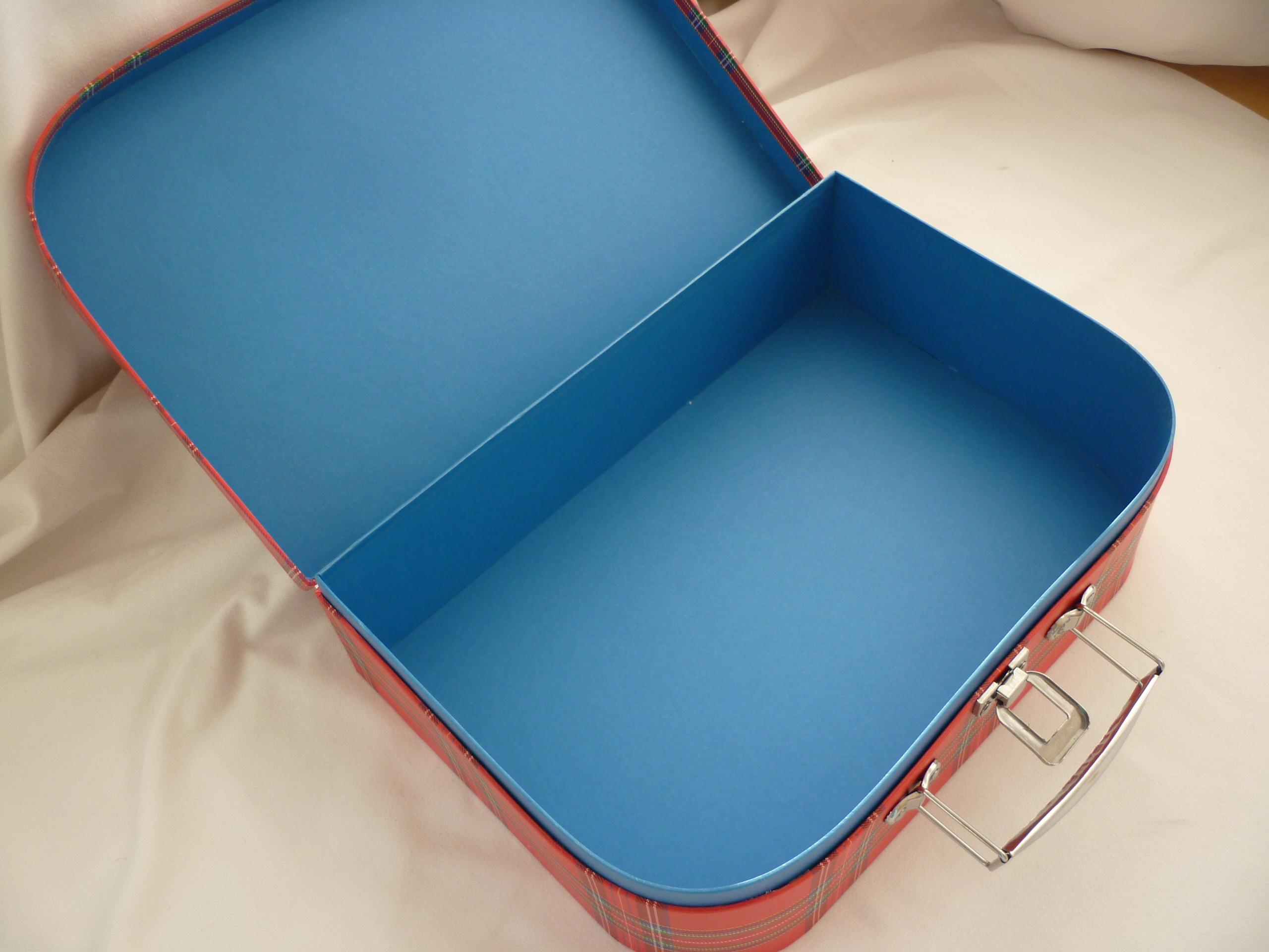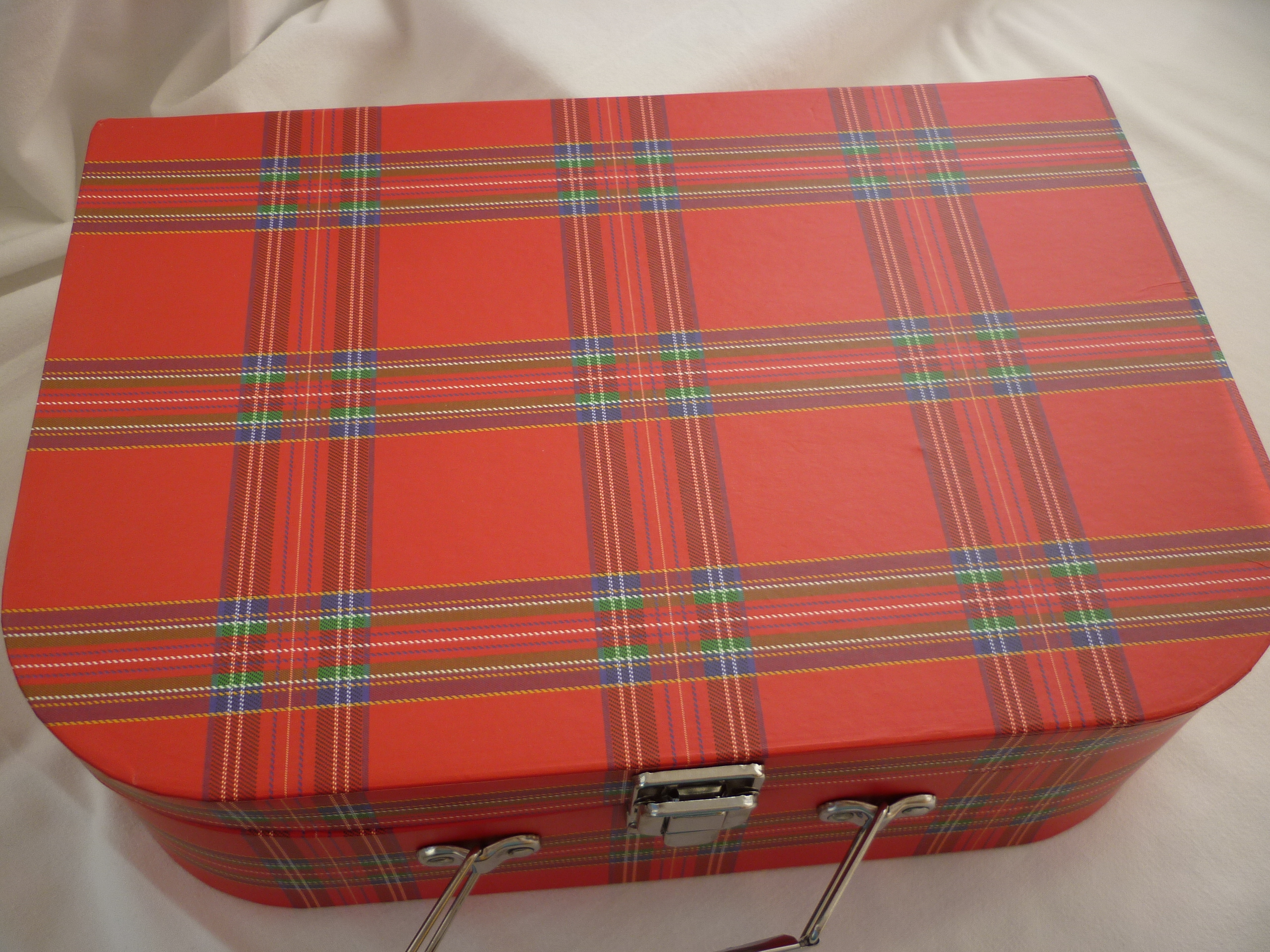 Koffer von goki. Grundfarbe rot, Pappe, Metallverschluss und -griff.