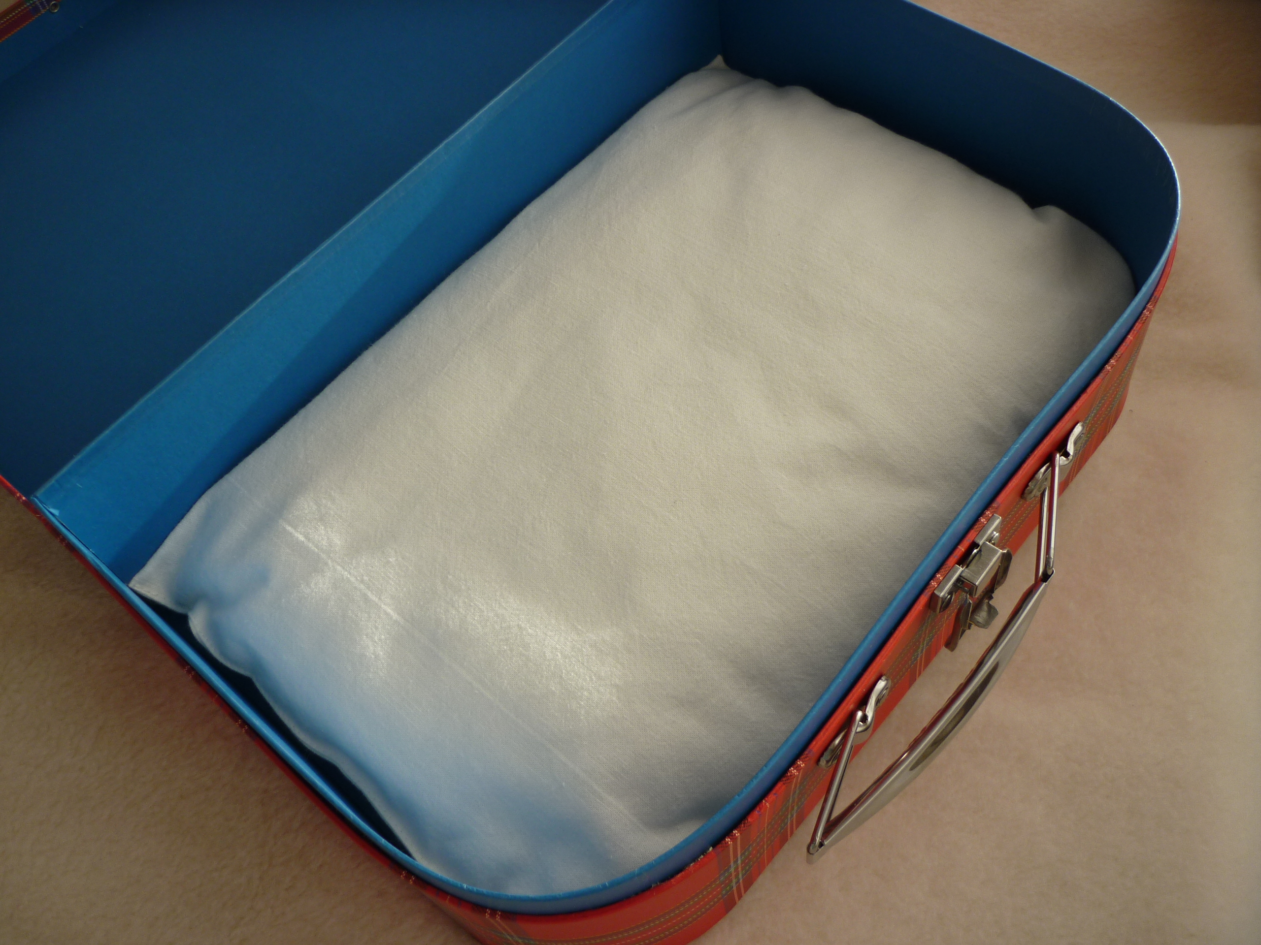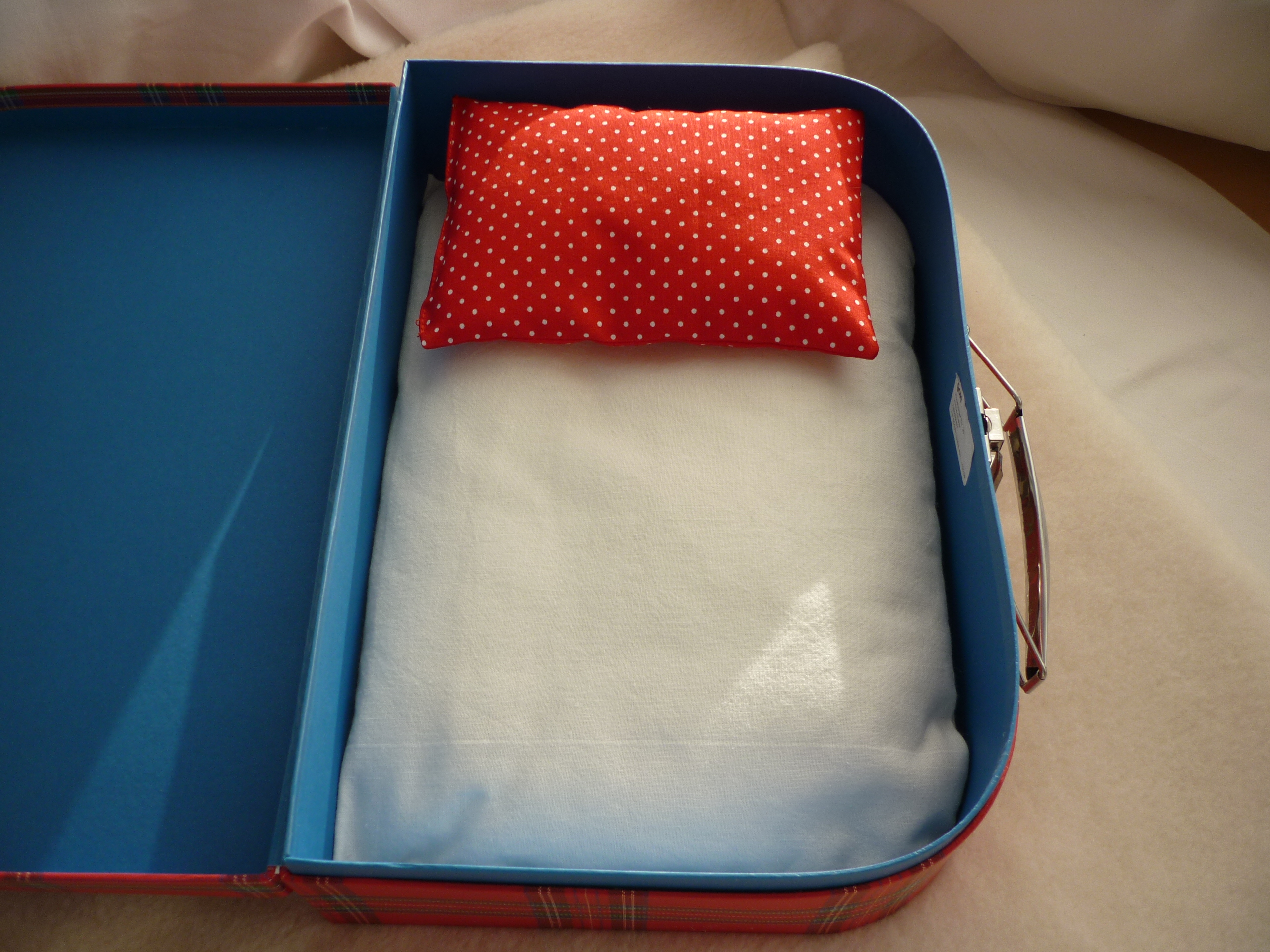 Hübscher Kinderkoffer. Puppenkoffer mit Bettwäsche, Puppenbett.