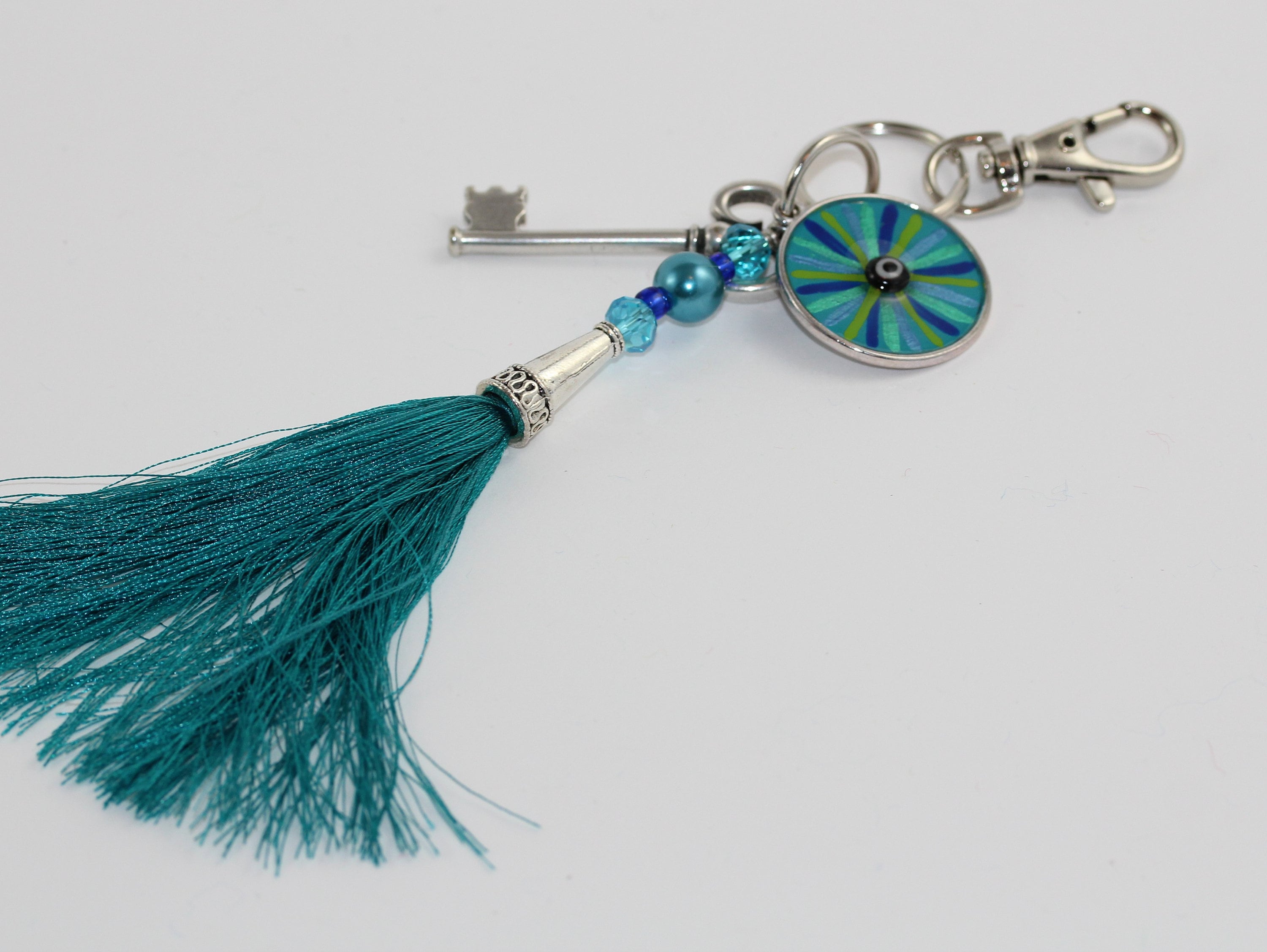 Das Material ist antik silberfarbenes Metall, das Eye of Hilarion Glücksbringer Auge ist handgemalt und kunstharzversiegelt, die Quaste aus Seidengarn, geschmückt mit Glasperlen. Das Auge hat einen Durchmesser von cm, der Schlüssel misst 5 cm und der Anhänger hat eine Gesamtlänge von 16 cm.